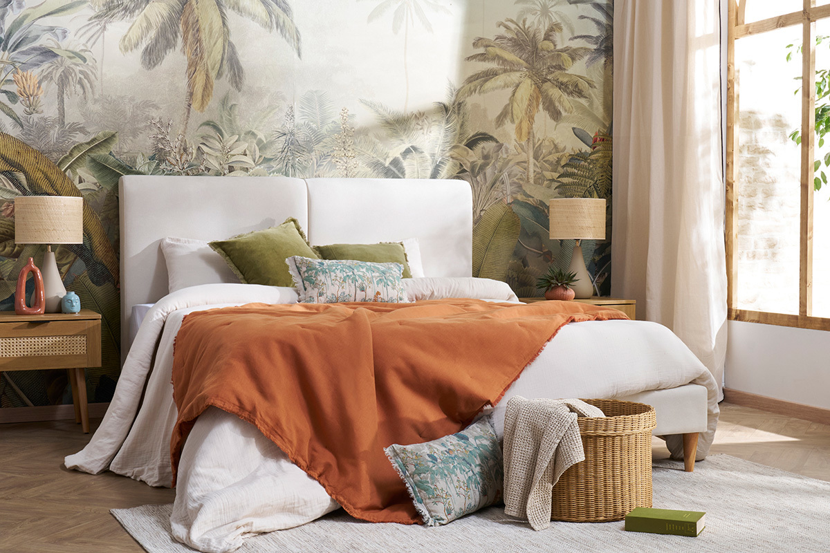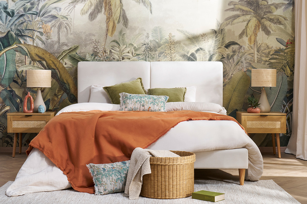 Des tables de chevet en chêne, des appliques murales en rabane et un tapis écru ne feront que sublimer ce grand lit 2 places 160x200 cm.