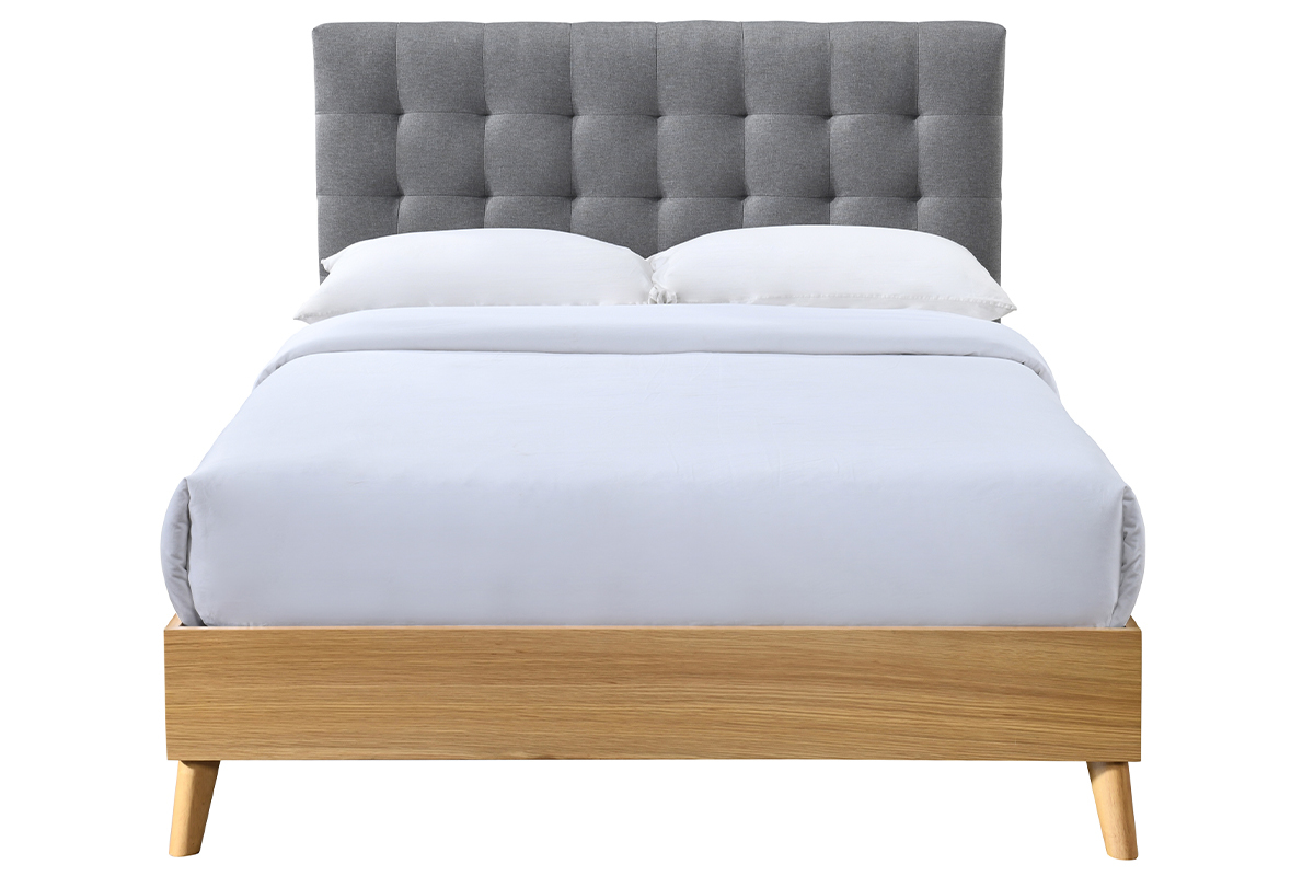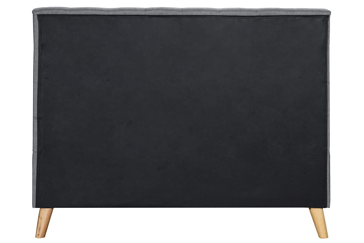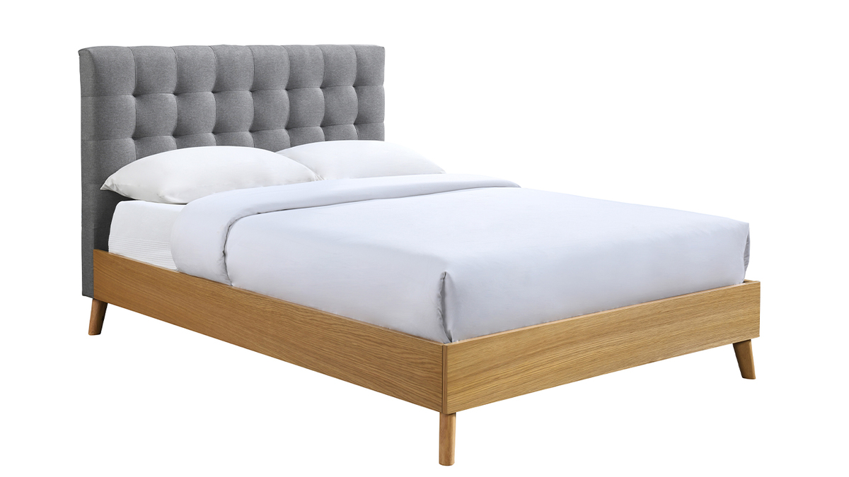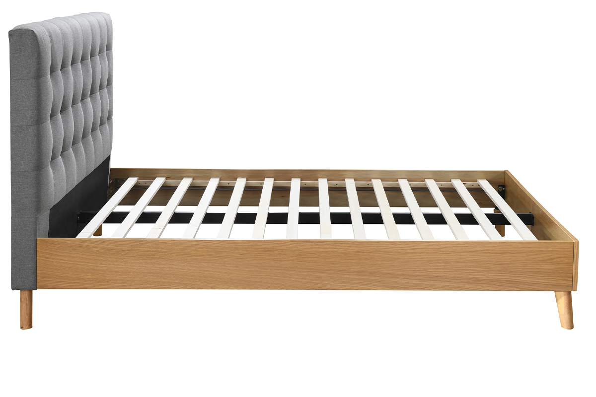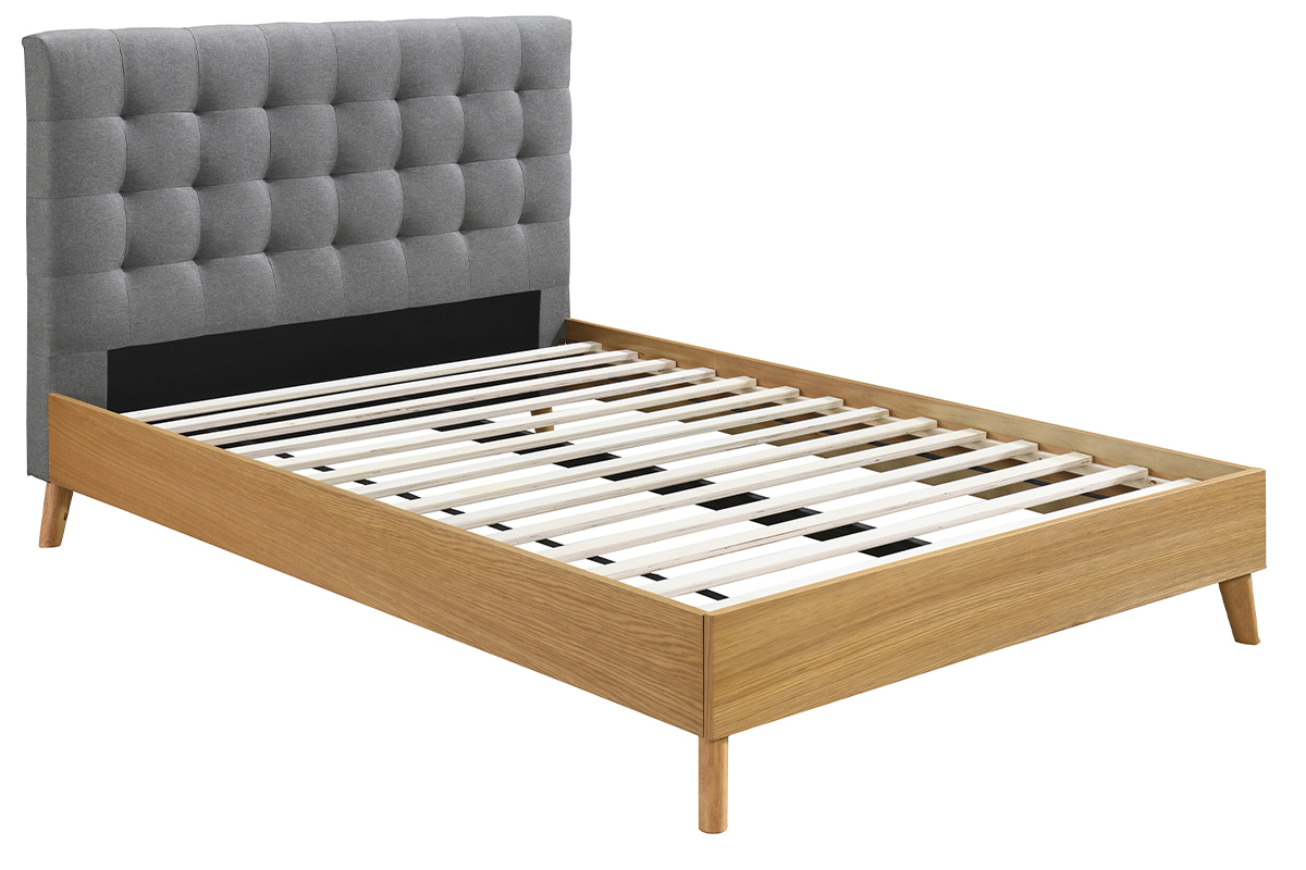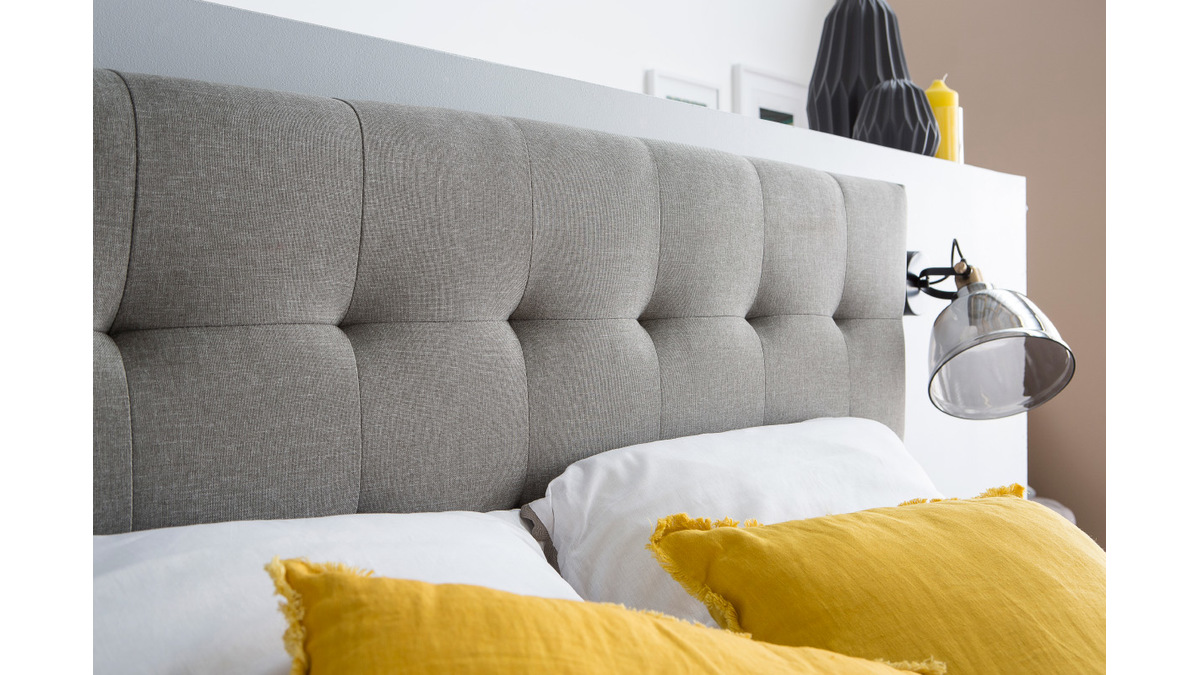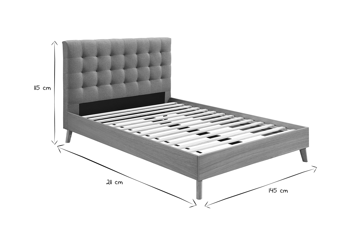Cadre en bois et tête de lit capitonnée en tissu gris (revêtement 100% polyester) forment un tandem élégant et intemporel. On imagine ce lit 2 places camper dans une chambre d'adulte aux couleurs neutres, où il créera une ambiance cosy à souhait....