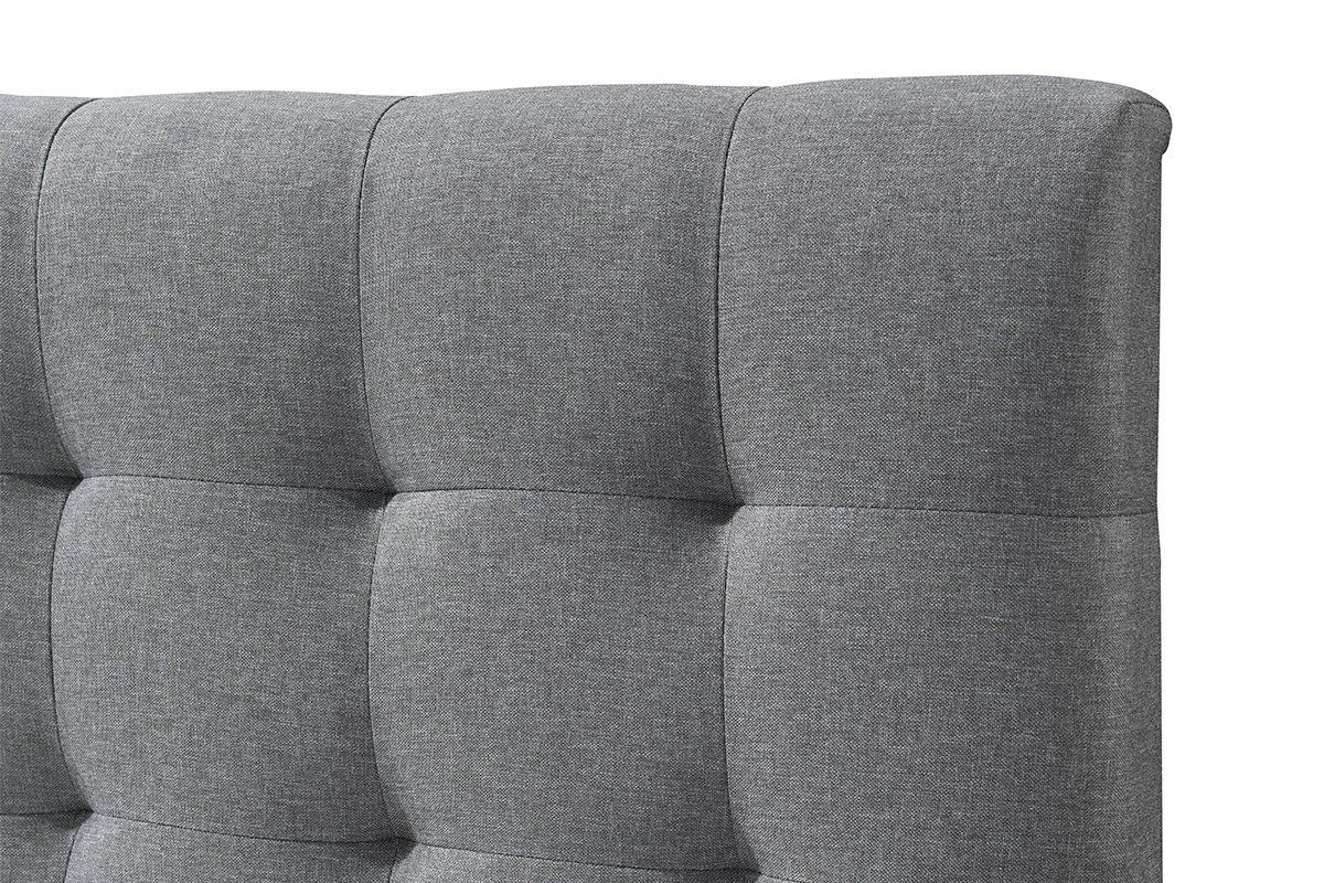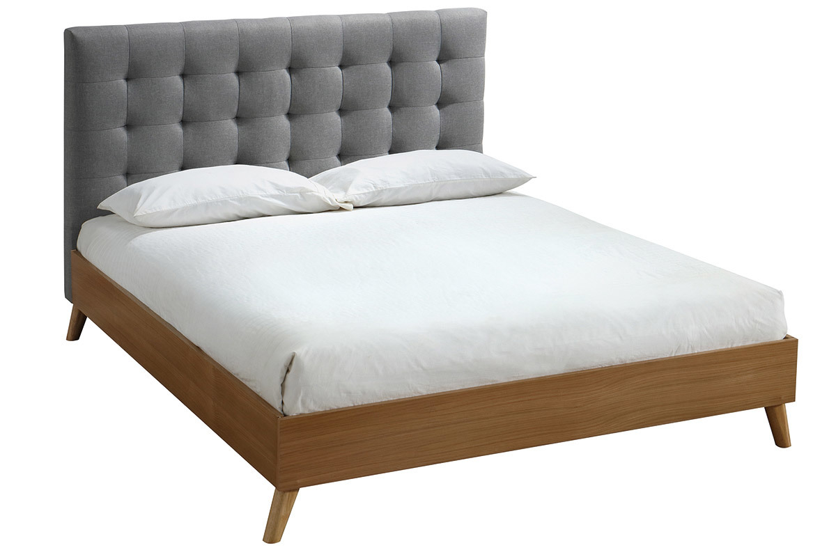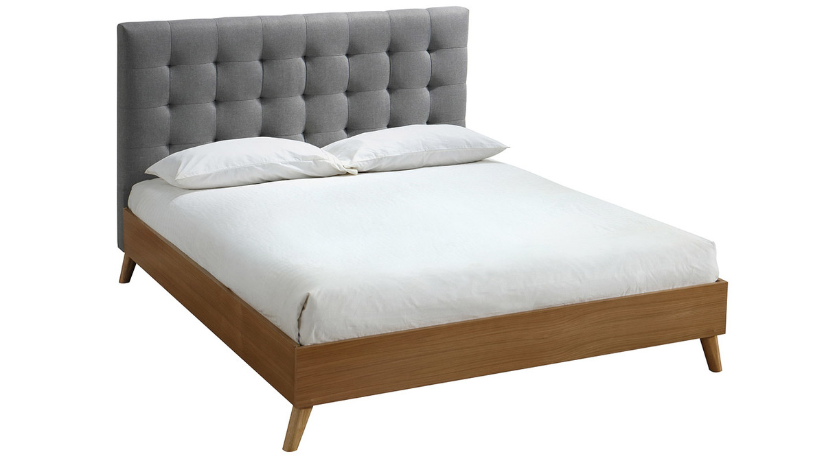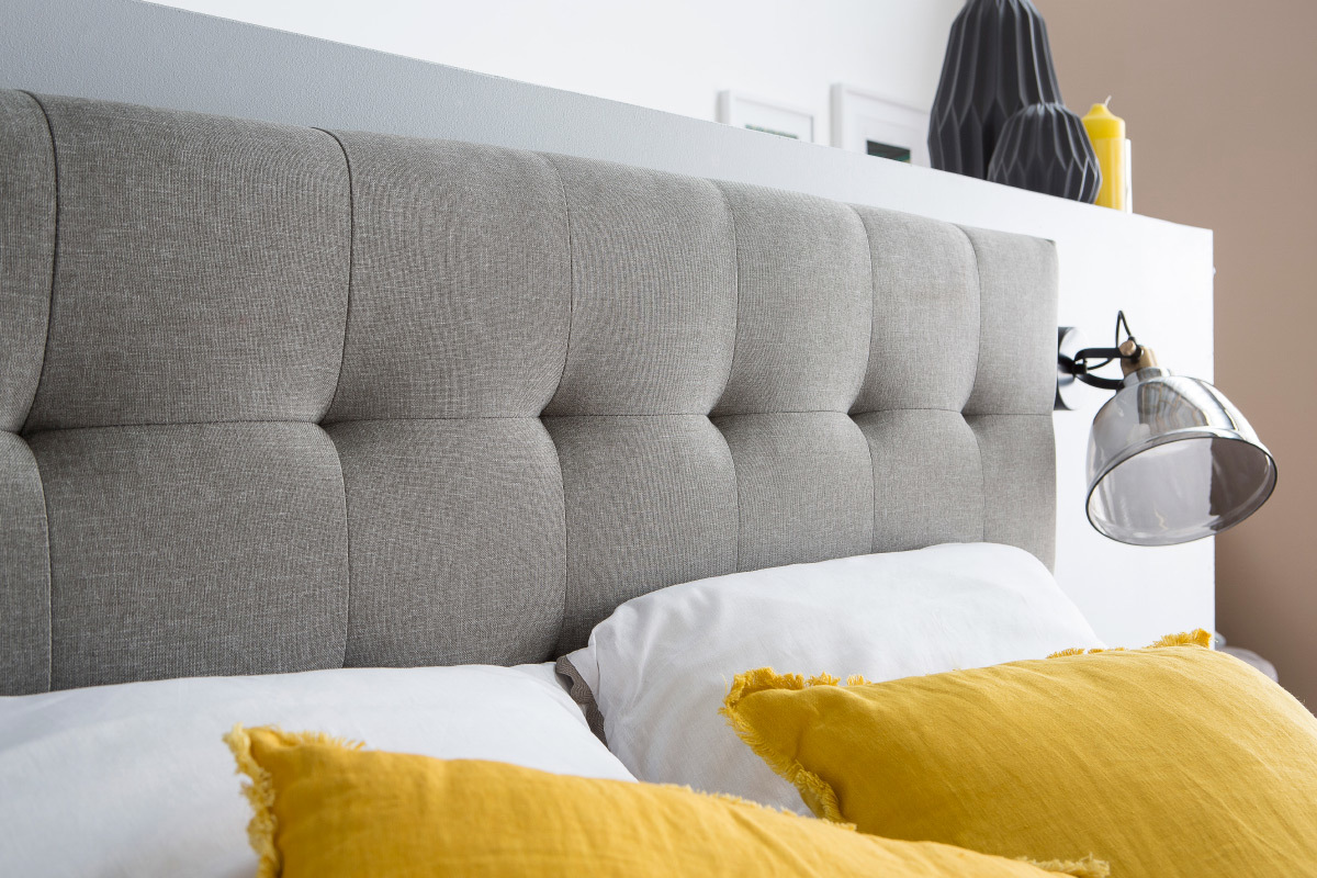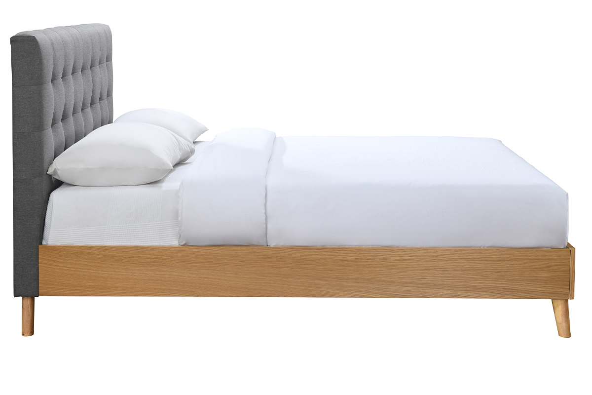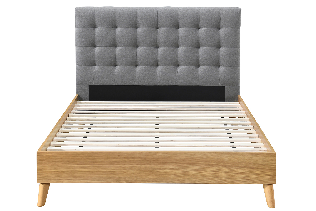 Cadre en bois et tête de lit capitonnée en tissu gris (revêtement 100% polyester) forment un tandem élégant et intemporel. On imagine ce lit 2 places camper dans une chambre d'adulte aux couleurs neutres, où il créera une ambiance cosy à souhait....