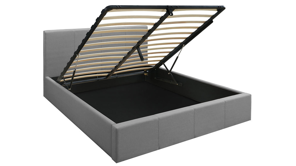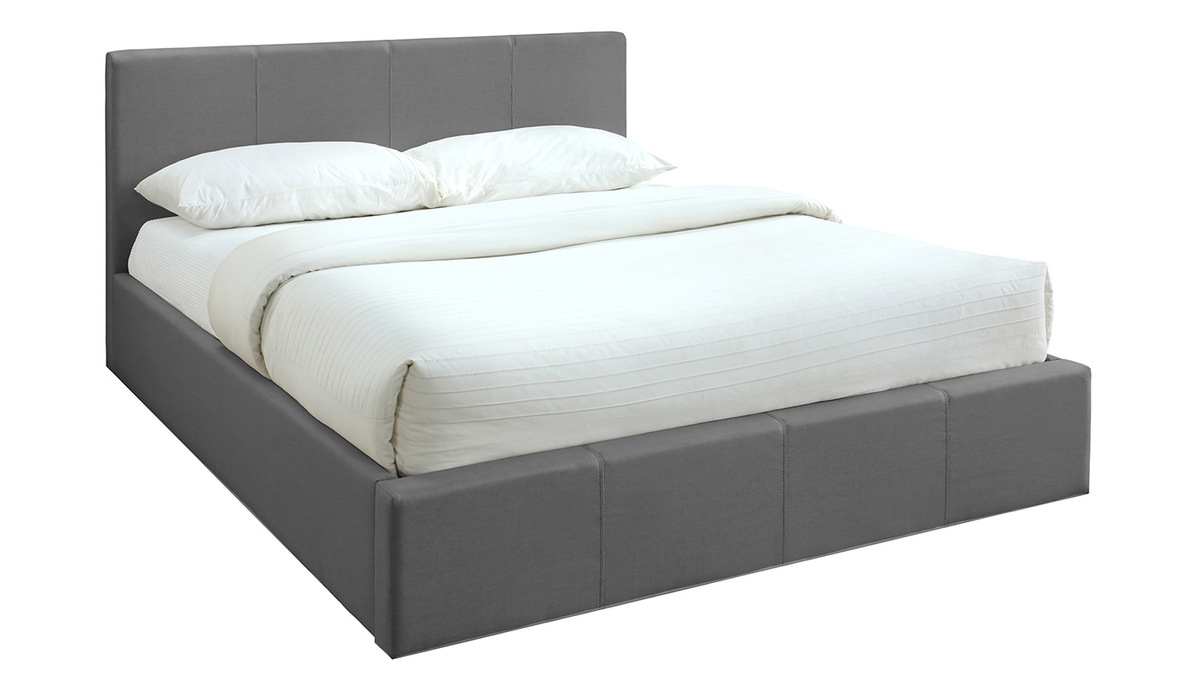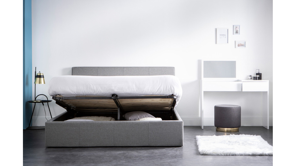 Le revêtement en tissu gris de ce lit avec rangement en fait un beau meuble contemporain qui s'intégrera parfaitement dans une chambre moderne ou d'inspiration scandinave. Pour donner un esprit nordique à votre coin nuit, accompagnez le lit APOLLON de la table de chevet blanche et bois HELIA.