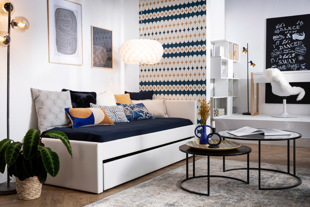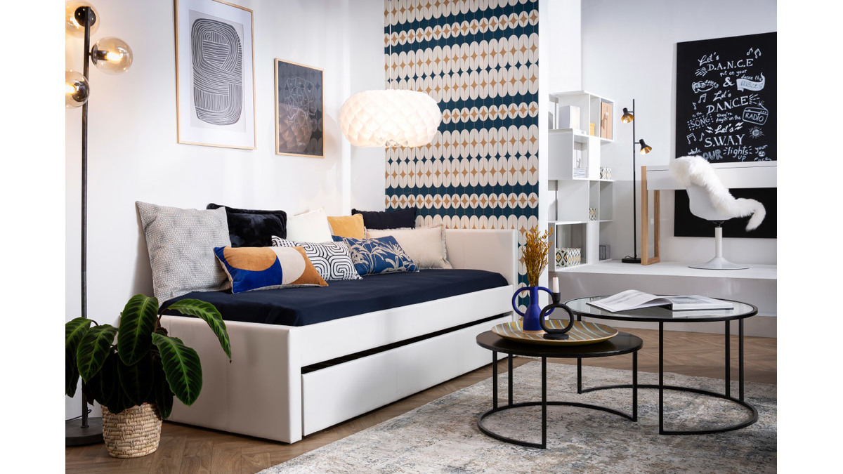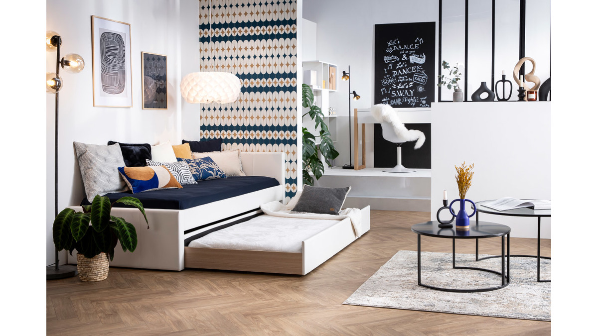 Décoré de coussins et plaids, on l'envisage dans un bureau pour former une élégante banquette le jour et un confortable lit simple avec tête de lit en soirée. Lit enfant ou lit adulte 1 place, avec ses dimensions couchage L90 x L190 cm - une fois équipé d'un matelas - MACCO optimisera l'espace autant dans une chambre d'enfant que dans une chambre d'amis. Pour gagner de la place au sol, préférez des tables de chevet murales ou des luminaires appliques. Gain de place garanti dans l'espace nuit !