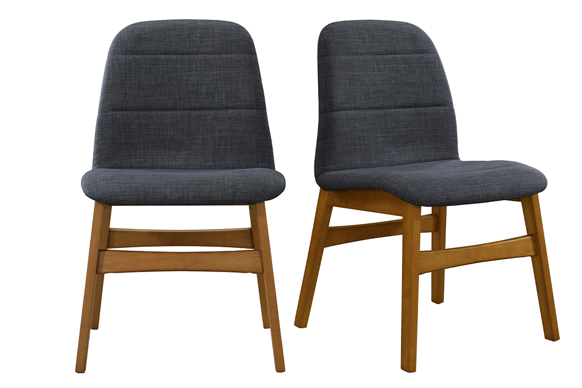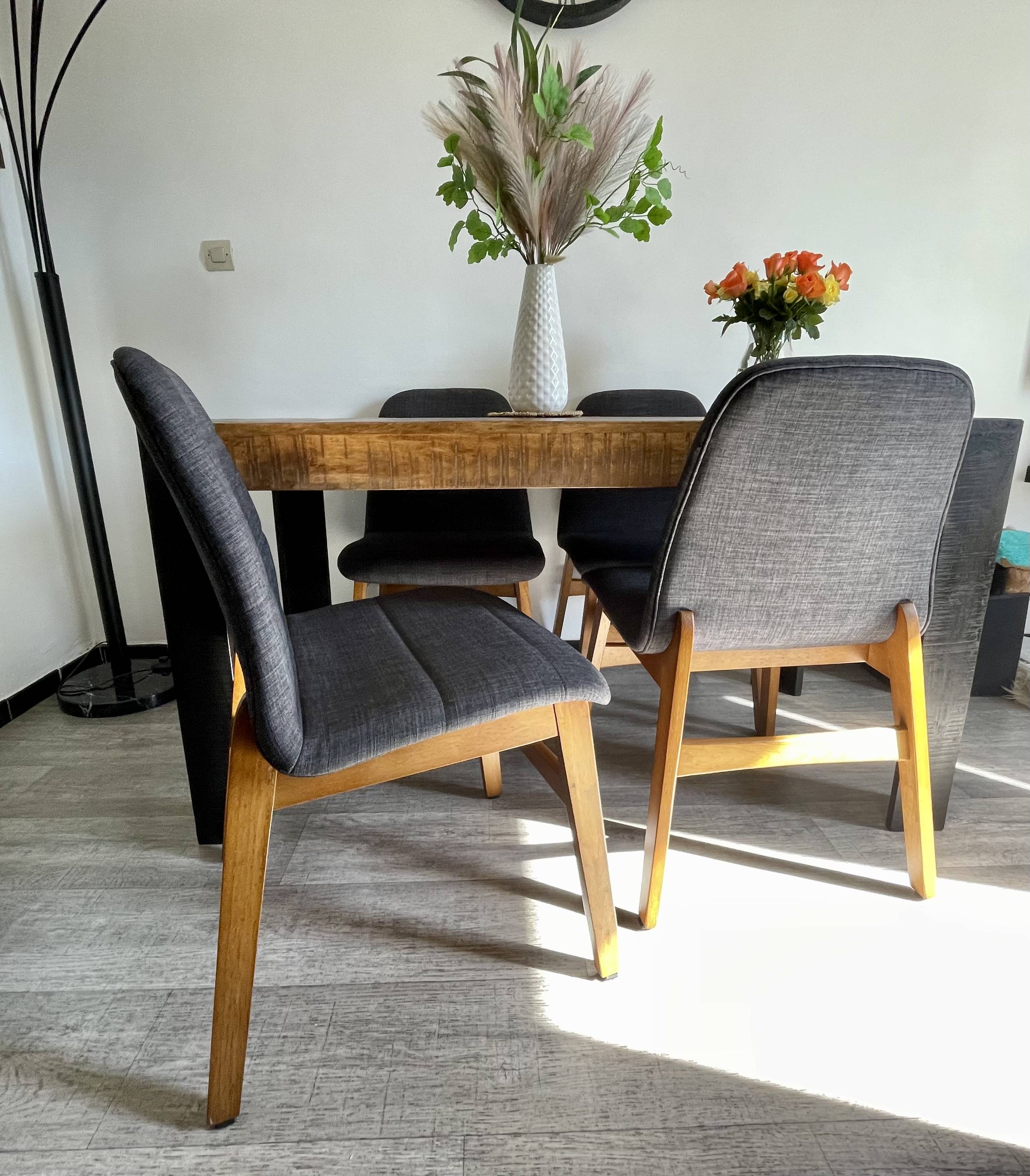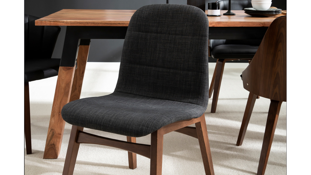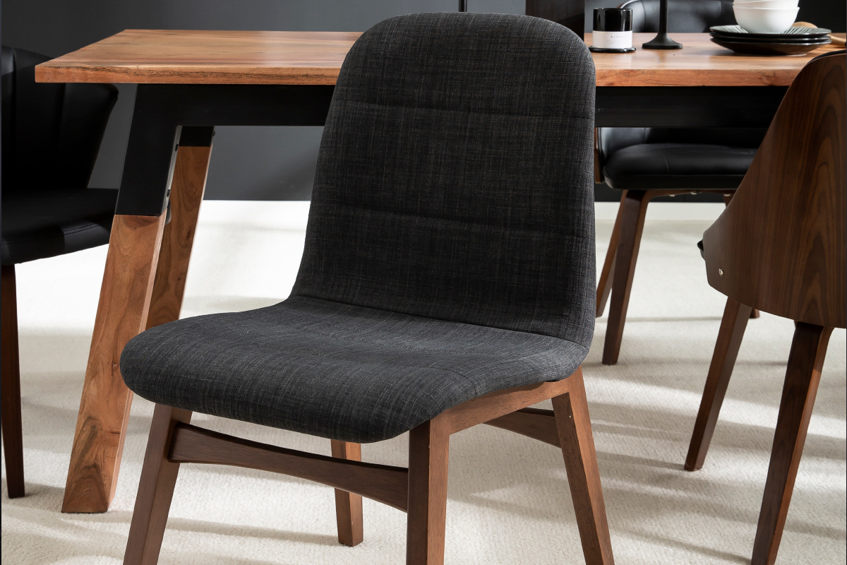 Ces chaises grises et bois foncé séduisent par l'accord parfait des deux matières : dossier et l'assise se pârent d'un tissu au toucher agréable et réconfortant, un piètement en bois frêne massif teinté noyer.