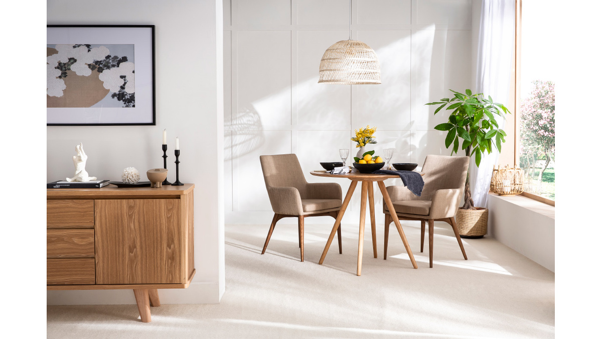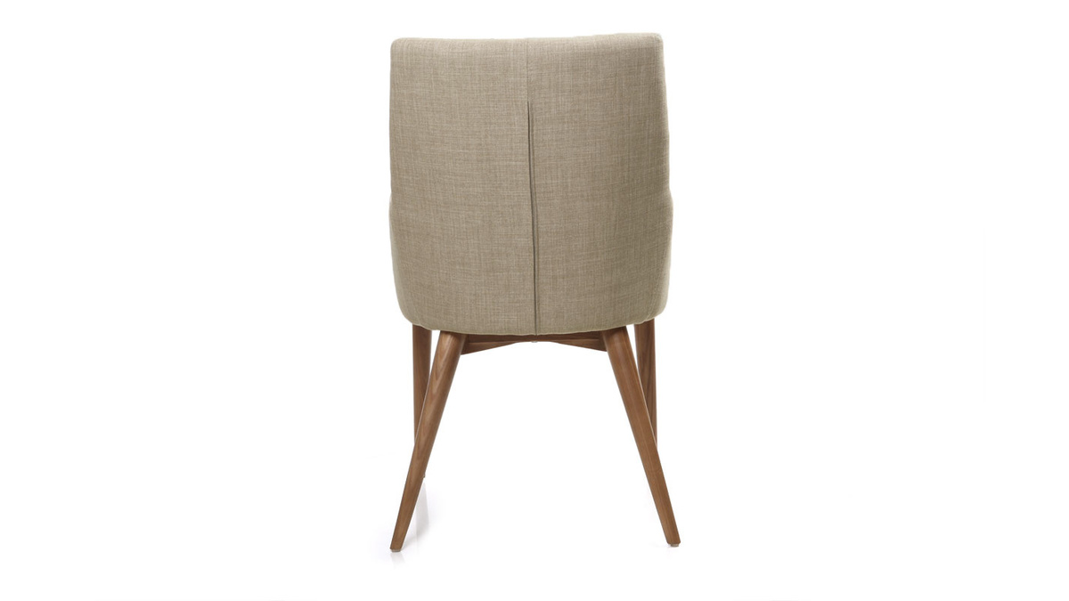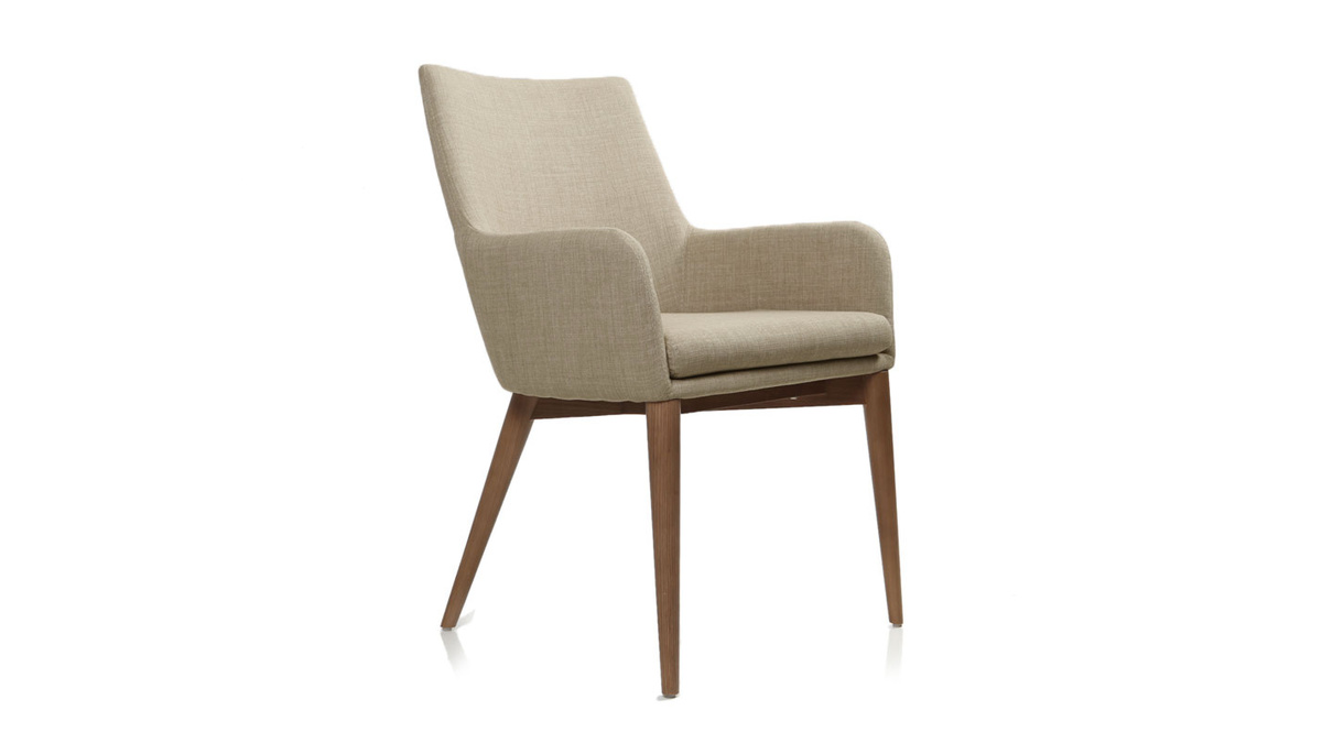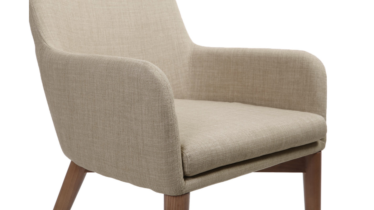 Siège confortable aux lignes pures, accoudoirs arrondis, revêtement en tissu beige (100% polyester) très résistant et agréable au toucher, coussin d'assise amovible, pieds en bois massif teinté noyer, ce modèle de chaise fauteuil beige séduit par son design indémodable.