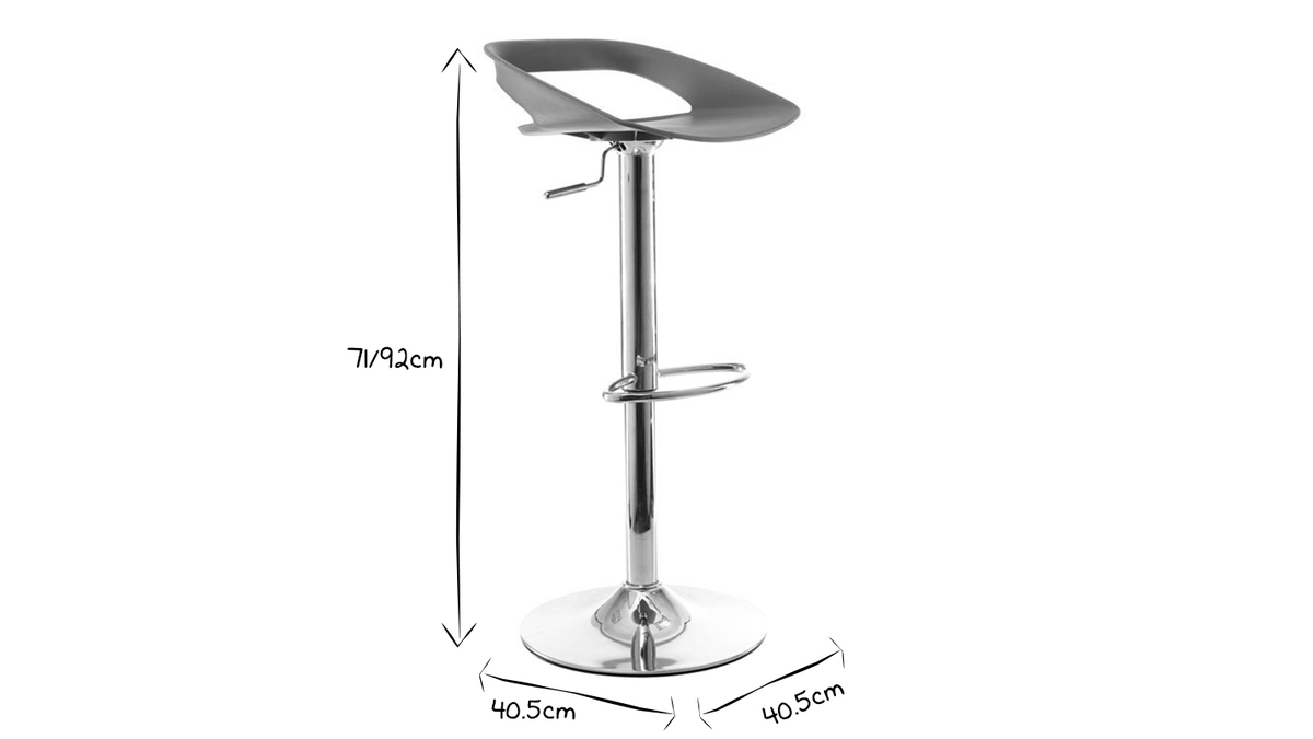 Assise réglable en hauteur de 60 cm à 80 cm par vérin pneumatique grâce à une manette en métal sans palier. Rotation 360°.