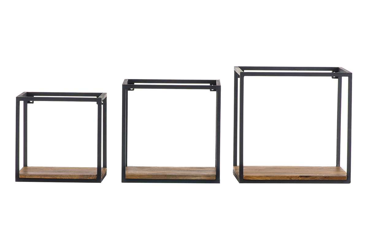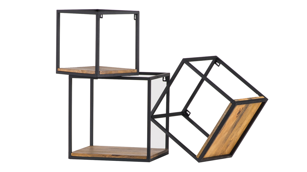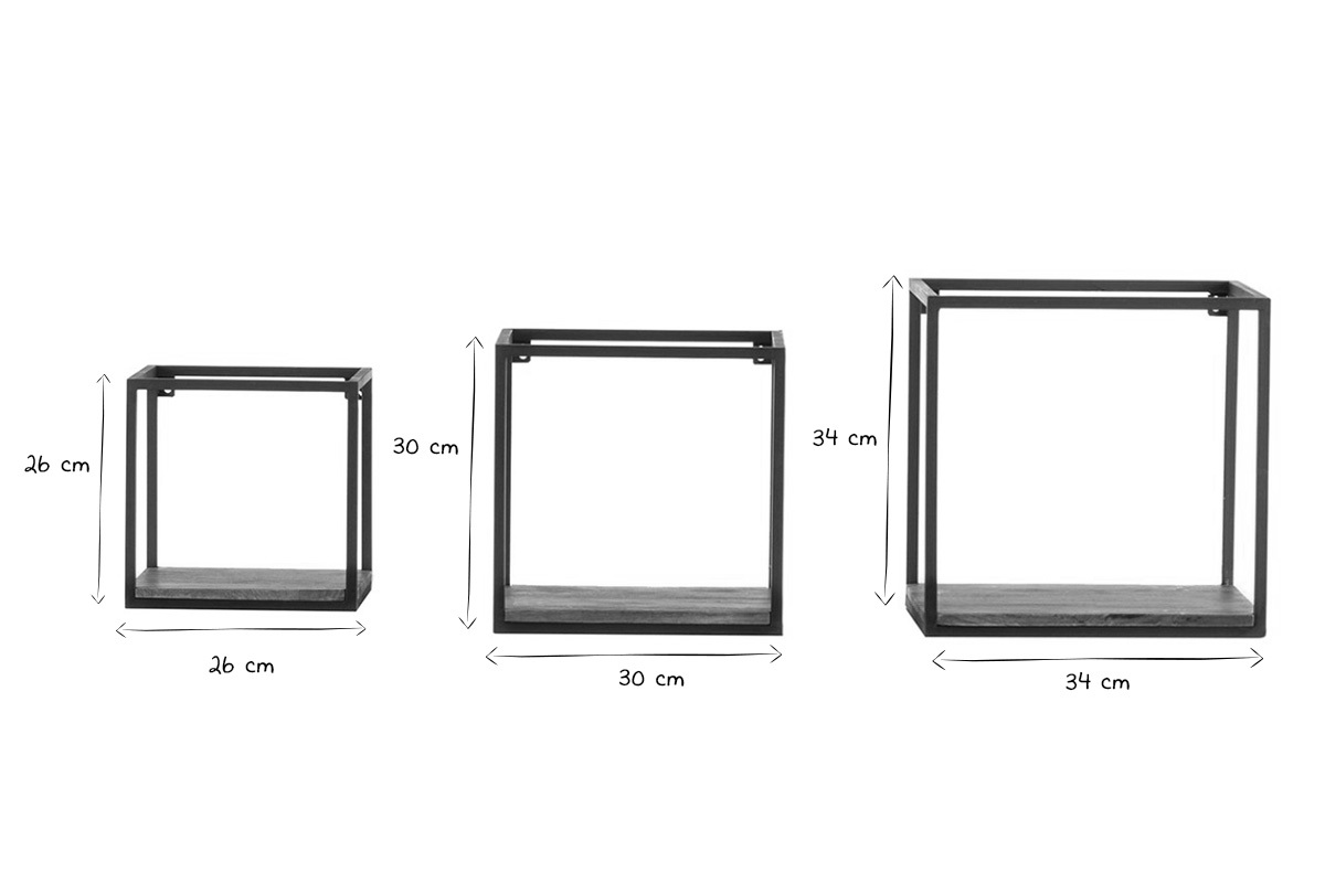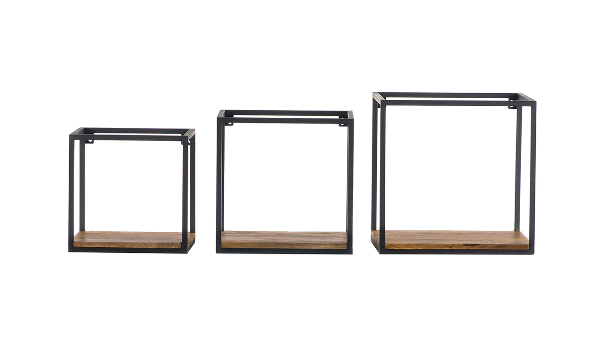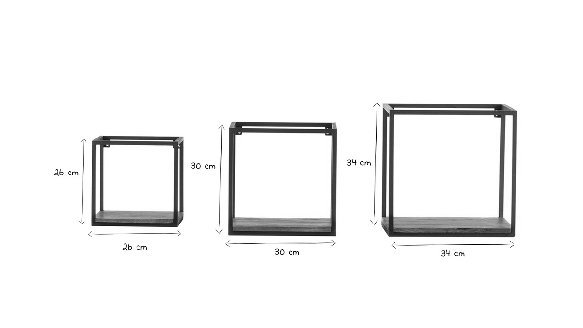 Ces 3 petites étagères carrées (dimensions étagère 1 : L26 x L22 x H26 cm - dimensions étagère 2 : L30 x L26 x H30 cm - dimensions étagère 3 : L34 x L30 x H34 cm) possèdent des lignes droites et fines qui leur donnent de l'élégance et beaucoup de caractère. Composées de métal noir et de bois clair manguier massif, ces étagères inspirées de la tendance déco industrielle apporteront une petite touche d'authenticité à votre intérieur.