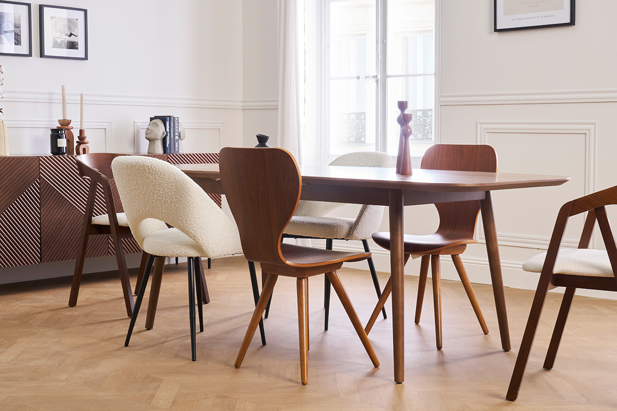Ces chaises de salle à manger en bois foncé sont des assises design au charme minimaliste. Un magnifique travail des courbes a donné naissance aux NORDECO, dont la beauté intemporelle se mariera à de nombreuses ambiances et s'accordera parfaitement à tous les styles de tables de salle à manger.