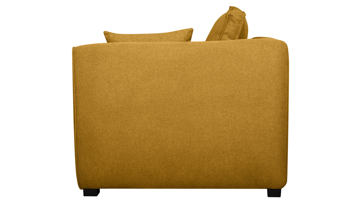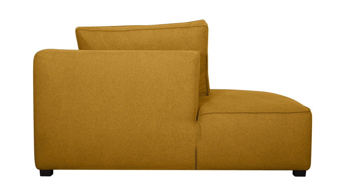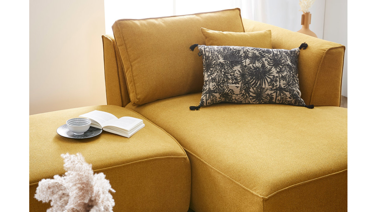 Prolongation de votre canapé ou assise supplémentaire dans votre salon, selon le nombre de m² disponibles avec son look dans l'air du temps et son revêtement en tissu jaune cumin, cette grande méridienne angle gauche aux dimensions L106 x L168 x H75 cm trouvera facilement sa place dans des ambiances déco scandinave ou contemporaine.