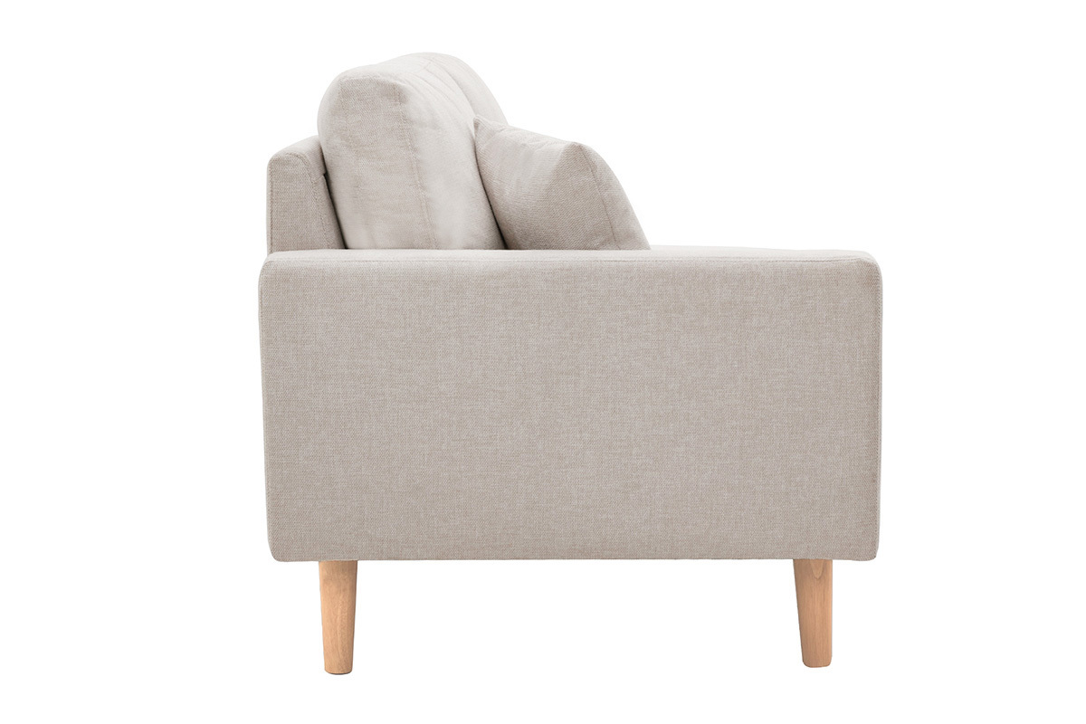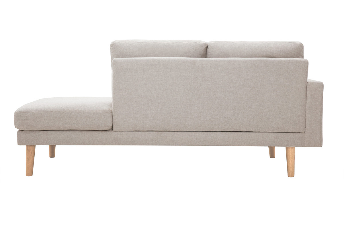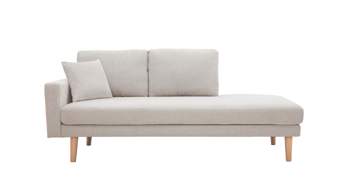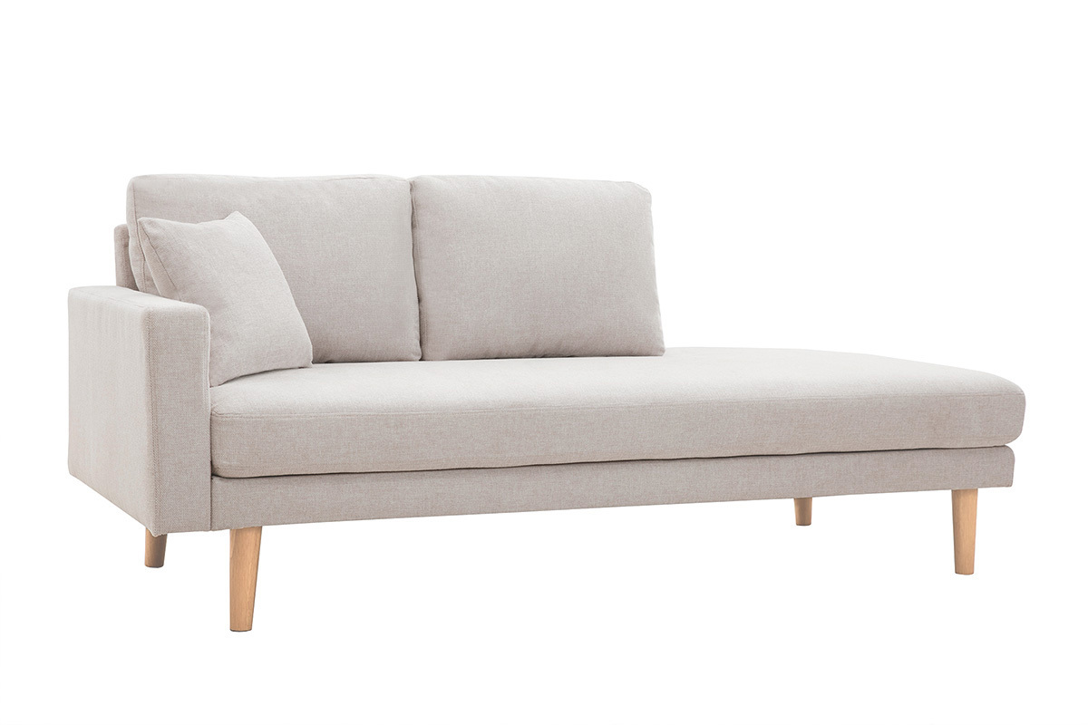 Méridienne scandinave en tissu effet velours texturé beige et bois clair massif L190 cm livrée prête à monter. Montage simple seul le piètement est à fixer. Le colis étant volumineux, nous vous conseillons de vérifier que portes et escaliers permettent son passage.