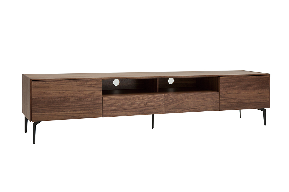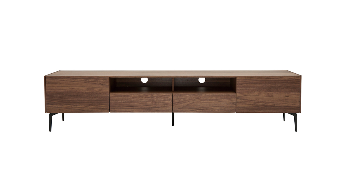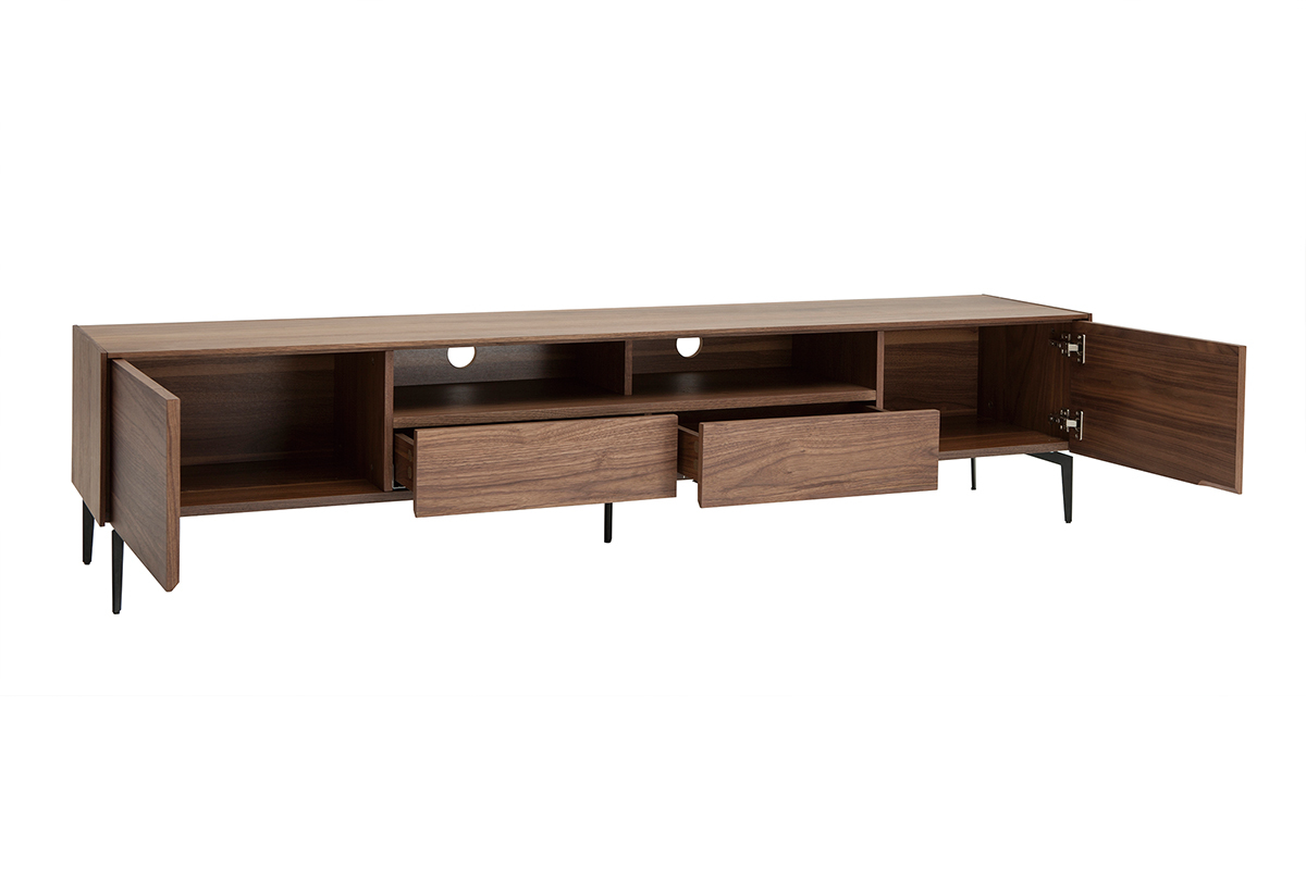Meuble TV design bois foncé noyer et métal noir 2 portes 2 tiroirs L200 cm BLISS livré prêt à assembler.