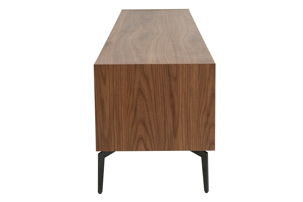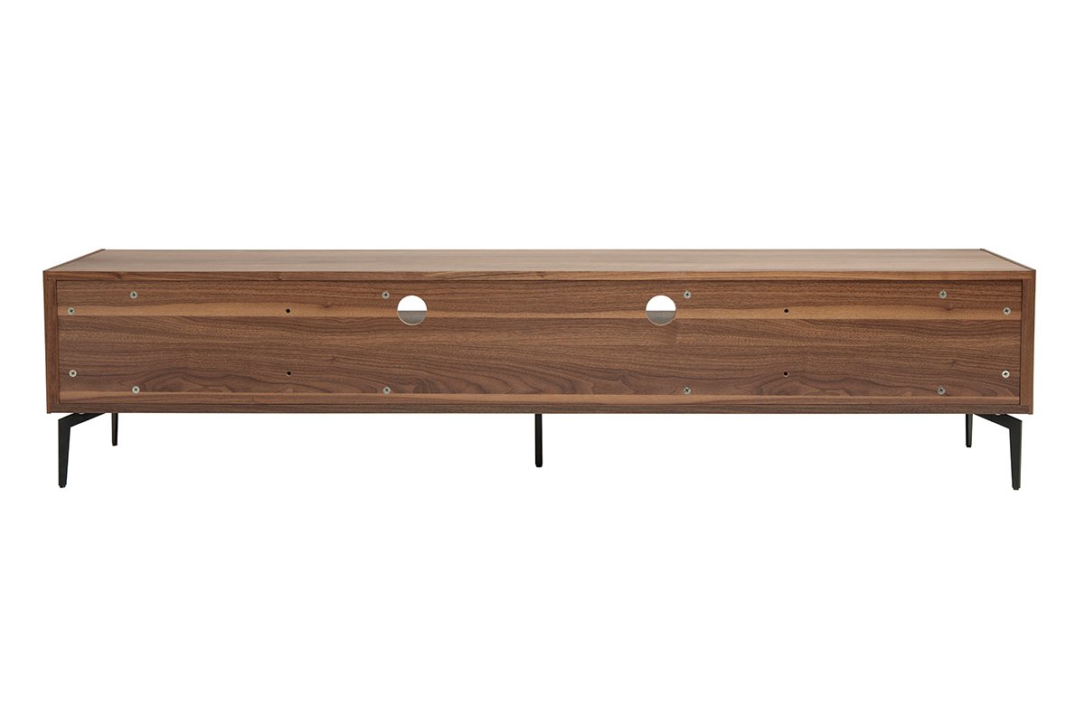 Ce meuble TV réunit dans une parfaite harmonie la chaleur du bois et le caractère du métal. Sa structure en panneaux de fibres de bois replaqués noyer est soutenue par un piètement métallique ultra fin et moderne (H15 cm). La laque transparente apposée sur la structure protège le bois sans modifier son aspect. On ne se lasse pas d'admirer les reflets chauds du noyer, ses multiples noeuds et ses veines marquées.