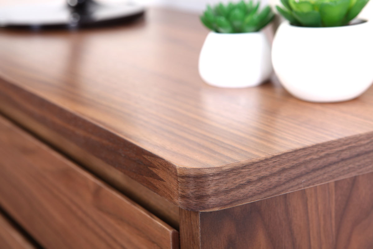 Matière : structure en panneaux de fibres de bois placage noyer ; tiroirs en mélaminé ; pieds en bouleau massif