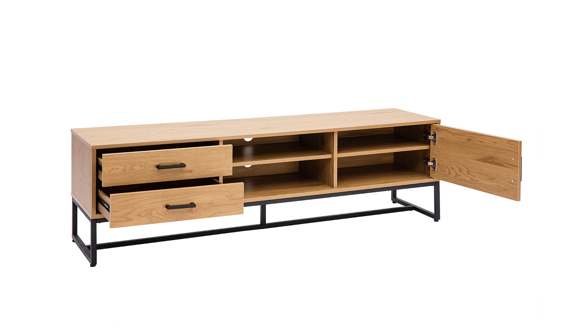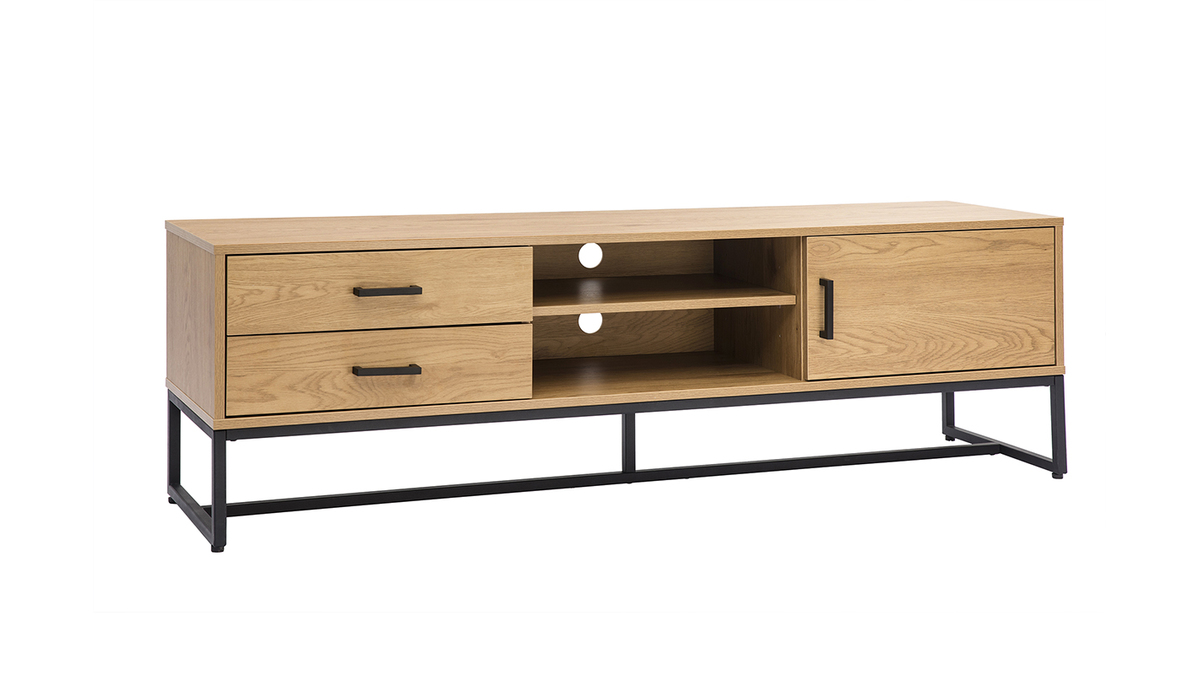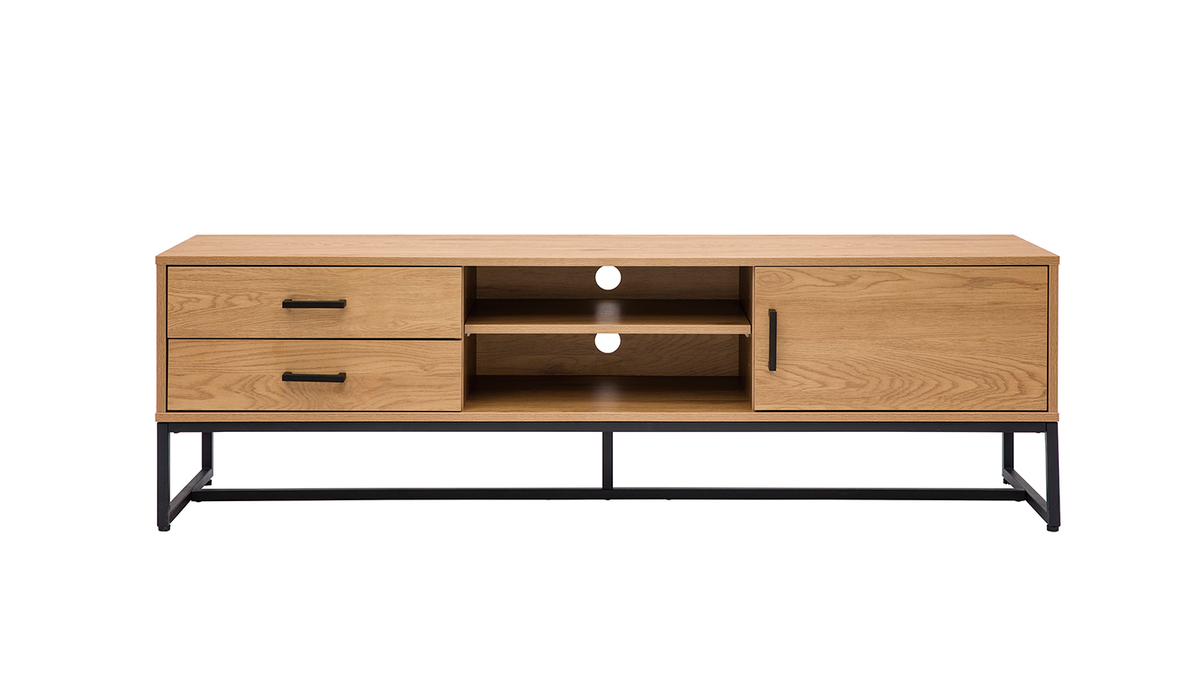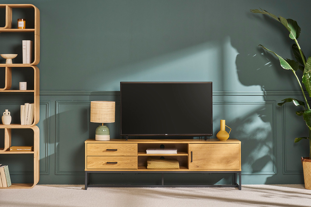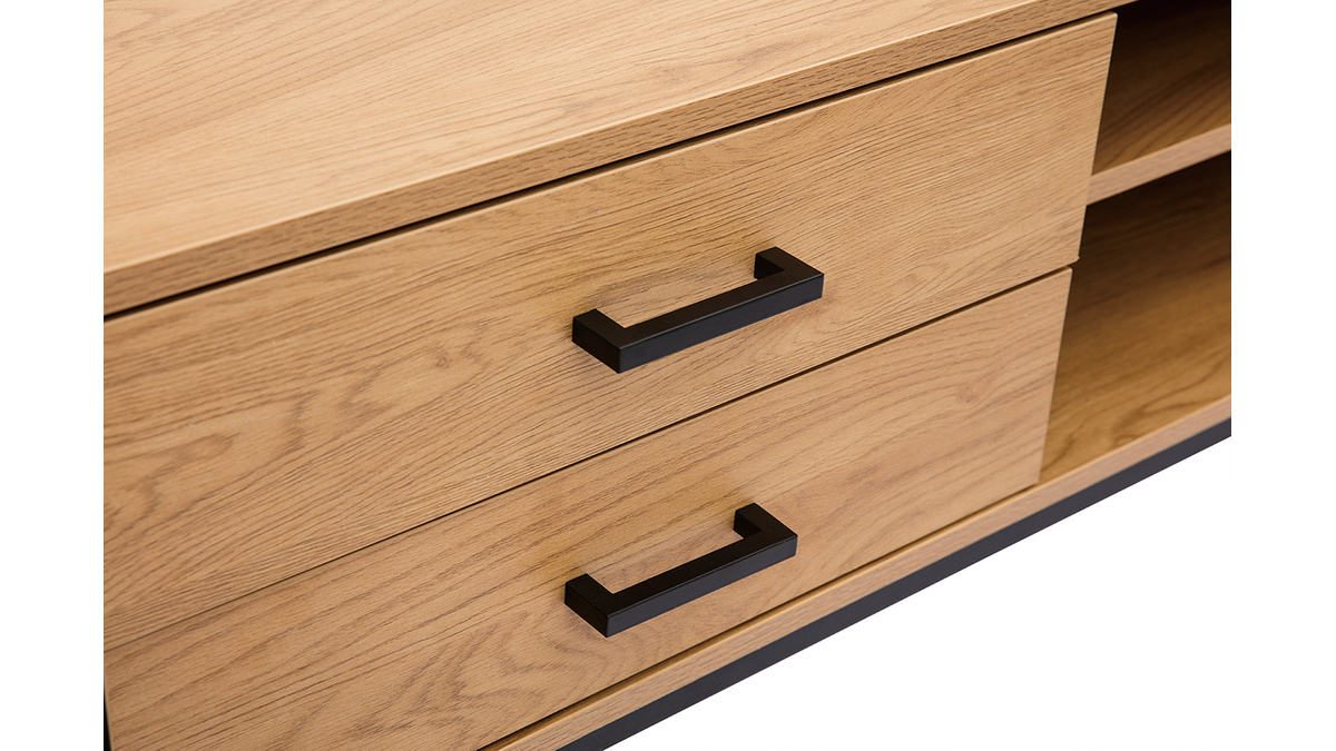 Peu profond mais résolument pratique, le meuble TV LOVATO (L160 x P43 x H50 cm) est doté de nombreux rangements. Les deux tiroirs permettent de dissimuler tous les accessoires high-tech et les petits objets du quotidien qui envahissent l'espace salon. Les deux grandes niches ouvertes accueilleront les box TV et consoles de jeux sans risque de surchauffe.