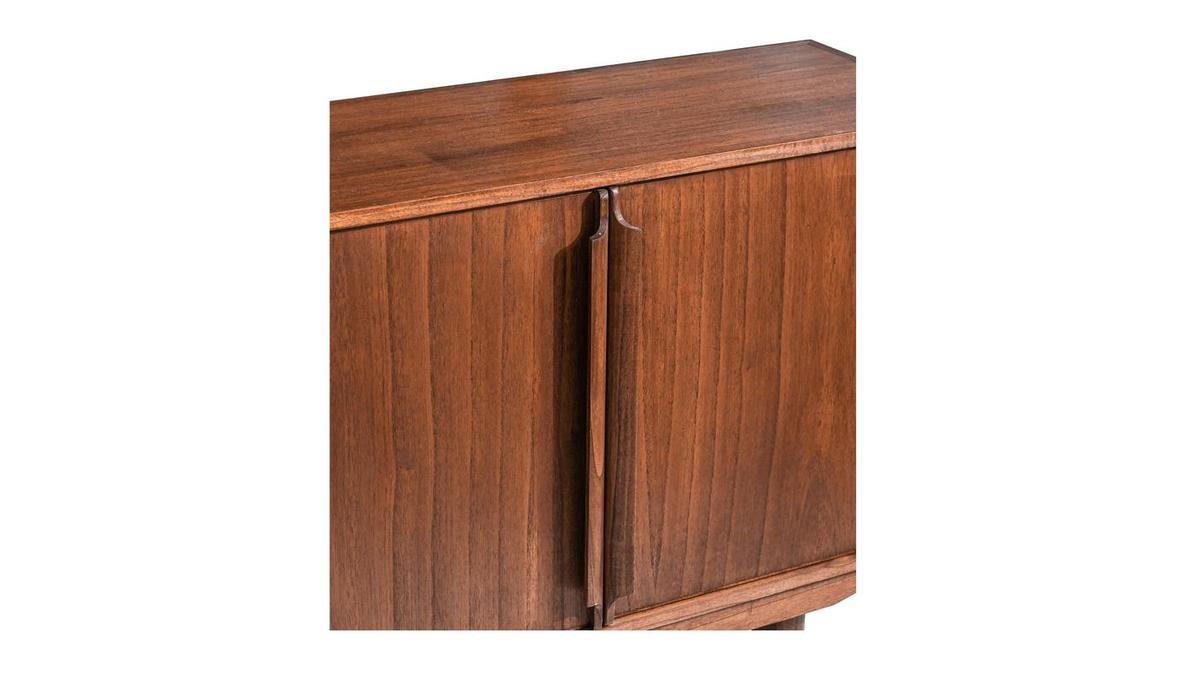 Avec ses pieds fuselés et ses larges poignées en bois courbé, cette création contemporaine nous plonge dans l'univers vintage des années 50/60. Ses lignes essentielles mettent en valeur le joli travail du bois.