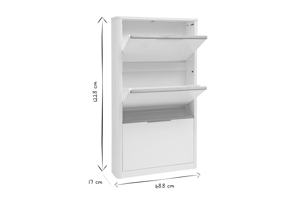 Le meuble à chaussures blanc laqué KIRK se distingue par son design minimaliste et contemporain, parfait pour optimiser le rangement dans une entrée ou un couloir étroit. Avec ses dimensions compactes de L68.8 x P17 x H122.8 cm, il offre une solution astucieuse pour organiser les chaussures sans encombrer l’espace.