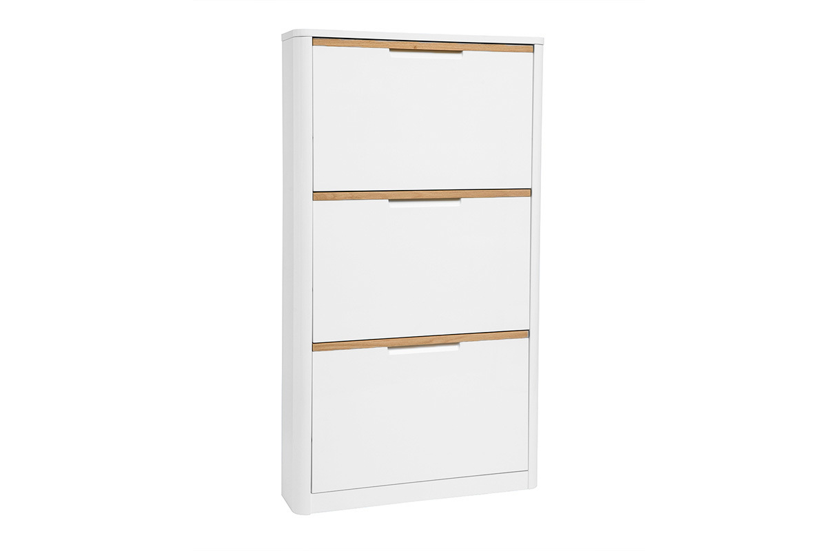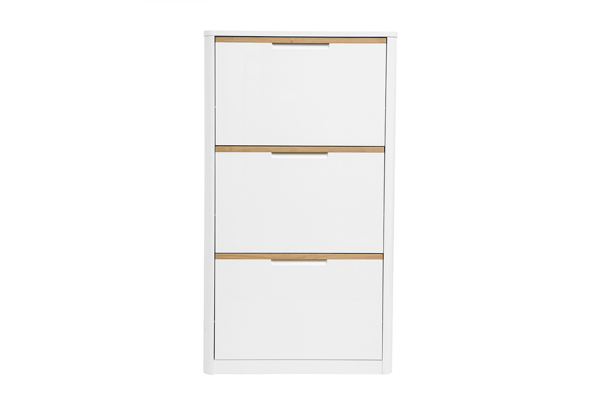 Ce meuble d’entrée séduit par sa finition blanc laqué brillante qui reflète subtilement la lumière, contribuant à une atmosphère lumineuse et épurée. Les lignes épurées sont rehaussées par des touches en bois clair naturel intégrées à chaque poignée, ajoutant une note chaleureuse et scandinave au design global. Ce contraste subtil entre le blanc laqué et les éléments boisés crée une esthétique équilibrée et raffinée.