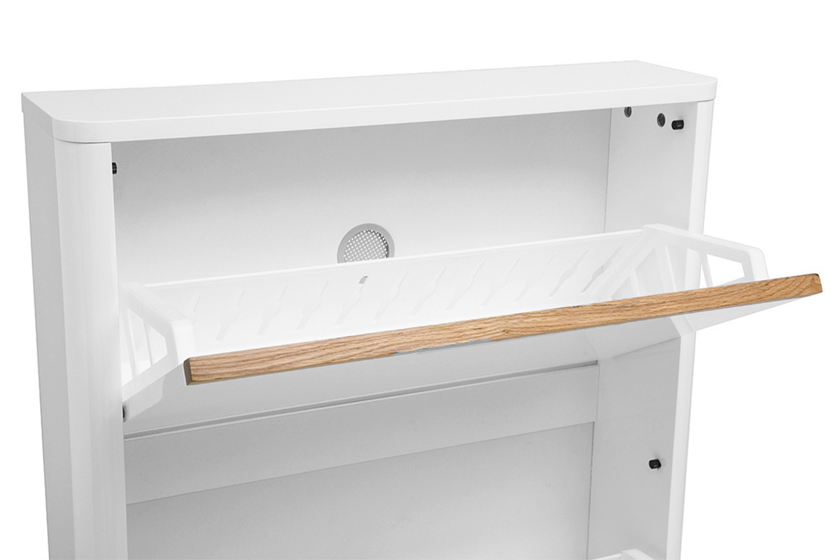 Doté de trois abattants à ouverture inclinée, le meuble à chaussures KIRK peut accueillir vos paires de chaussures, réparties sur des compartiments plastiques intégrés. Ces compartiments sont conçus pour maintenir les chaussures bien en place tout en facilitant l’aération grâce à un petit système de ventilation discret intégré à l’arrière de chaque compartiment. Cette fonctionnalité améliore l’hygiène intérieure en limitant les mauvaises odeurs.