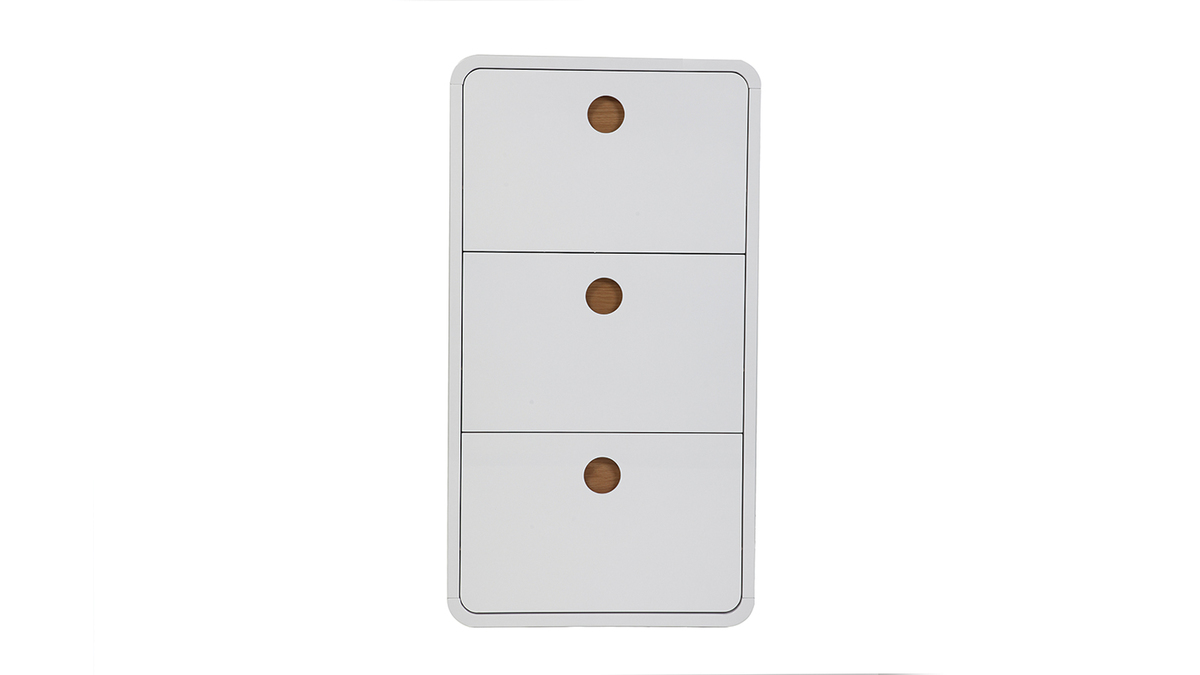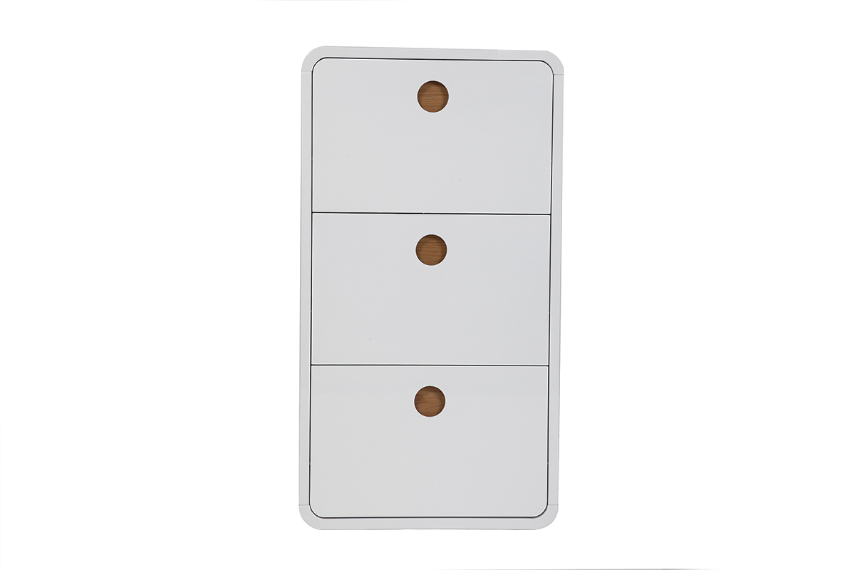 En panneaux de fibres de bois, il bénéficie d'une finition blanc brillant à laquelle s'ajoute une poignée circulaire en frêne. L'association des deux s'avère un succès. Facile à vivre, ce meuble se pose sur le sol et pour assurer un meilleur maintien, ce meuble doit être fixé au mur à l'aide d'une attache métallique fournie.