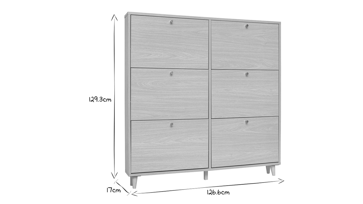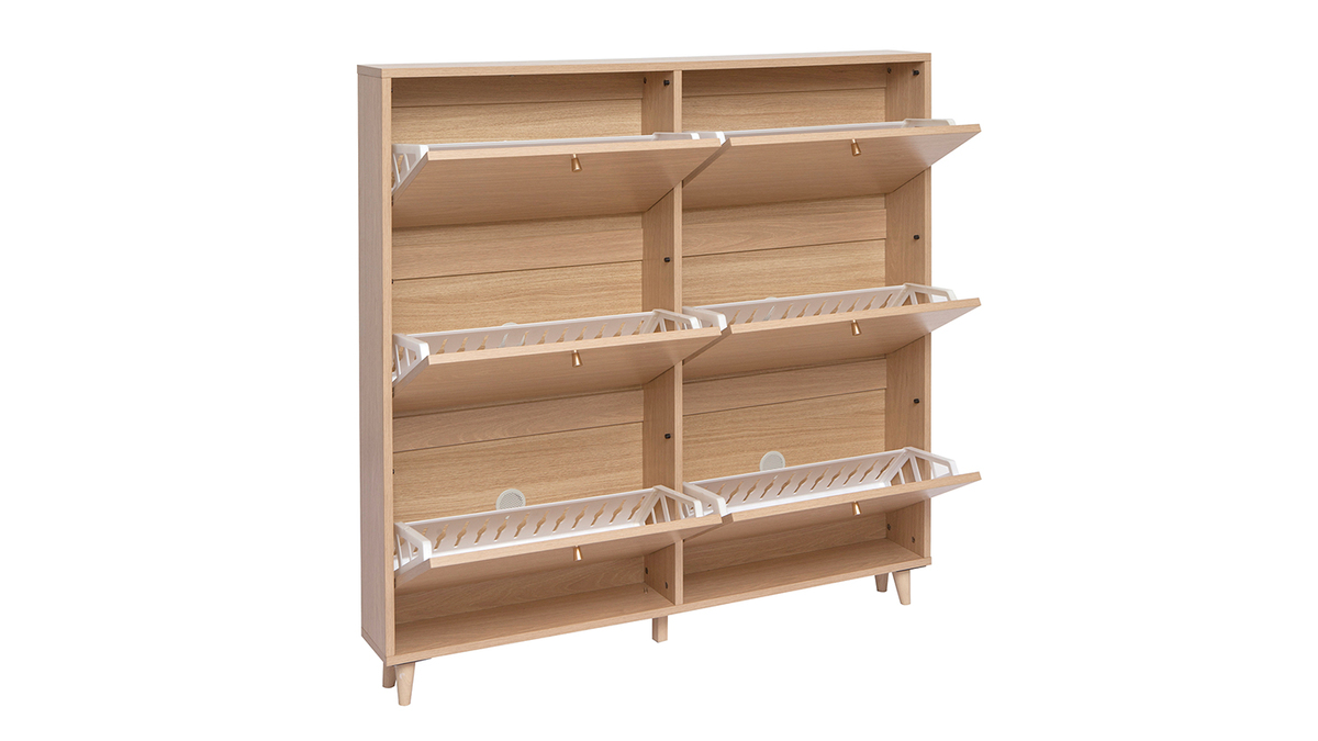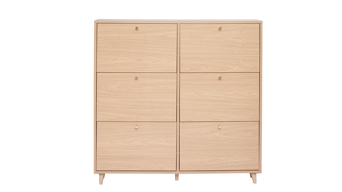 Conçu à partir de panneaux de fibres de bois mélaminé finition chêne clair et soutenu par un solide piètement en chêne massif, ce grand meuble à chaussures aux dimensions L126.6 x P17 x H129.3 cm se distingue par son naturel et son design en toute simplicité.