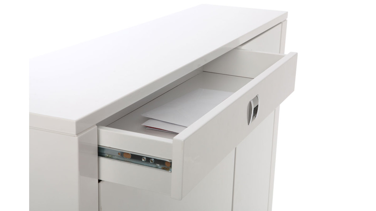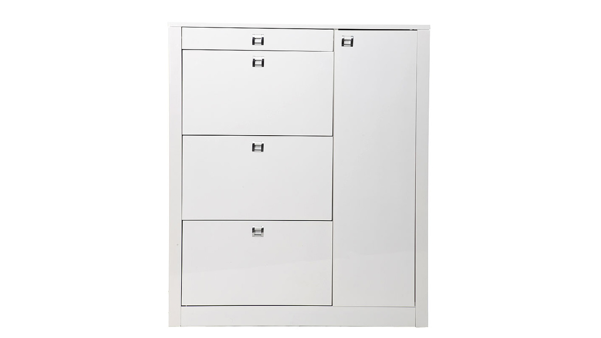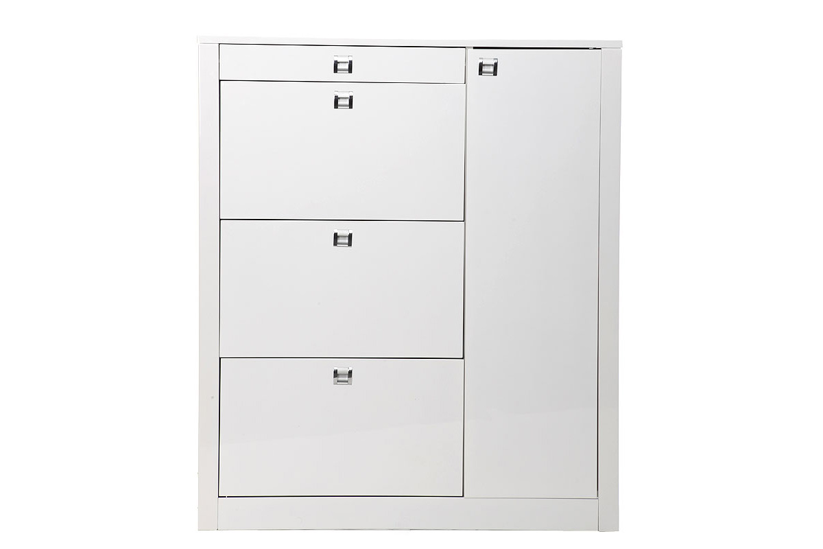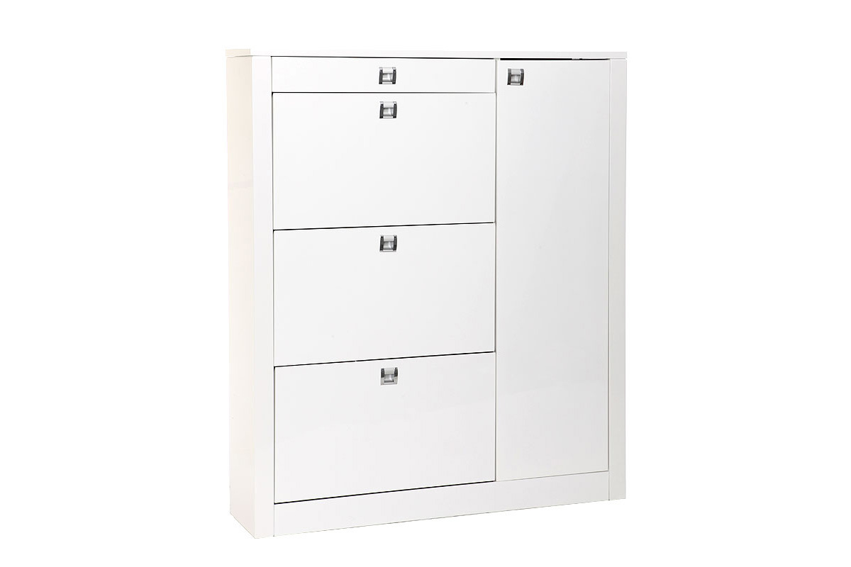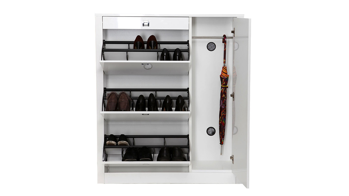 Ce meuble à chaussures blanc brillant est doté de 3 espaces de rangement pouvant chacun accueillir 6 paires de chaussures. Il possède également un tiroir qui servira aisément de vide-poche ainsi qu'un espace penderie permettant de ranger parapluies et écharpes en toute discrétion.