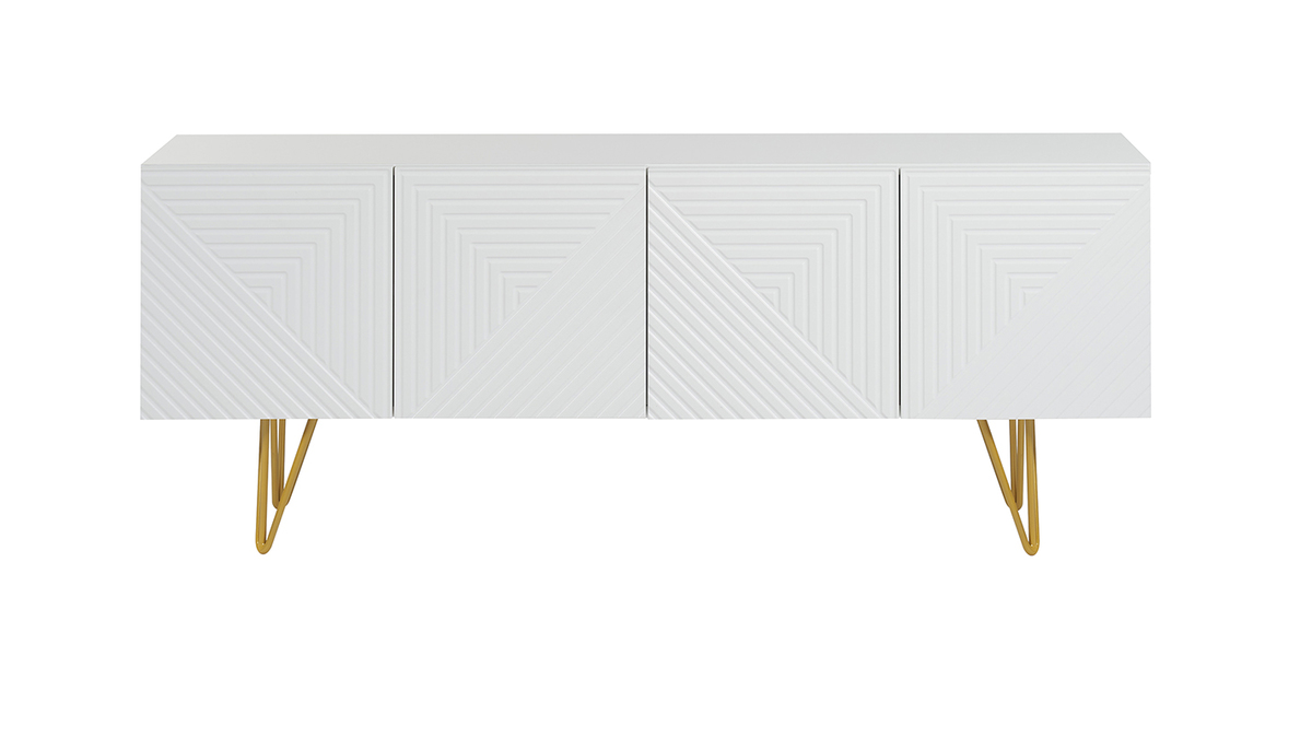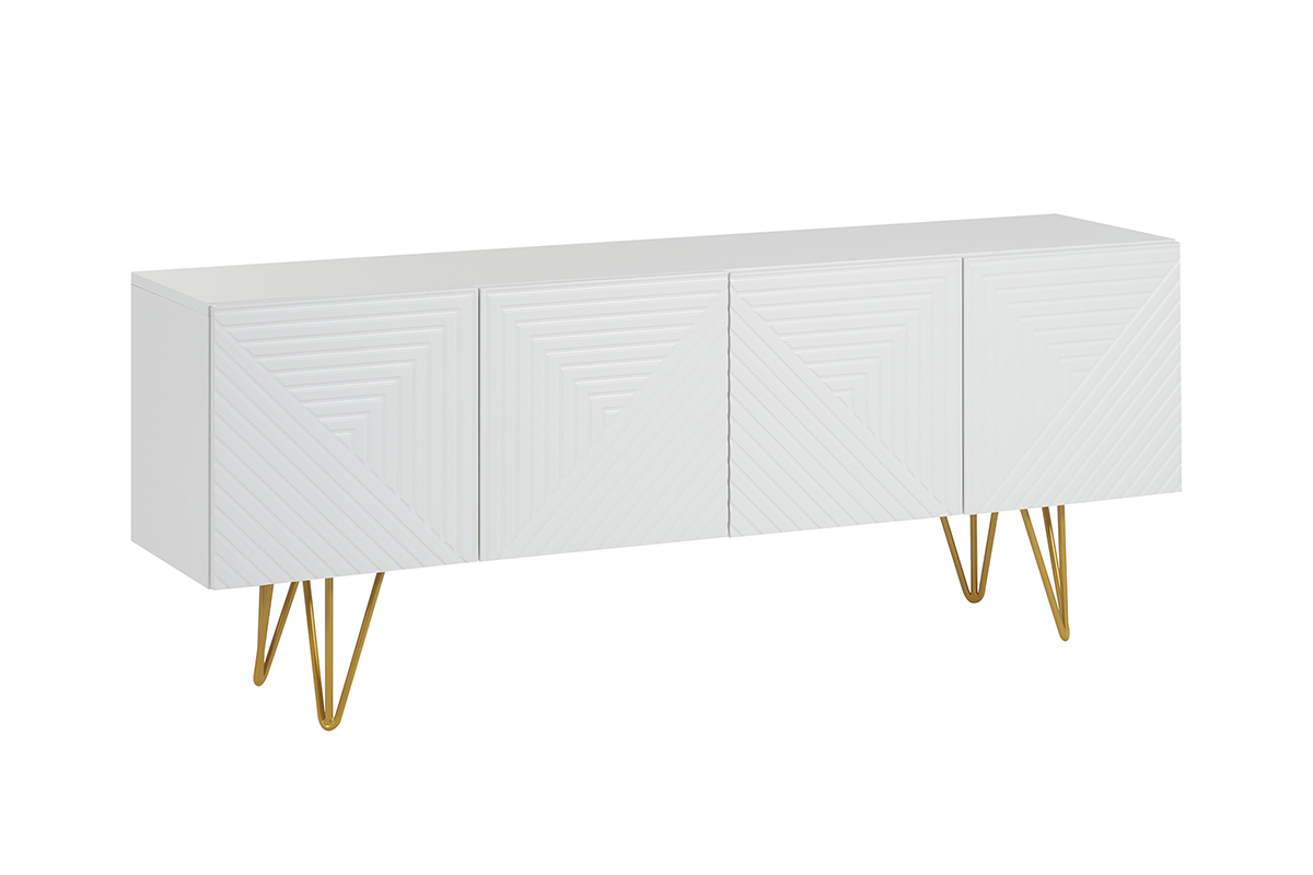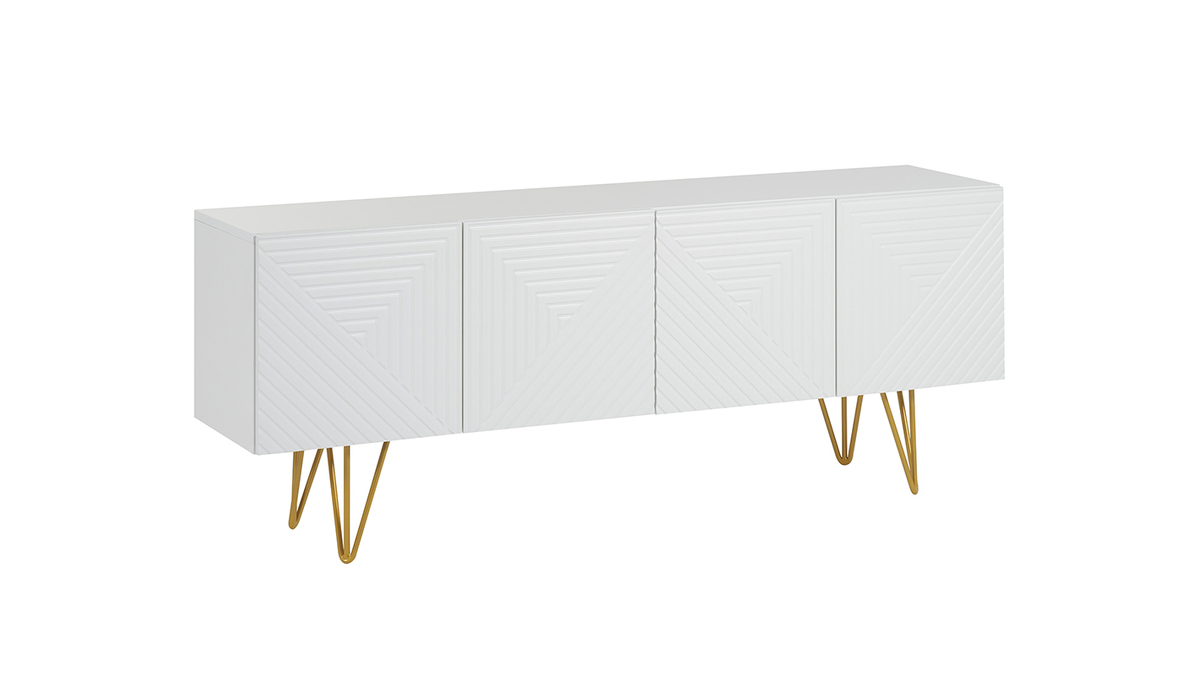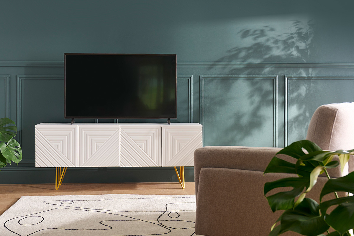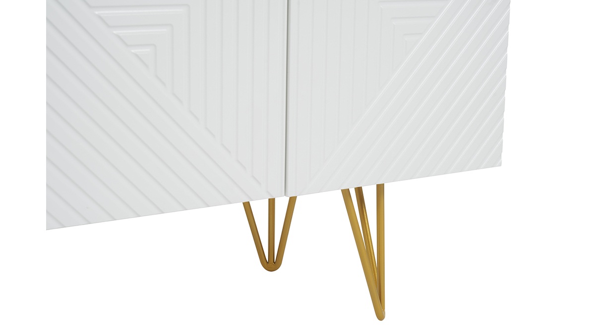 Le meuble TV OZEN est un véritable concentré d'élégance. Son caisson blanc immaculé s'habille de superbes gravures graphiques, hypnotiques. Il repose sur des pieds en épingle en métal doré, de quoi donner un côté ultra aérien et tendance à l'ensemble. Moderne et design, ce meuble TV blanc et doré apportera une belle touche d'éclat du salon ! Au sein d'un séjour contemporain, il formera la combinaison parfaite accompagné du buffet assorti.
