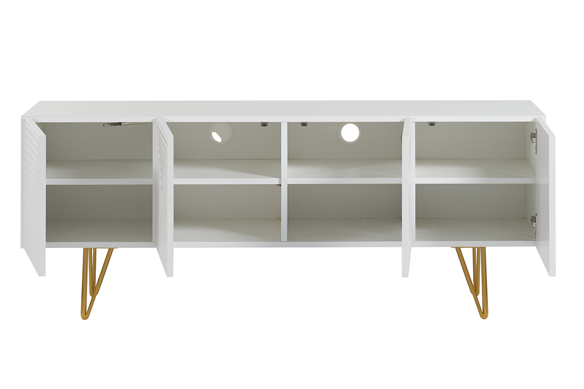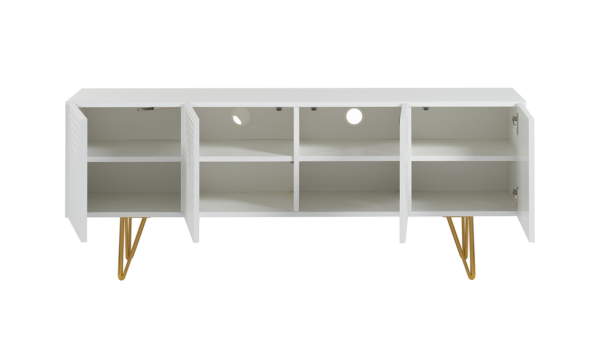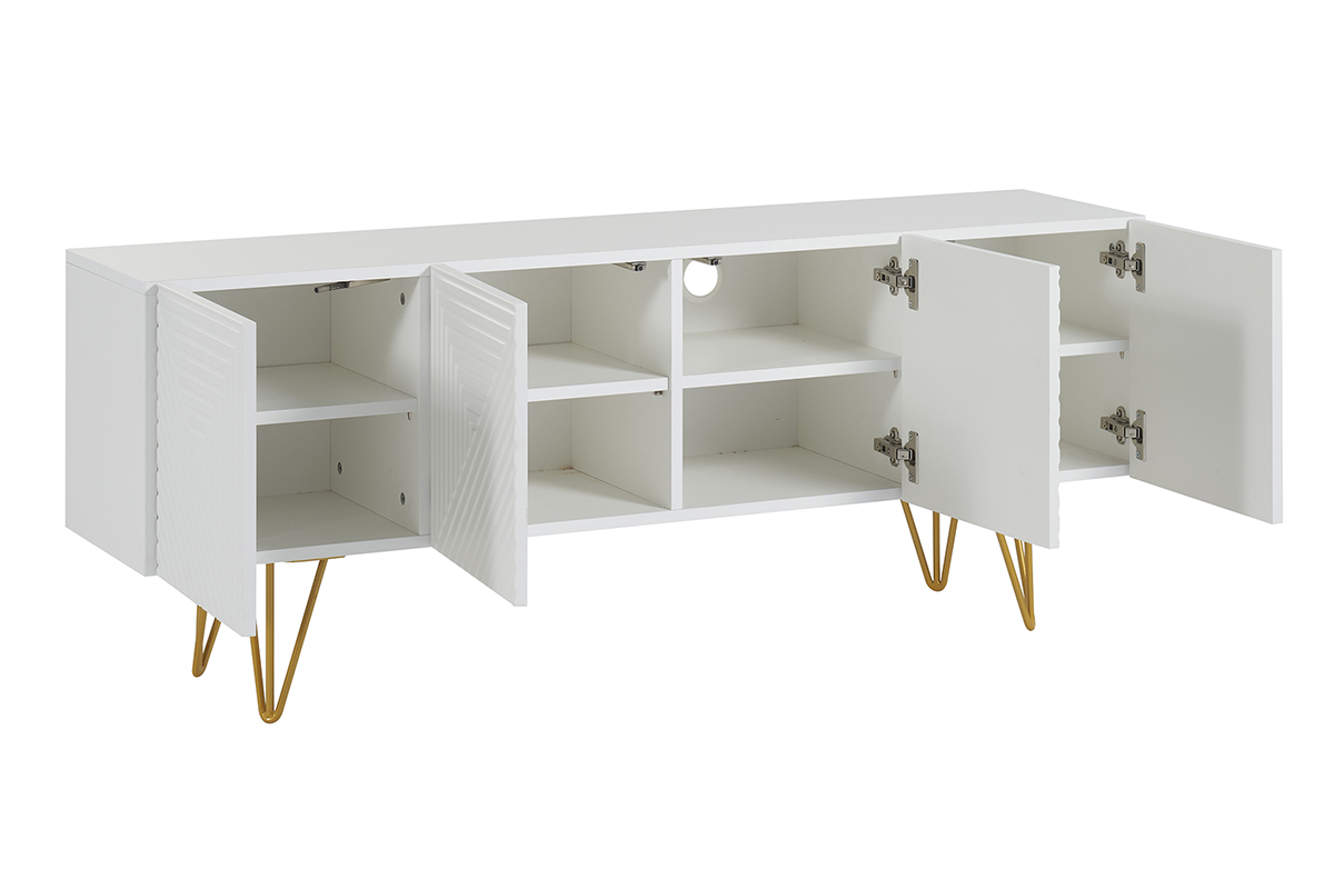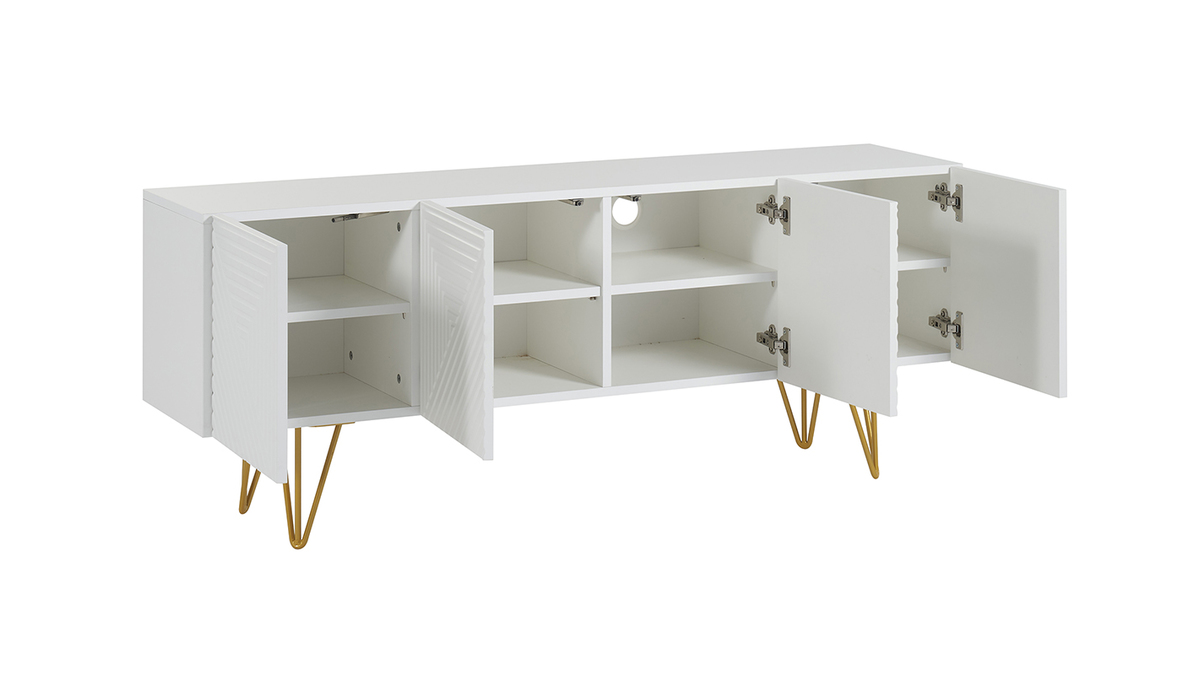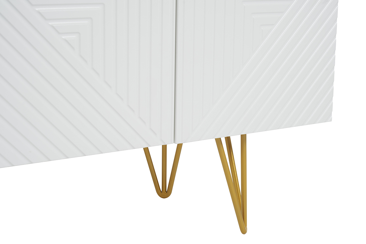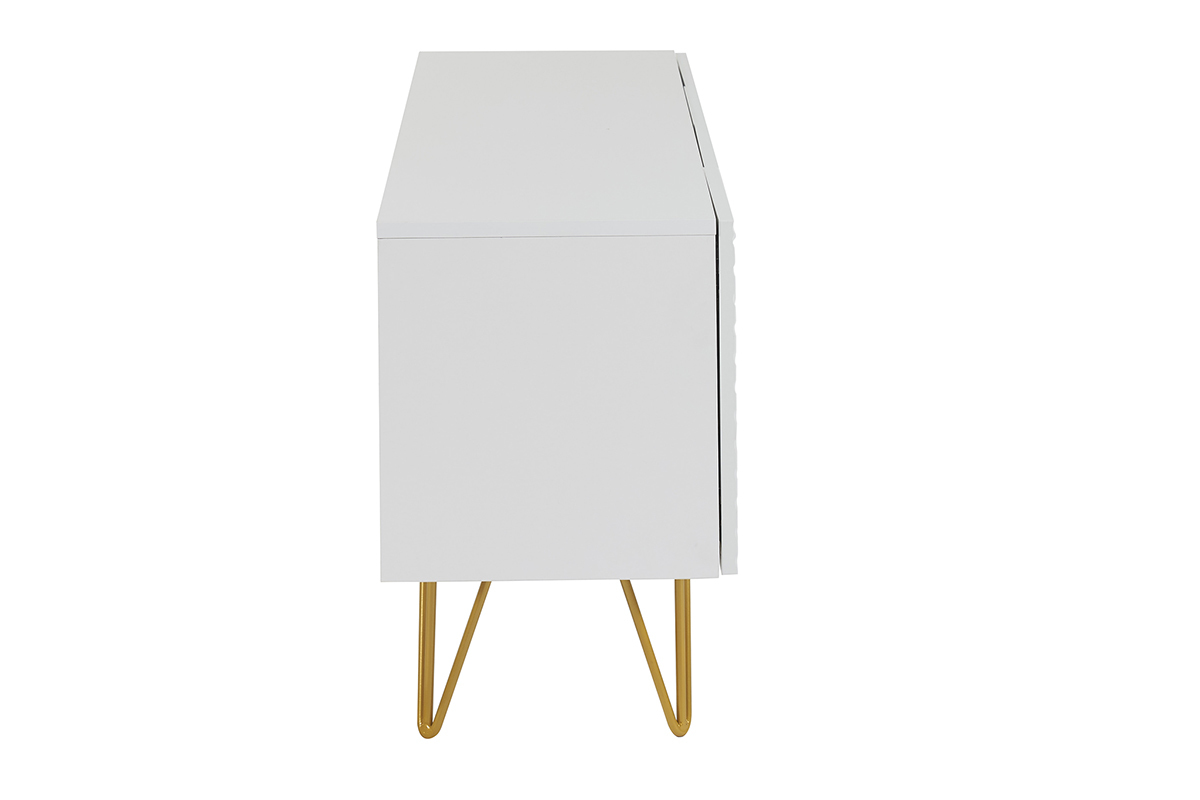 Le meuble TV OZEN est un véritable concentré d'élégance. Son caisson blanc immaculé s'habille de superbes gravures graphiques, hypnotiques. Il repose sur des pieds en épingle en métal doré, de quoi donner un côté ultra aérien et tendance à l'ensemble. Moderne et design, ce meuble TV blanc et doré apportera une belle touche d'éclat du salon ! Au sein d'un séjour contemporain, il formera la combinaison parfaite accompagné du buffet assorti.