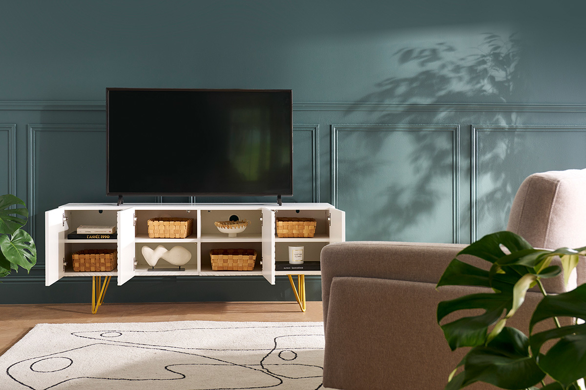 Ce grand meuble TV L140 cm cache derrière ses 4 portes 8 espaces de rangement (L33.3 x P31.6 x H15 cm). Box TV, console de jeux, accessoires high-tech : tous les essentiels de l'espace télé seront parfaitement organisés à l'abri des regards. Pour faciliter vos branchements, ce meuble TV avec rangements contient deux passe-câbles. Pratique et stylé, OZEN coche toutes les cases pour occuper une place de choix dans votre pièce de vie !