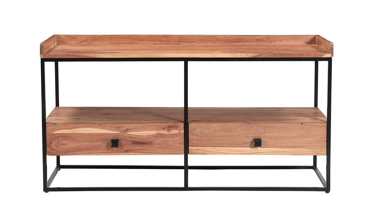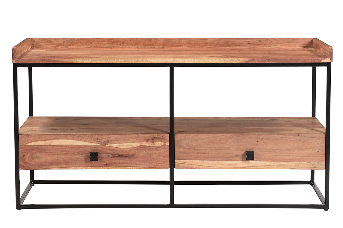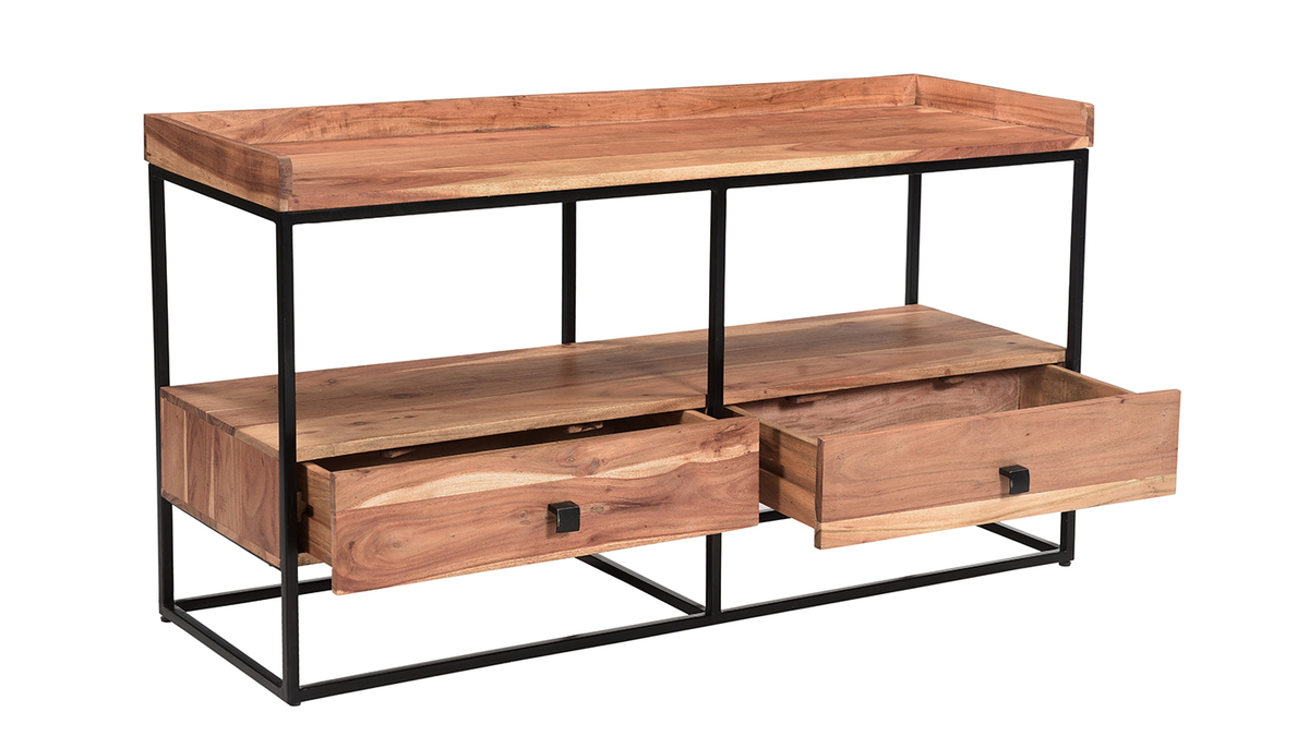 En plus de son design tendance, ce meuble en bois massif est fonctionnel. Il dispose de deux tiroirs et d'une niche centrale pour accueillir les appareils électroniques et les affaires du salon. D'une longueur de 115 cm, ce meuble n'encombre pas l'espace et trouve sa place facilement dans un petit salon.