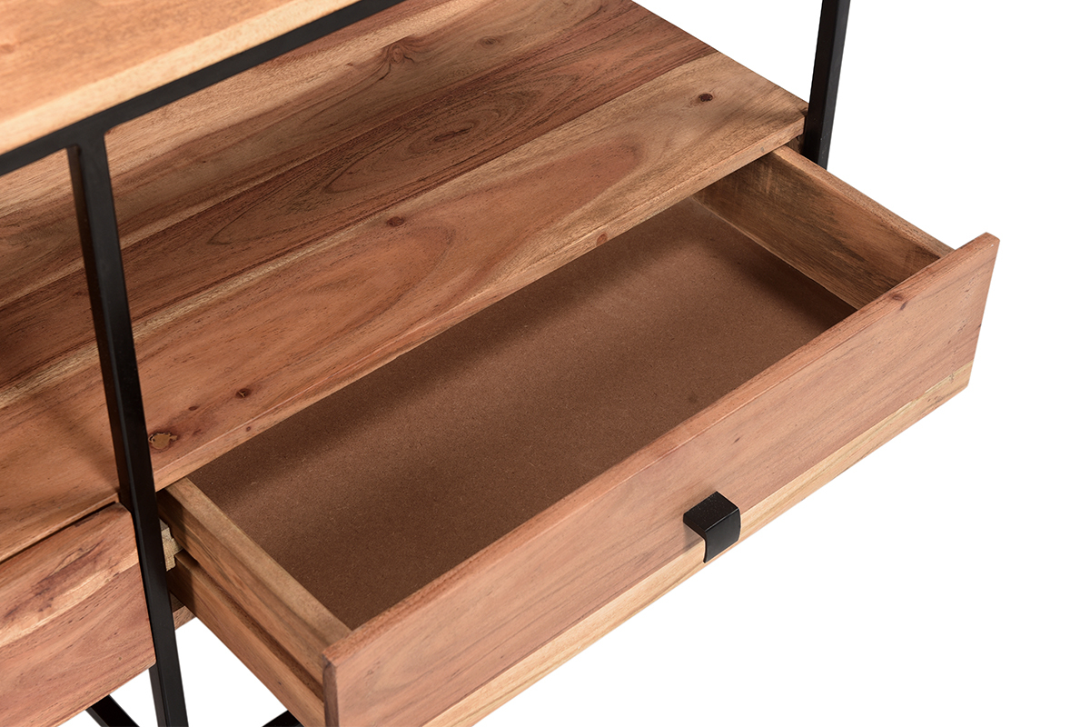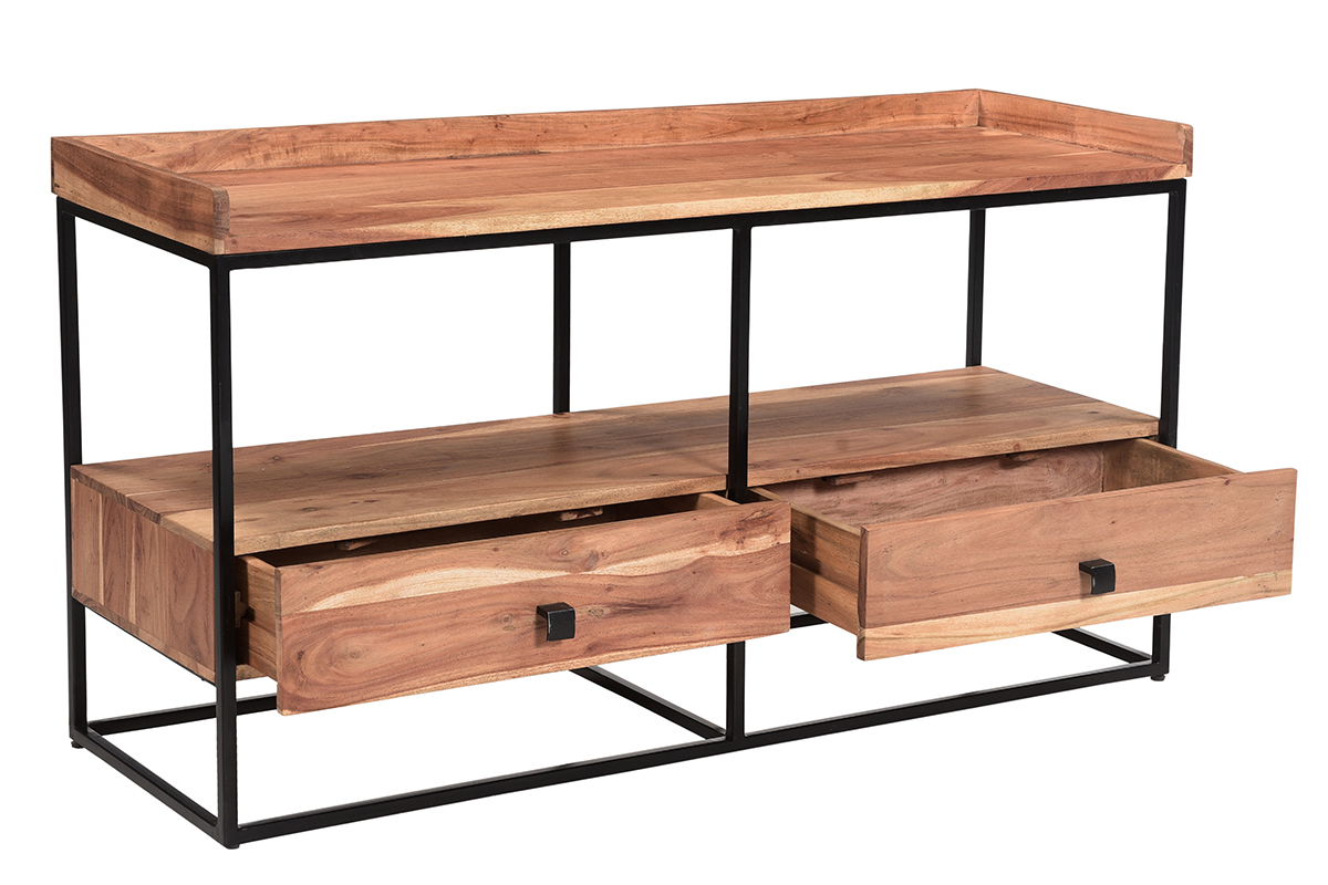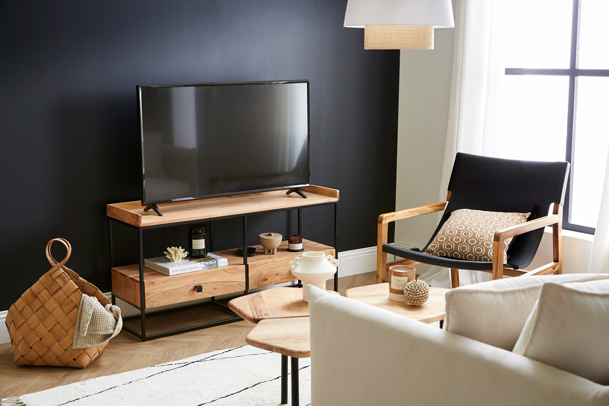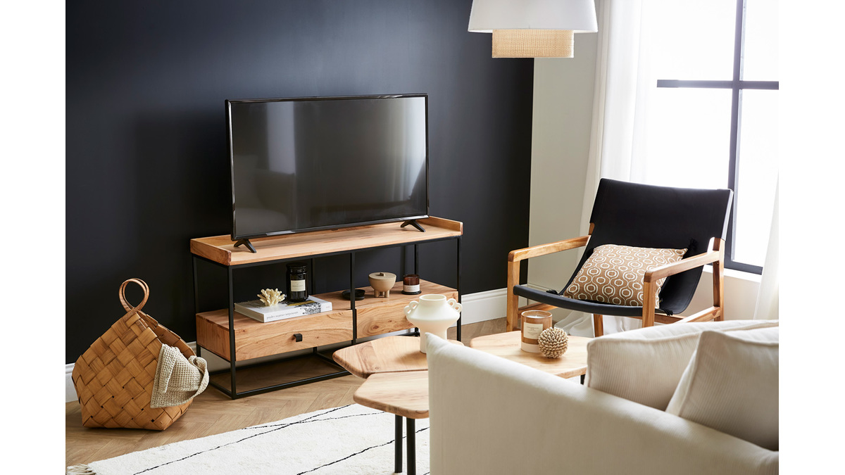 Pour un intérieur chaleureux, optez pour le meuble TV avec tiroirs en acacia massif et métal noir HERMANN.