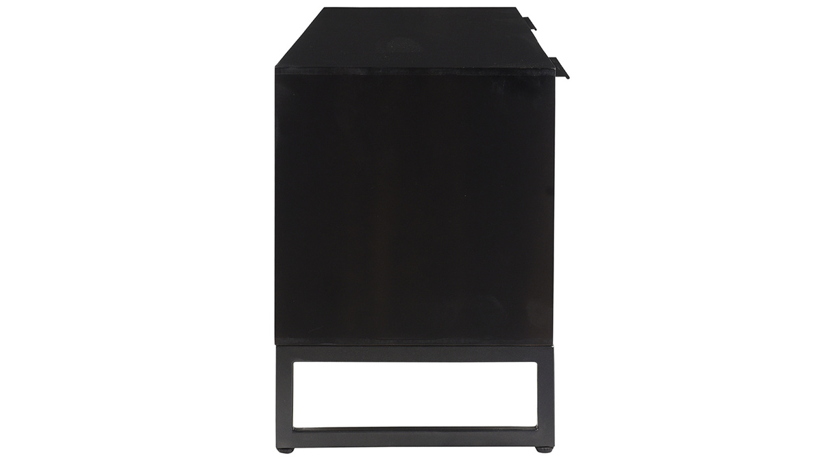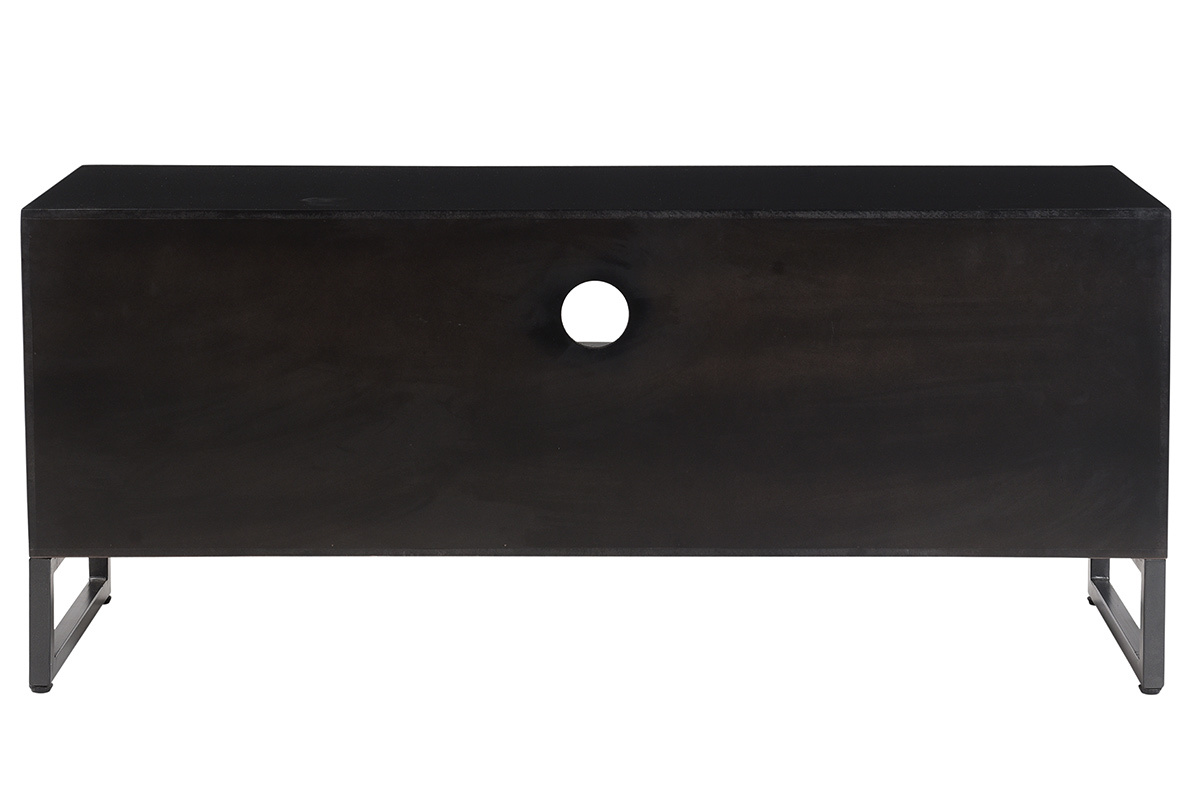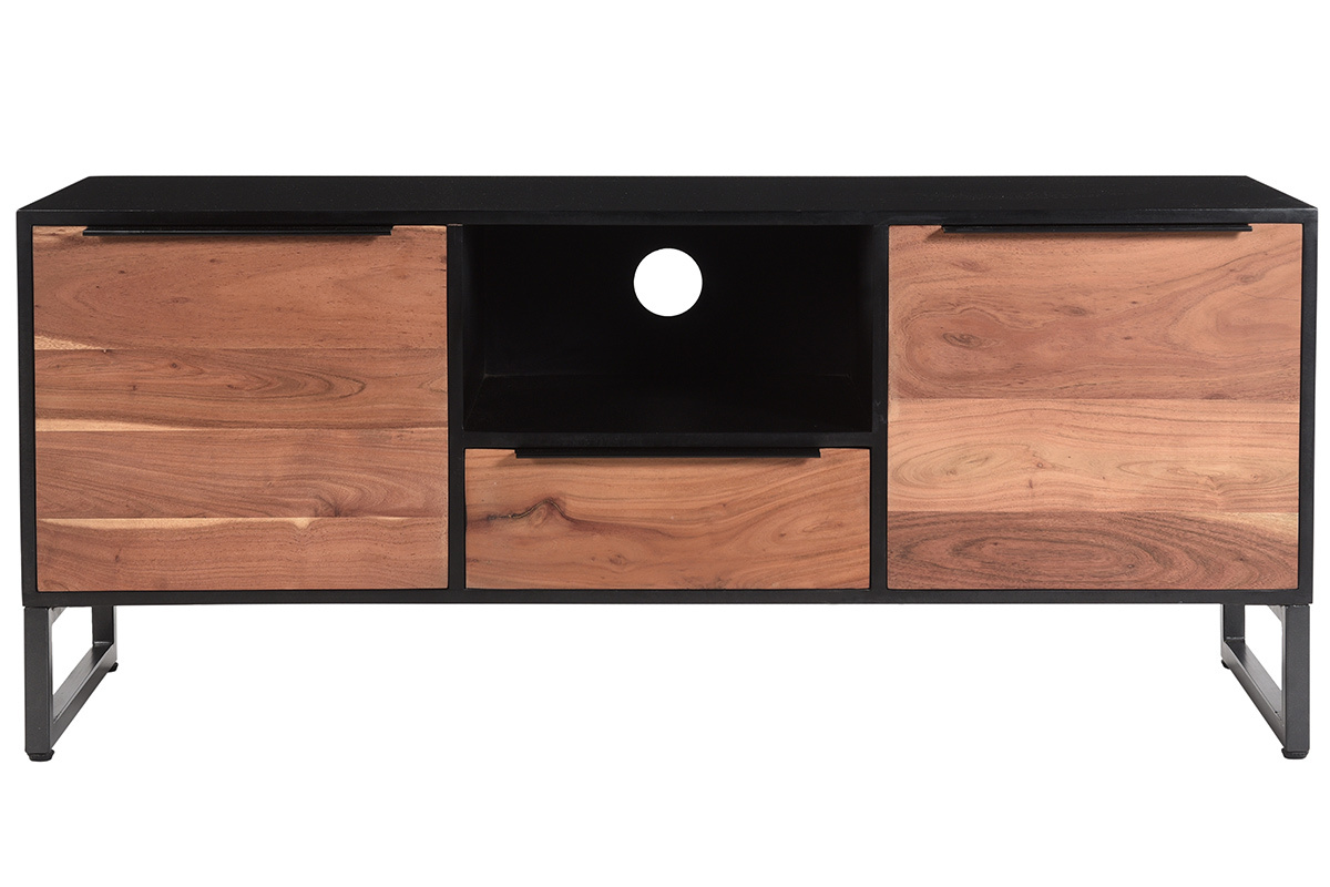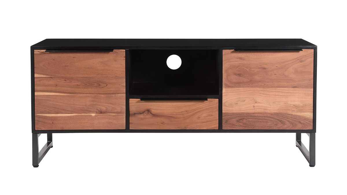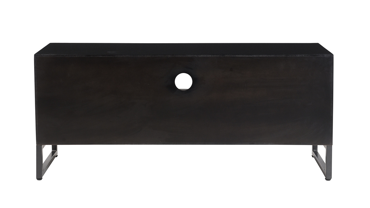 Des façades en bois massif ; des pieds et poignées réalisés en métal... le meuble TV BARNEY est composé de matériaux solides. Il renferme quatre espaces de rangement bien optimisés. La niche centrale équipée d'un passe-câble est adaptée aux appareils électroniques.