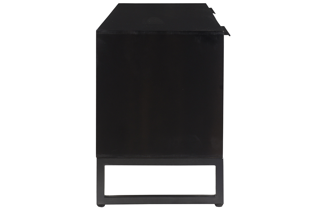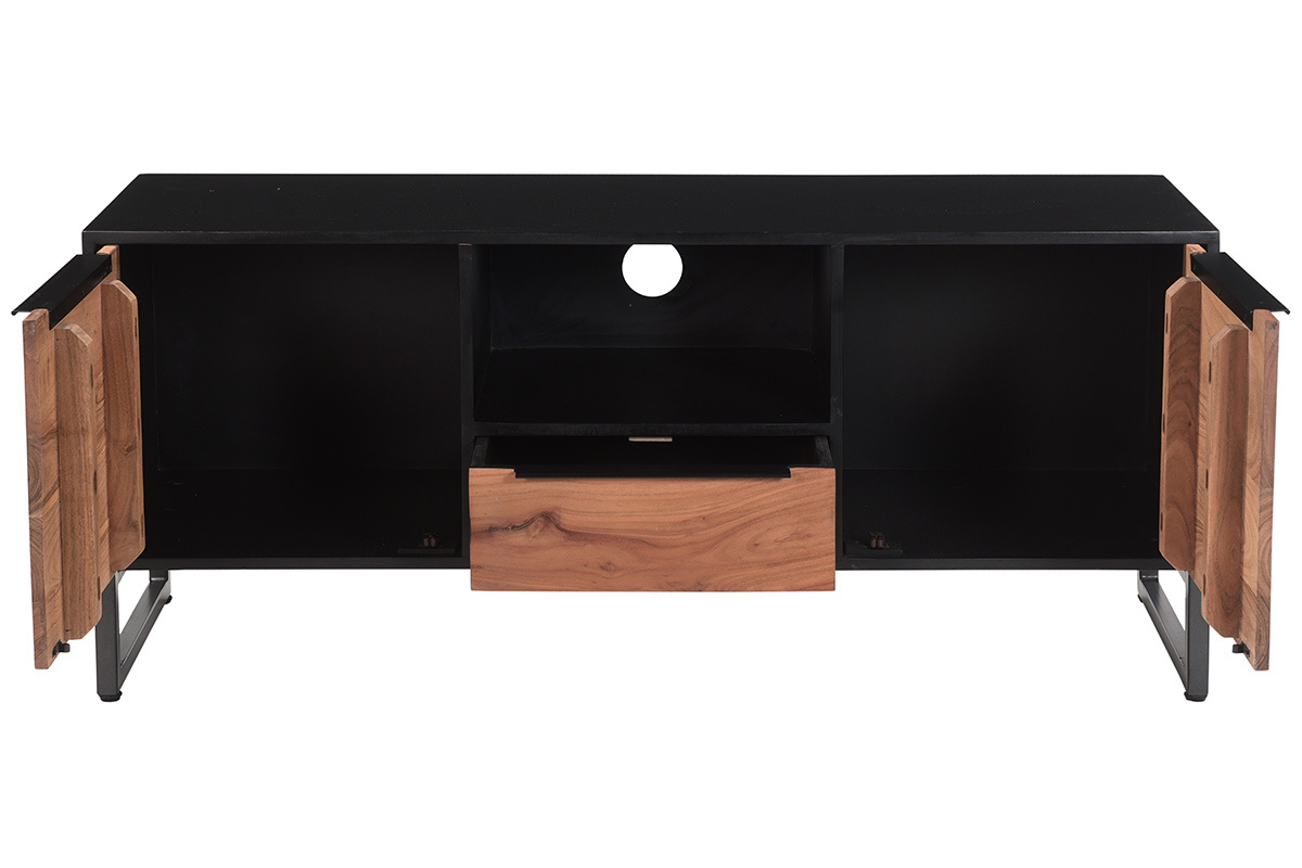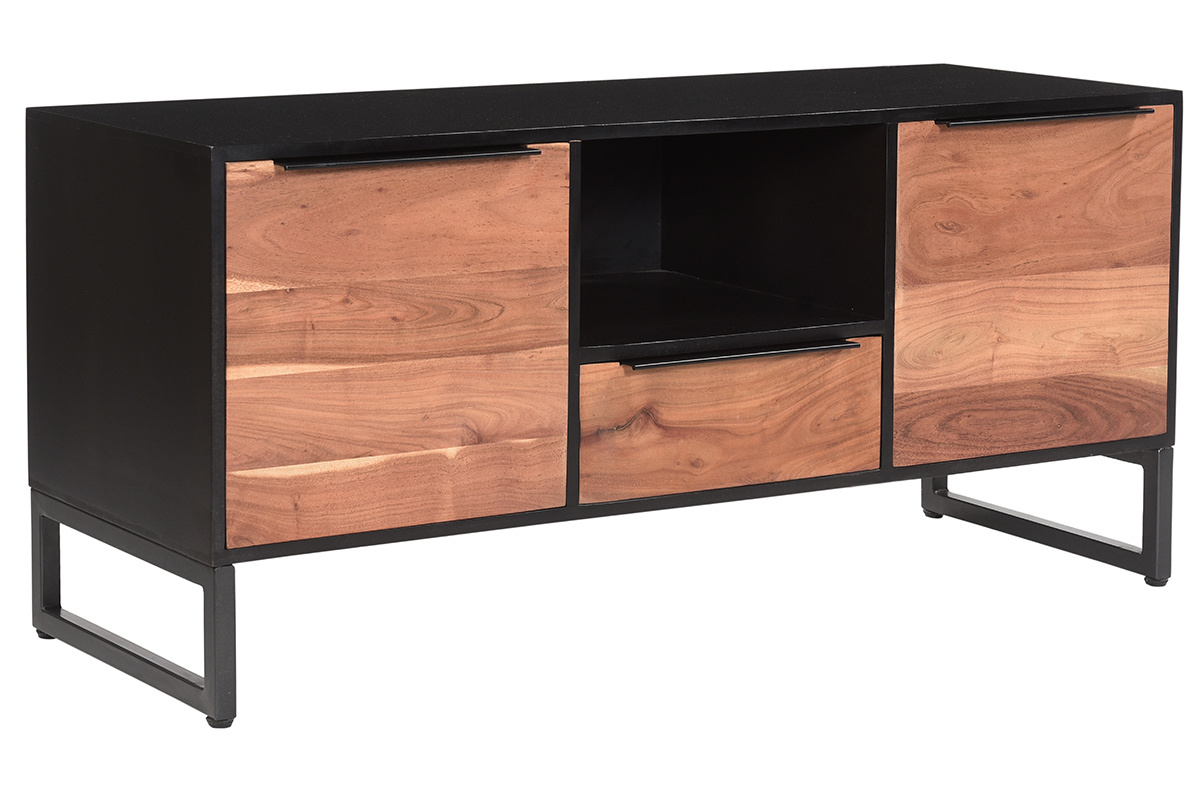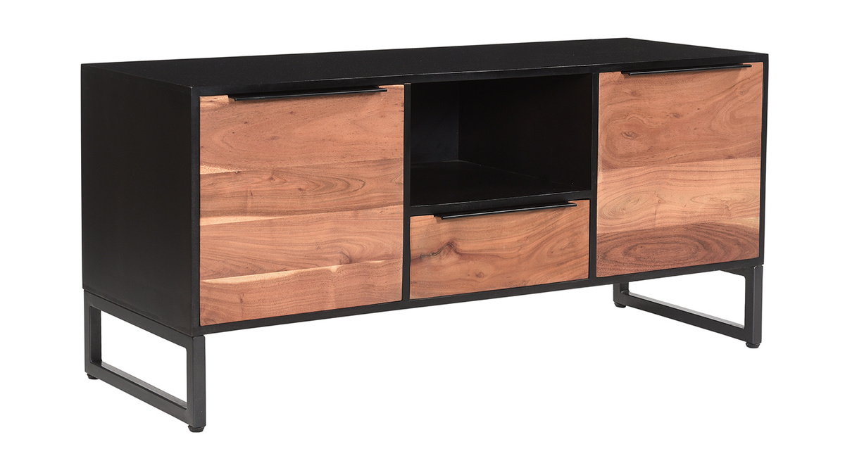 Des façades en bois massif ; des pieds et poignées réalisés en métal... le meuble TV BARNEY est composé de matériaux solides. Il renferme quatre espaces de rangement bien optimisés. La niche centrale équipée d'un passe-câble est adaptée aux appareils électroniques.