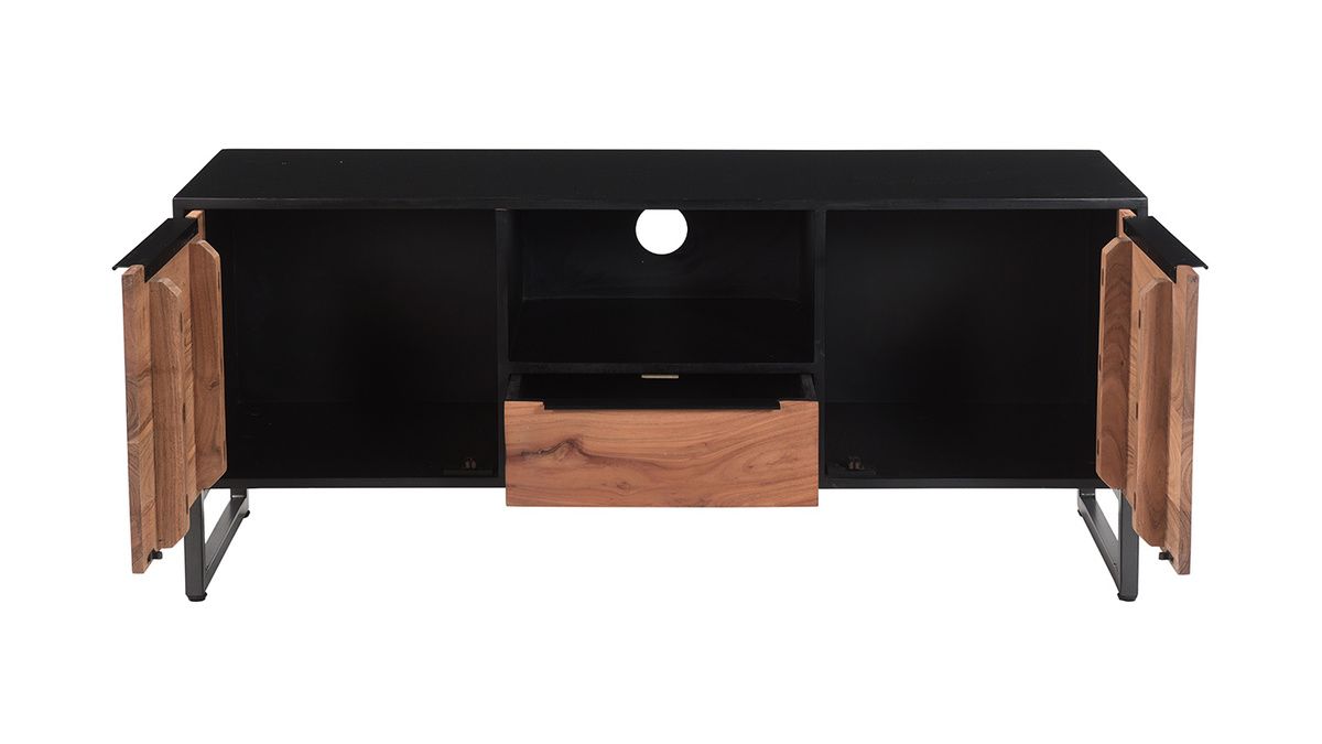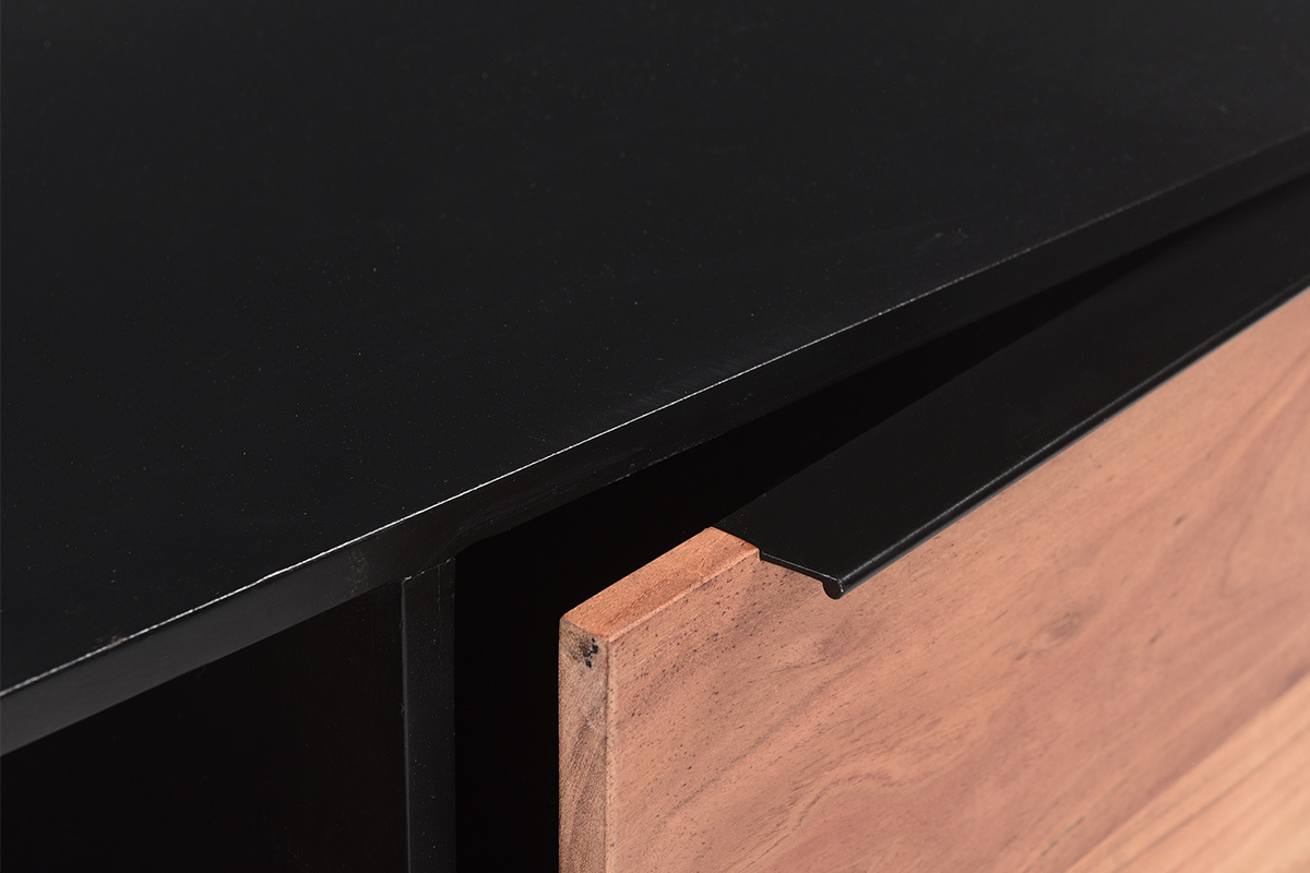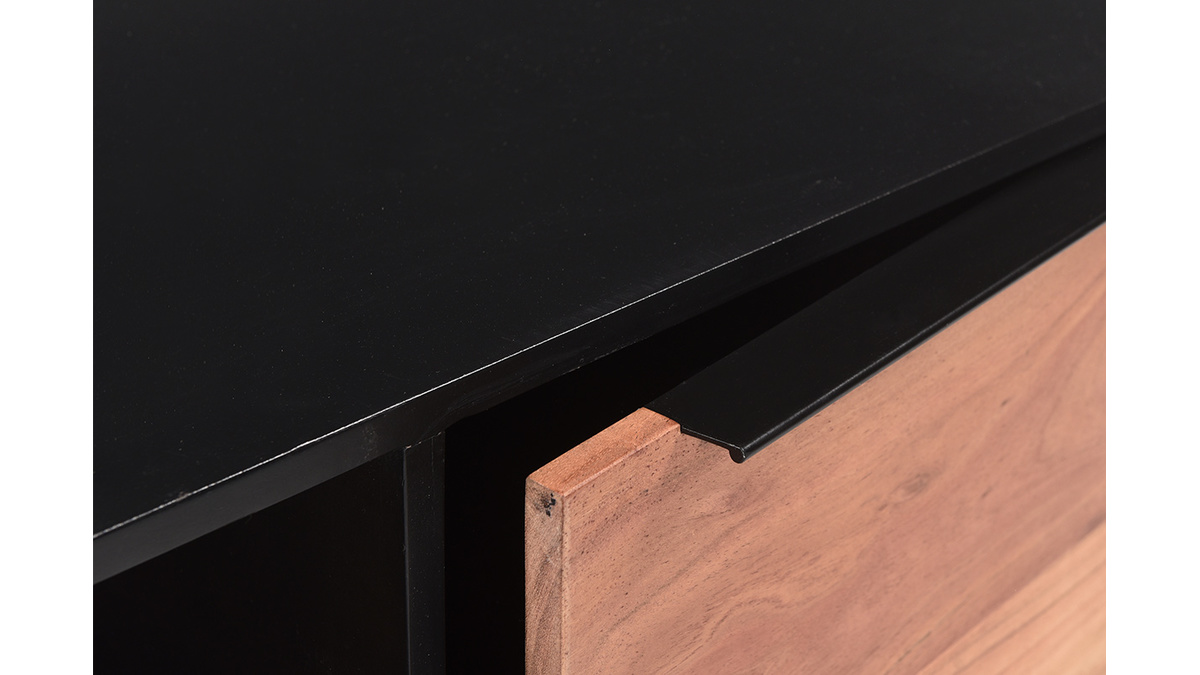 Ce meuble TV combine une structure en panneaux de fibres de bois peints en noir avec des façades en acacia massif. C'est une pièce de mobilier qui joue parfaitement avec les contrastes. Les tons rougeoyants de l'acacia sont mis en valeur par les éléments noirs. Joliment encadré, le bois massif révèle toute sa beauté et dessine un ensemble de formes graphiques au rendu moderne. Le meuble TV BARNEY est une pièce artisanale dans laquelle on retrouve tout ce qui fait le charme des meubles faits à la main. Unique et authentique, ce modèle s'associe parfaitement à un salon plein de caractère.