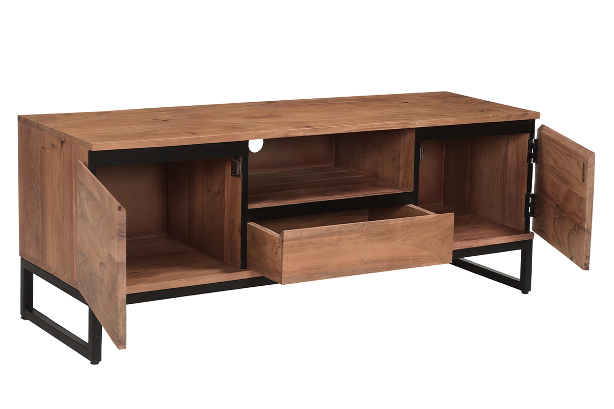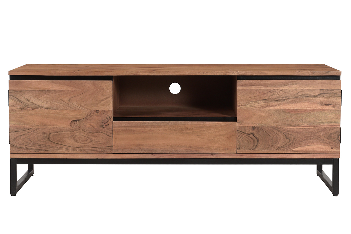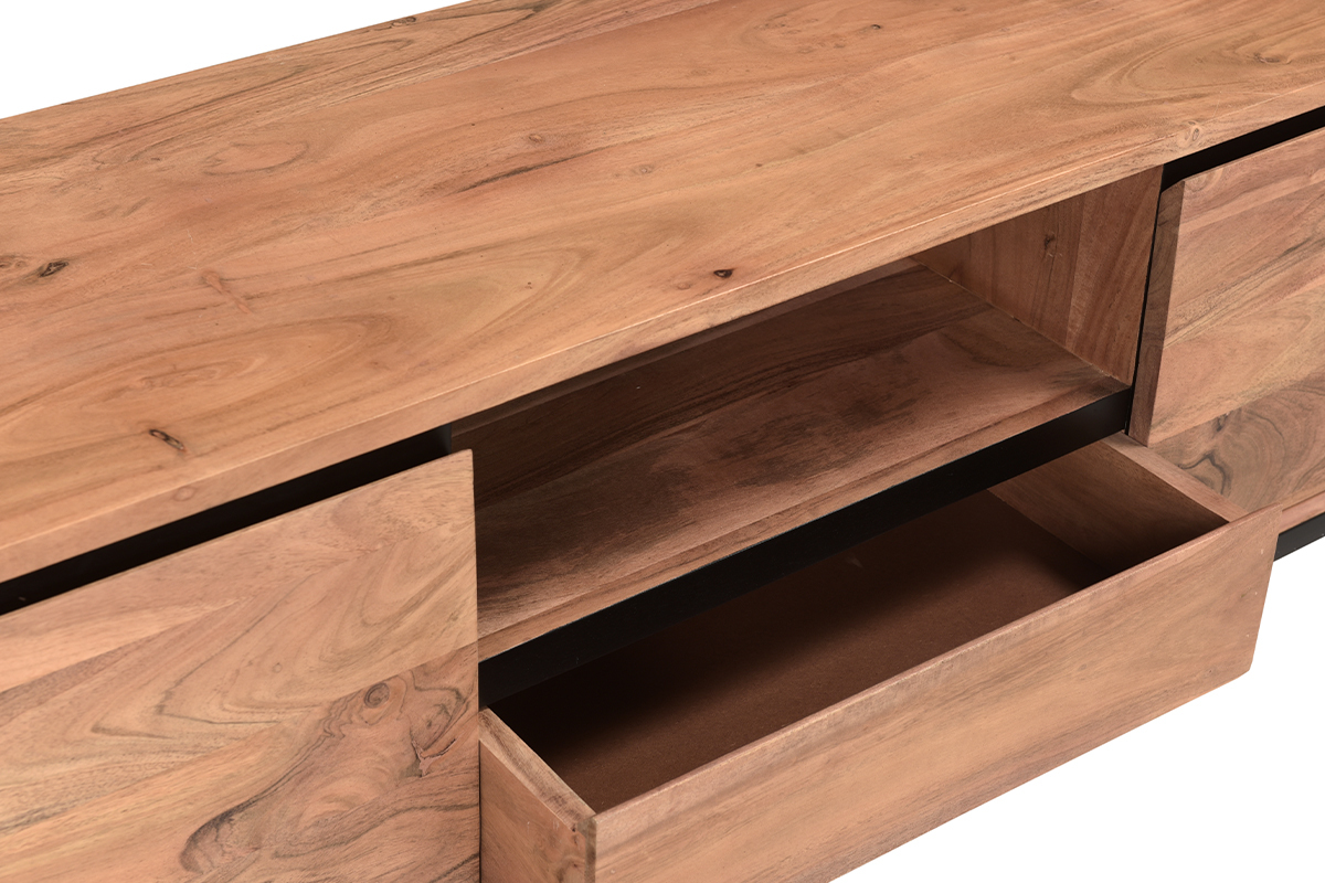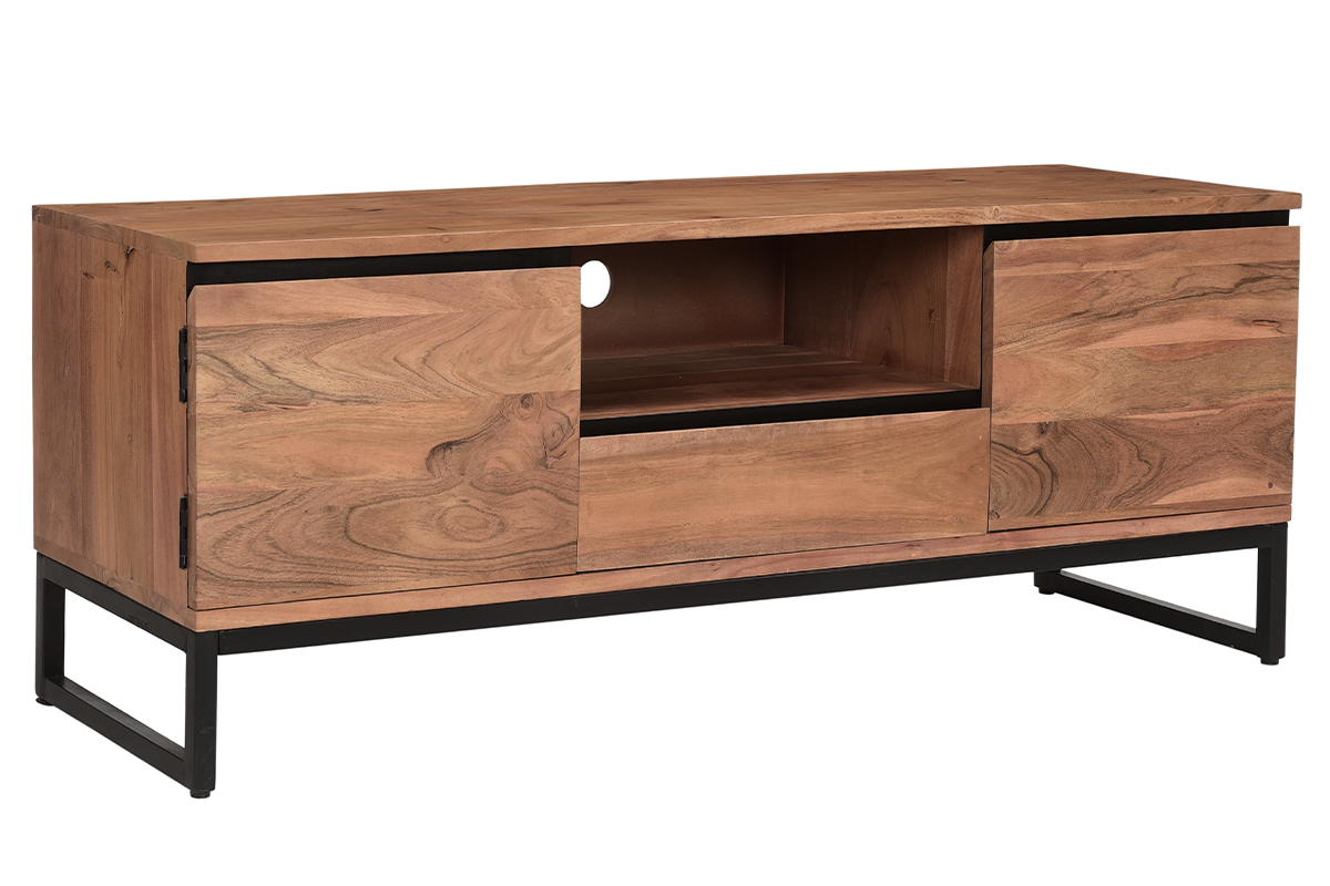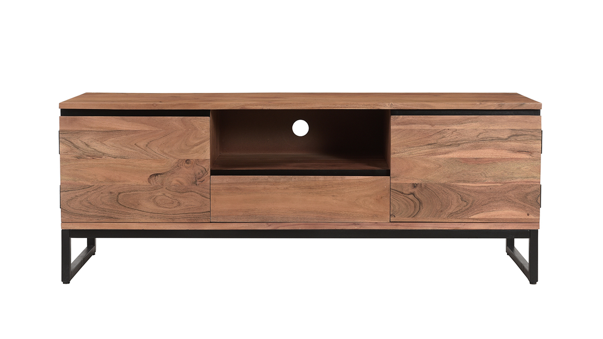 Imaginer un meuble TV gain de place travaillé avec du bois acacia massif ? Défi relevé ! L'acacia est une essence de bois résistante aux tons rougeoyants singuliers : parfait pour équiper les salons tendances avec des meubles de qualité ! Des lignes franches, une essence de bois unique et un piètement moderne en métal noir font tout le charme du meuble TV HOORN. Pour conserver son authenticité, il est réalisé selon des techniques artisanales. Chaque modèle est unique !