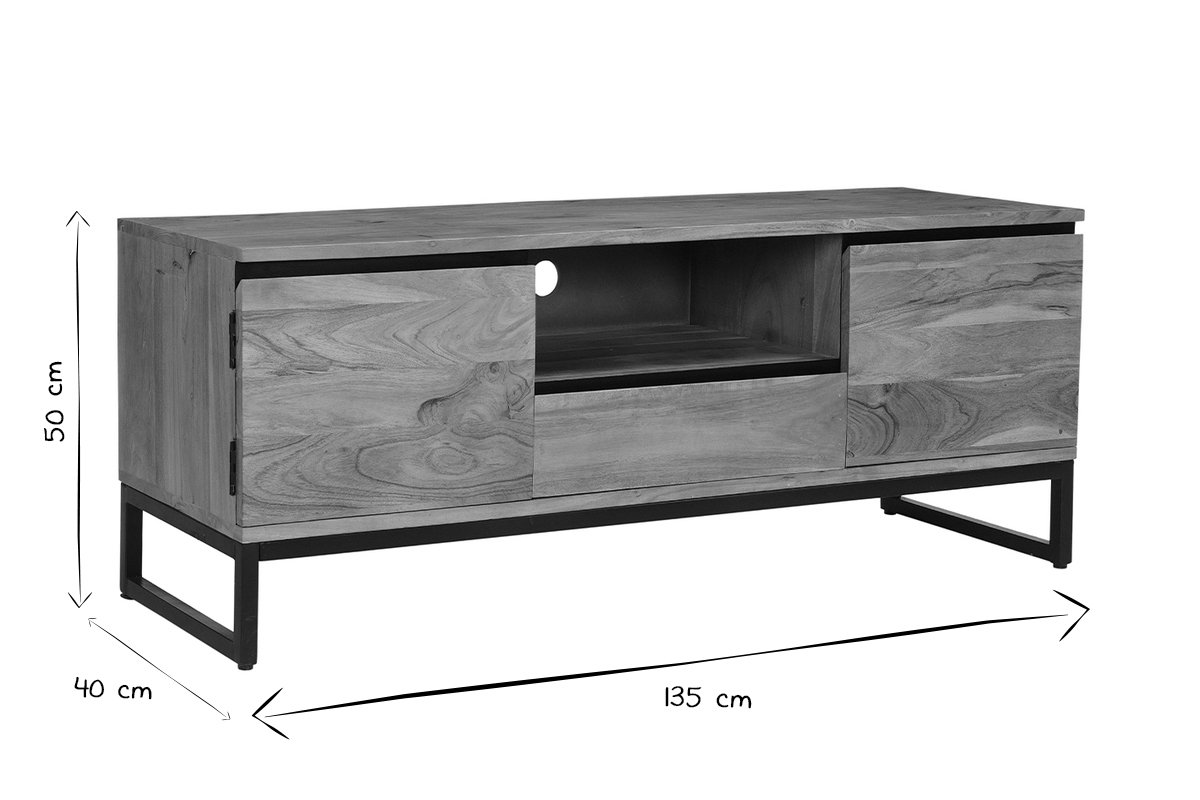 Ce petit meuble TV, fait entrer les pièces en bois massif dans les petits intérieurs. Ses dimensions compactes (L135 x P40 x H50 cm) se glissent dans tous les salons. Et pour optimiser chaque mètre carré, deux rangements fermés, une niche ouverte et un tiroir accueillent toutes les affaires du salon. Un passe-câble complète le tout pour faciliter l'installation des appareils électroniques.