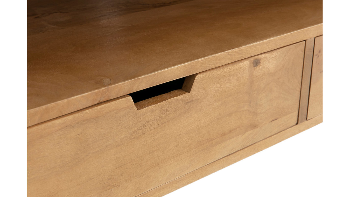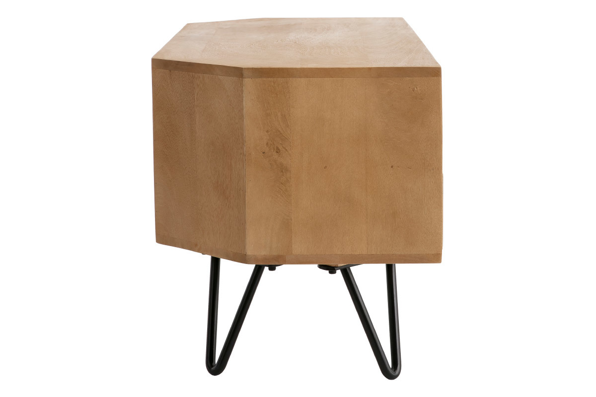 Avec sa structure en manguier massif et son piètement épingle en métal, ce petit meuble TV a tout pour crever l'écran. Il associe une structure massive aux jolis tons chauds et un piètement aérien résolument tendance. Il est fabriqué selon des techniques artisanales et reflète le charme des meubles faits main. Chaque modèle VIBES est unique. Ce sont des pièces de caractère au style industriel subtil.