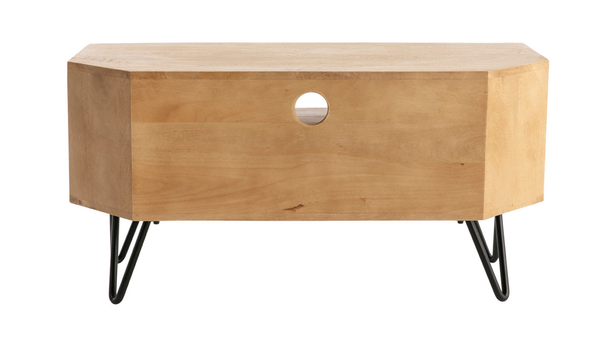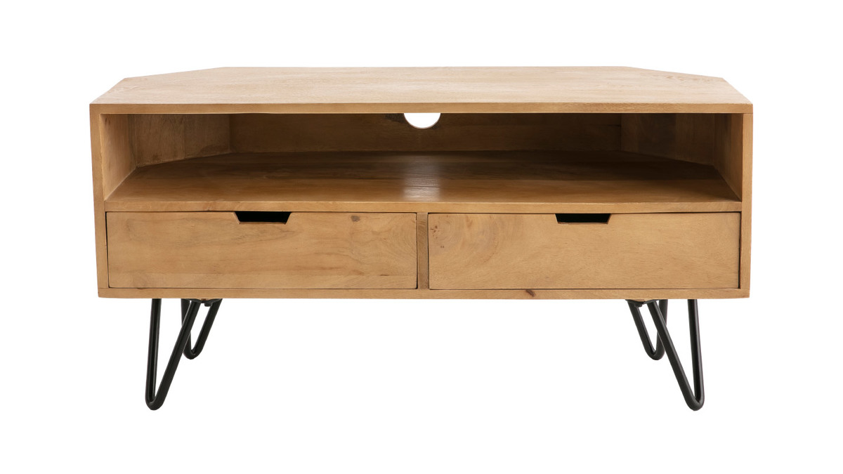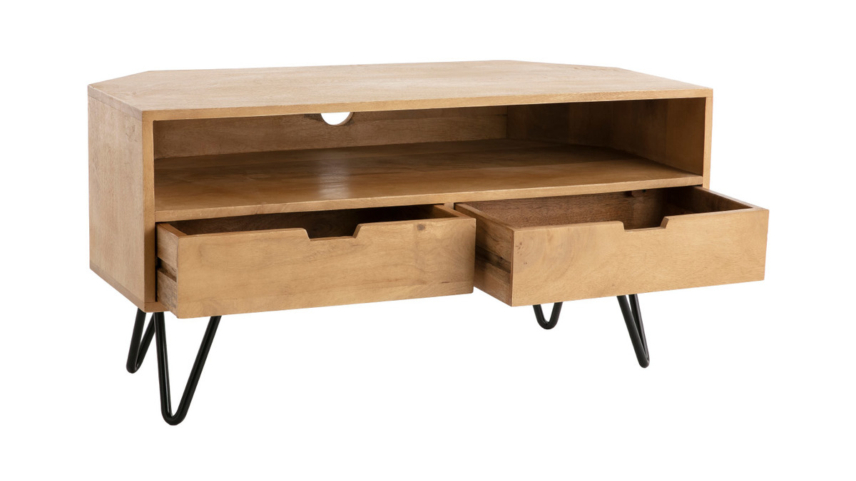 Petit meuble TV en bois massif imaginé par Caroline Marliac, designer Miliboo, VIBES est l'élément parfait pour optimiser chaque recoin du salon. Avec sa forme unique, il s'installe dans un des angles de la pièce pour ne pas encombrer les mètres carrés. Il est équipé d'une grande niche ouverte, de deux tiroirs et d'un passe-câble. Il concentre le nécessaire pour organiser un coin télé dans un petit espace.