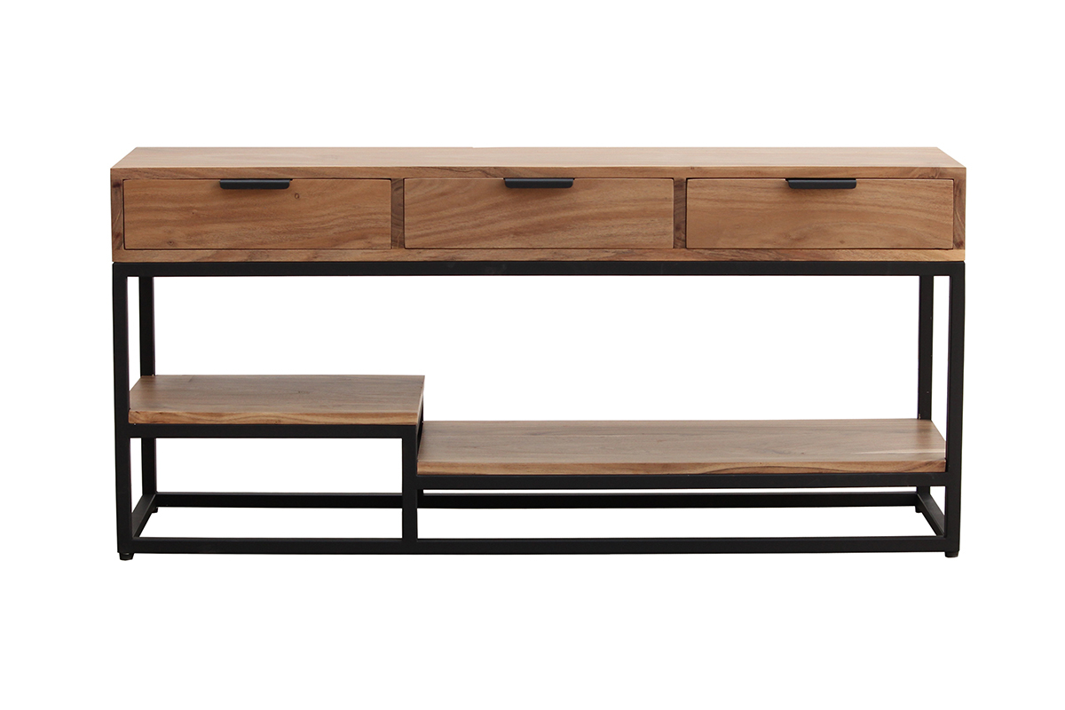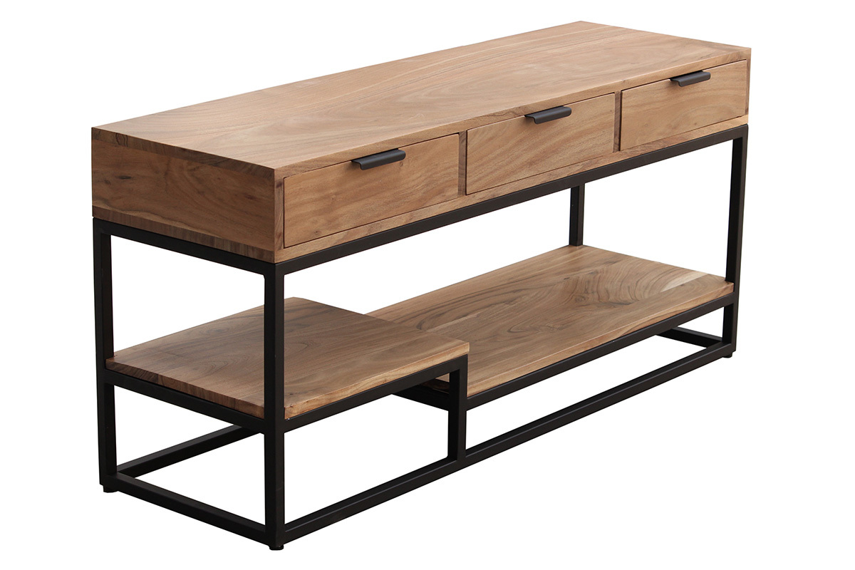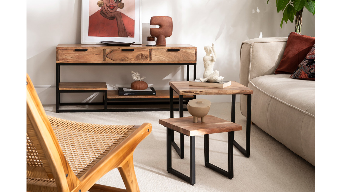Pour un ensemble dans l'air du temps, ce petit meuble TV (dimensions L115 x P35 x H53) arbore une belle association entre le bois acacia massif et le métal noir. Avec ce mélange de matières brutes et authentiques, WARREN suit la grande tendance du style industriel qui séduit durablement notre intérieur. On aime particulièrement les tons chauds de l'acacia massif et ses magnifiques couleurs rougeoyantes qui instaurent immédiatement une ambiance chaleureuse dans le salon ! Plébiscitée pour la confection de mobilier d'intérieur, l'acacia est une essence naturellement dure et dense particulièrement esthétique. Ce bois imputrescible, se distingue par ses veinures allongées mais également ses variations de couleurs. Avec le temps, l'exposition à la lumière et sources de chaleur, l'acacia est un bois clair dont le coloris jaune-vert à doré subit une coloration naturelle (brune, rougeoyante, reflets gris).