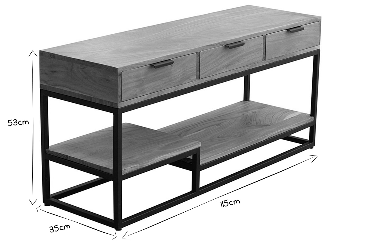 Le plateau de 115 cm accueille aisément un écran TV. Ses deux étagères basses permettent à une box internet et autres objets électroniques de trouver facilement leur place. Ce meuble TV dispose également de trois tiroirs afin de garder le salon organisé.