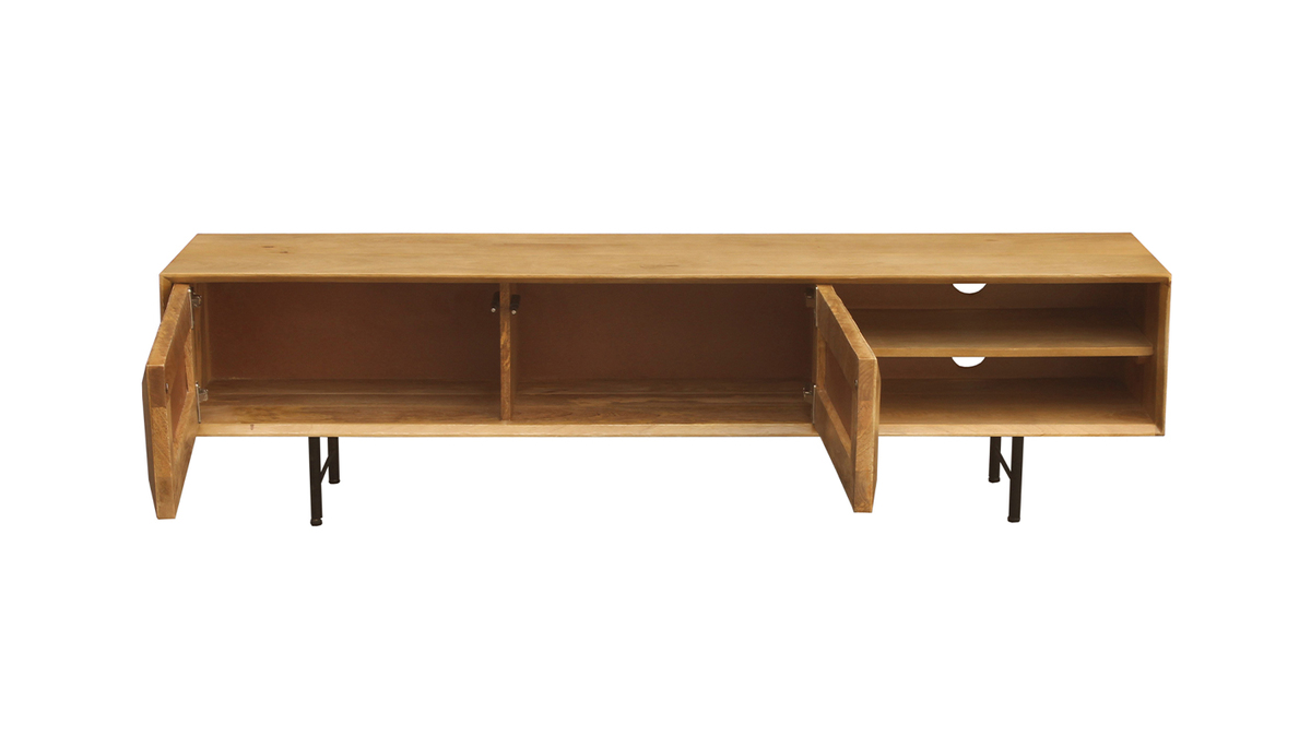 En plus de son authenticité, AGRA charme également par son sens de la fonctionnalité. Ce long meuble TV avec rangements comporte deux niches ouvertes avec passe-câbles ainsi que deux niches fermées. Box TV, livres, console de jeux, et autres essentiels du salon y trouveront tous une place !