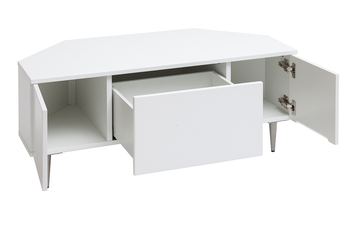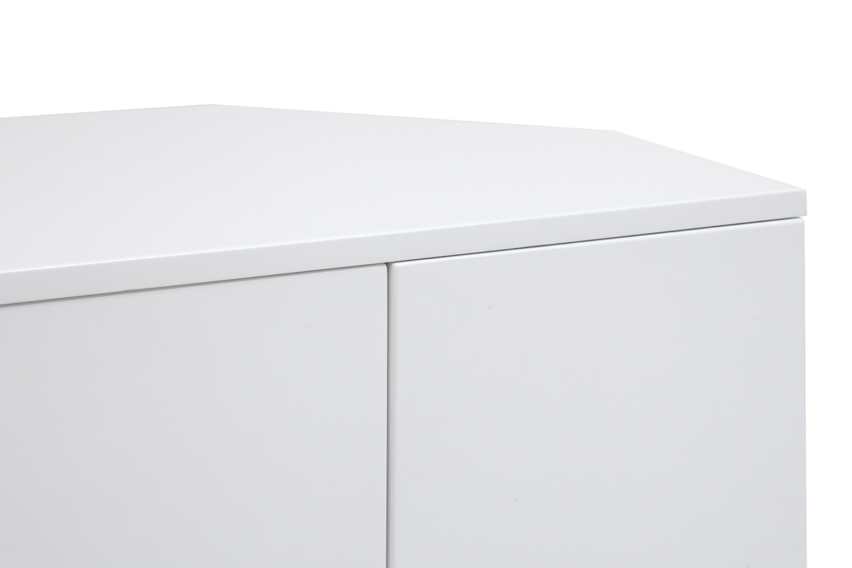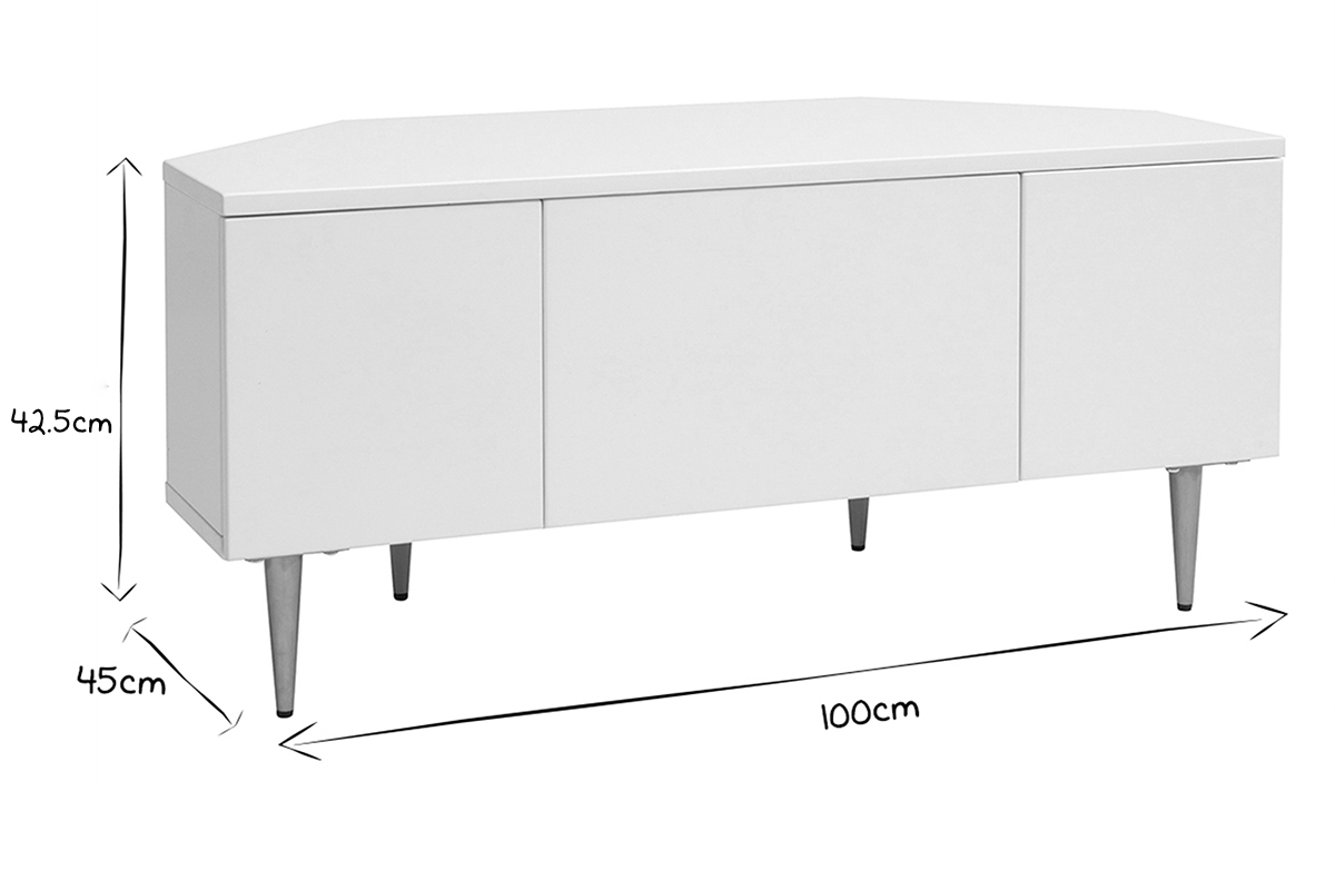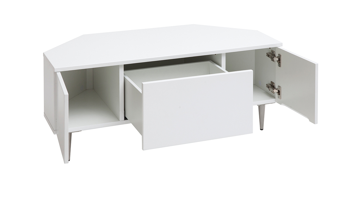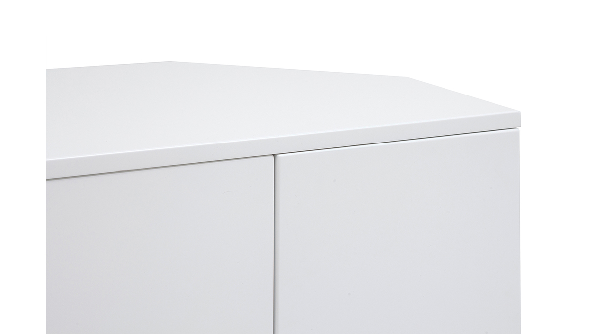 Pratique et design, ce meuble d'angle est l'incontournable des séjours bien agencés. Semi-octogonal, il épousera vos murs pour un gain de place appréciable, sa forme originale assurera un espace ouvert à l'arrière pour cacher vos câbles d'appareils multimédias.