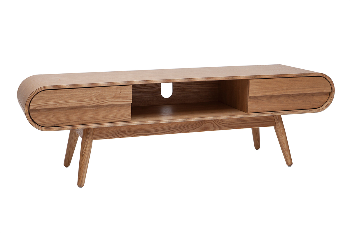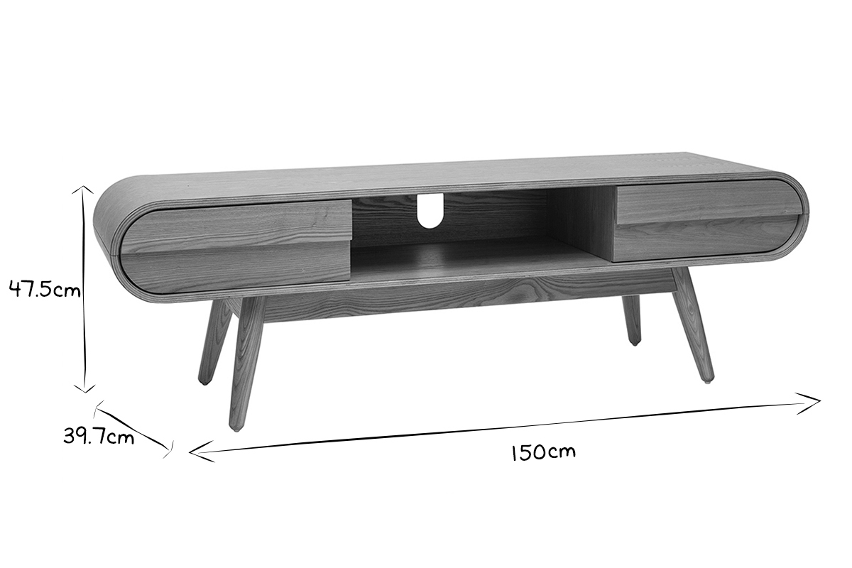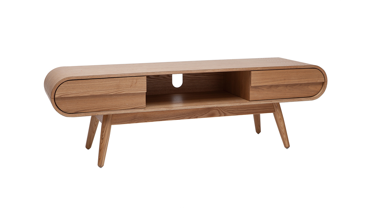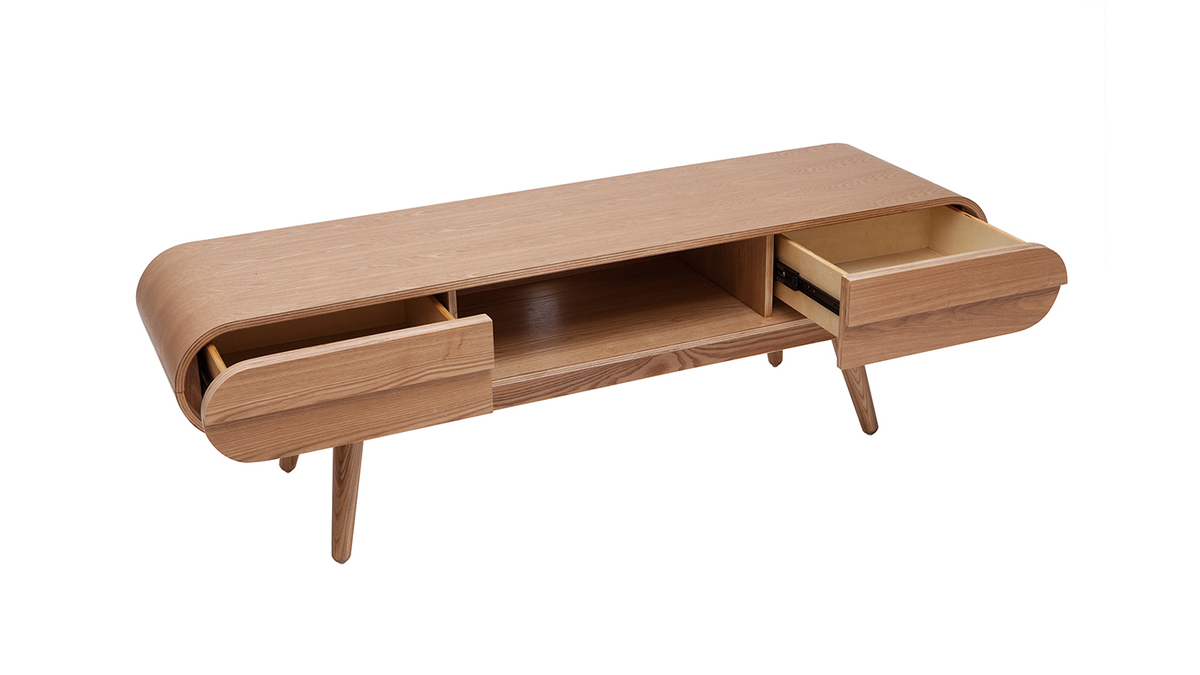 - Unique : ce meuble TV se caractérise par des formes arrondies très atypiques qui lui donnent un charme inconditionnel. Son piètement en hévéa massif fini d'un placage frêne vient terminer ce meuble et lui donner un look élégant et raffiné.