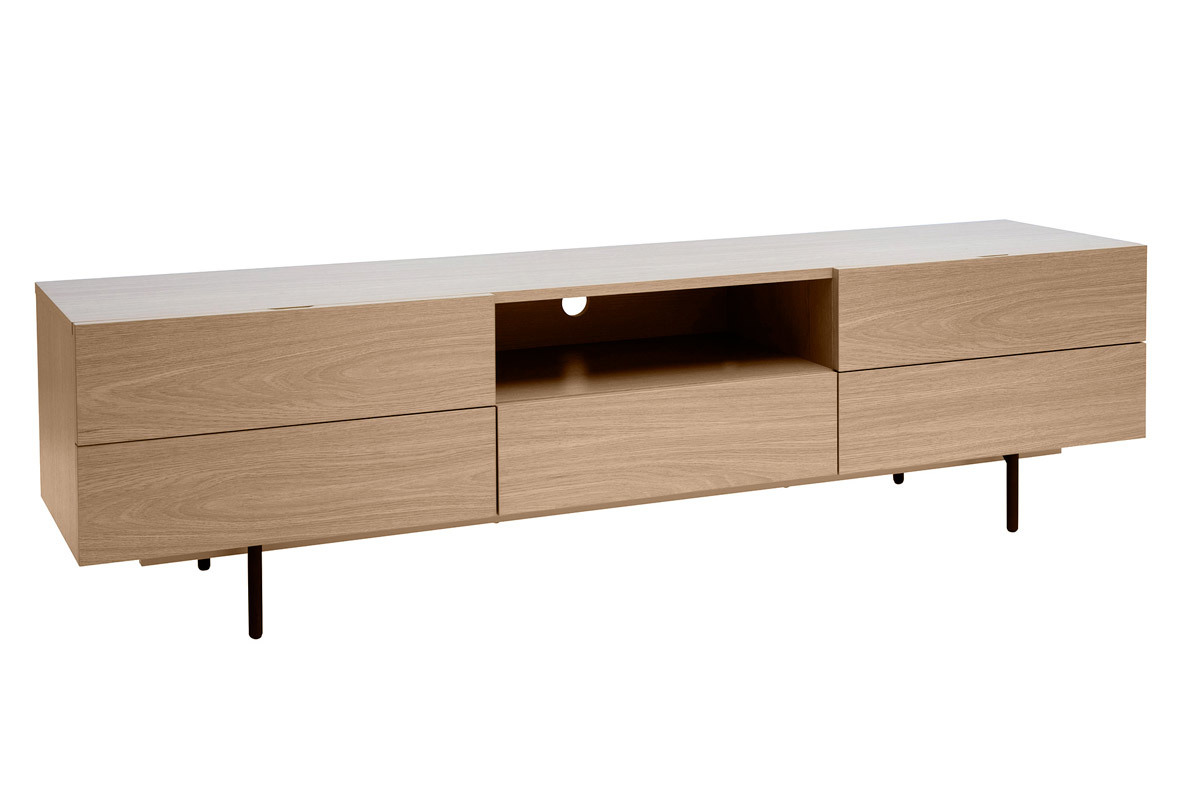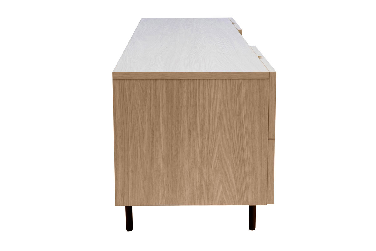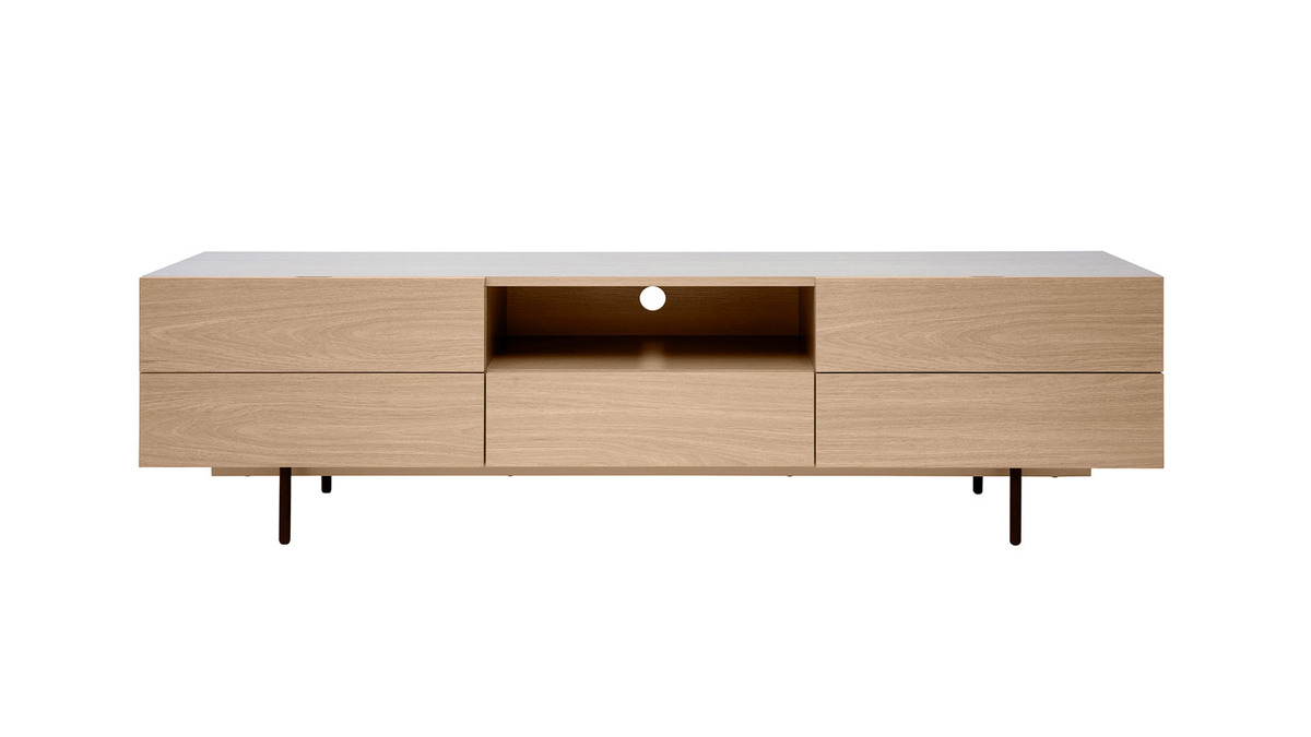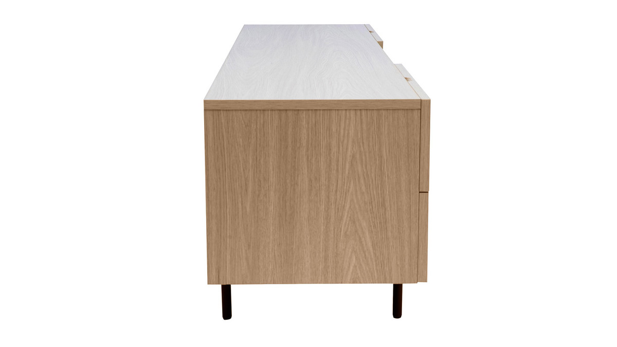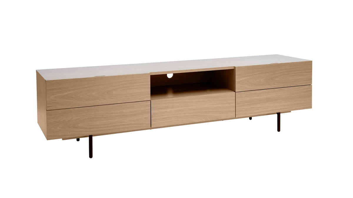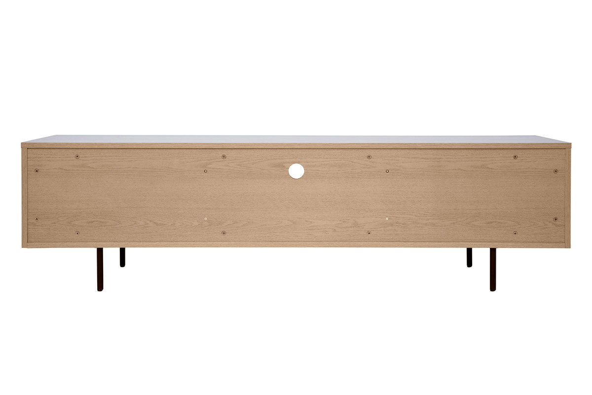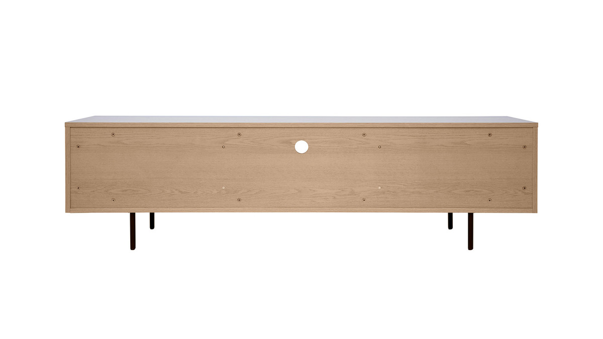 Lignes épurées et look minimaliste, voilà qui caractérisent ce joli meuble TV moderne finition bois et métal. À la fois basique et très actuel, ALASKA affiche de beaux volumes dessinés par une structure en panneaux de fibres de bois mélaminé finition chêne clair et soulignés par des pieds fins en métal noir. Si le bois clair réchauffe l'ambiance de son blond lumineux, le piètement aérien apporte de la légèreté à la silhouette et une touche de modernité à l'ensemble.