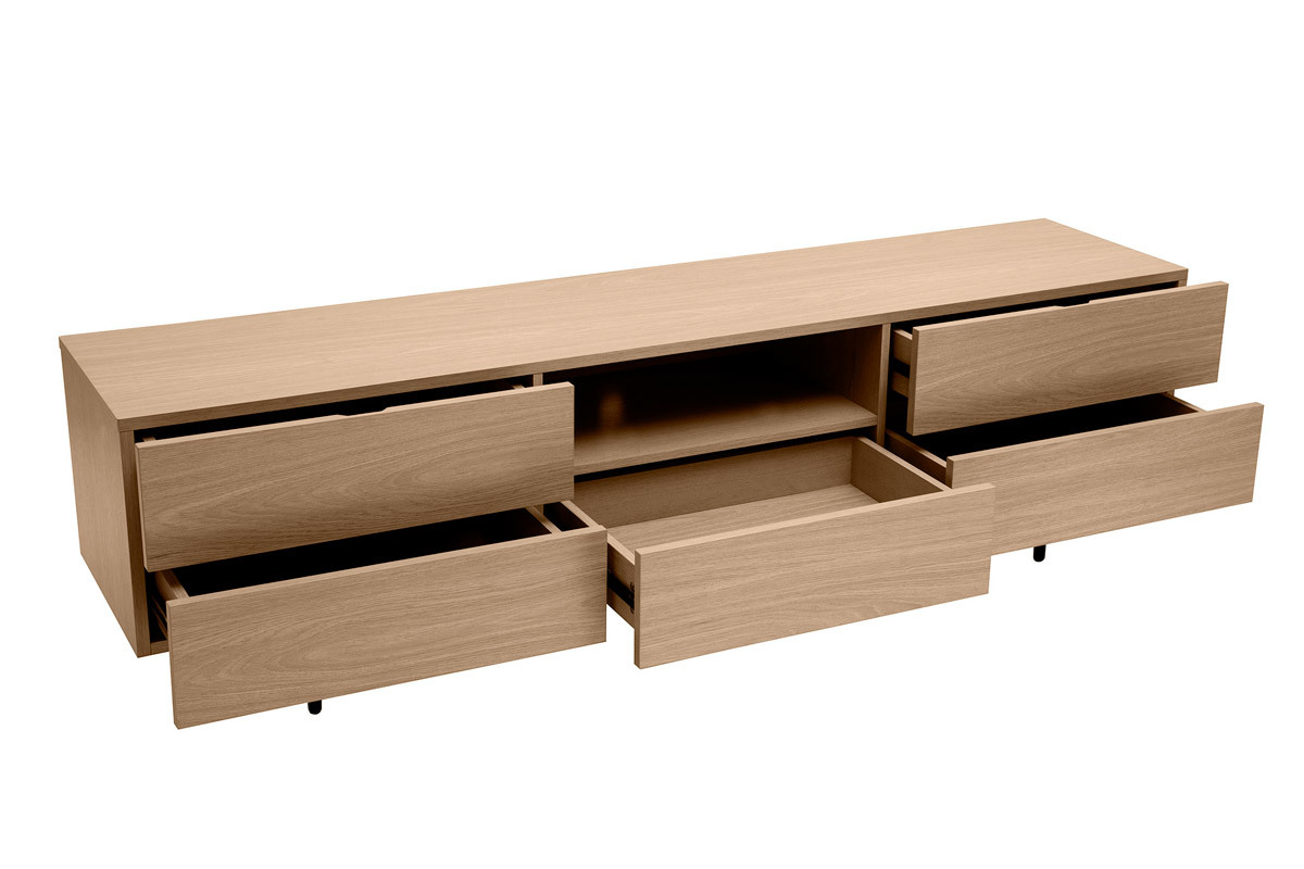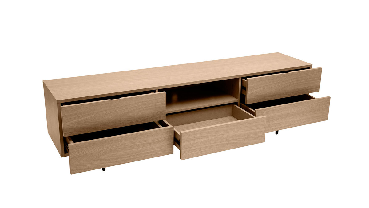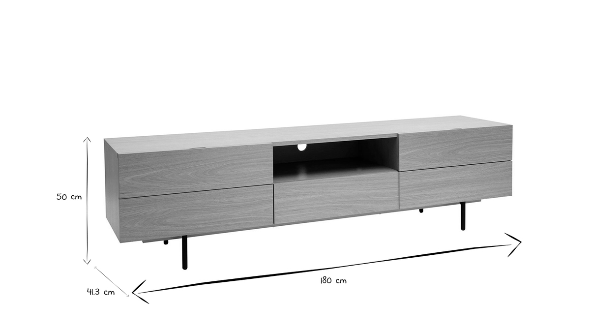 Pour organiser votre coin télé, ce grand meuble TV finition bois et métal noir (dimensions totales L180 x P41.3 x H50 cm) se compose de 5 tiroirs (L51.7 x P33.4 x H8.4 cm) pour ranger des magazines, télécommandes, câbles, et autres objets électroniques, et 1 niche (L58.5 x P37.5 x H15.5 cm) équipée d'un passe-câble - pratique pour placer un appareil numérique, une box internet, ou une console de jeu vidéo. Robuste, le résistant plateau de ce meuble TV bas accueillera volontiers un téléviseur ou laissera champ libre à un joli vase et vos objets déco favoris si votre écran plat est fixé au mur. Voilà un banc TV moderne avec rangements fermés et ouverts parfait pour faire place nette dans votre pièce de vie !