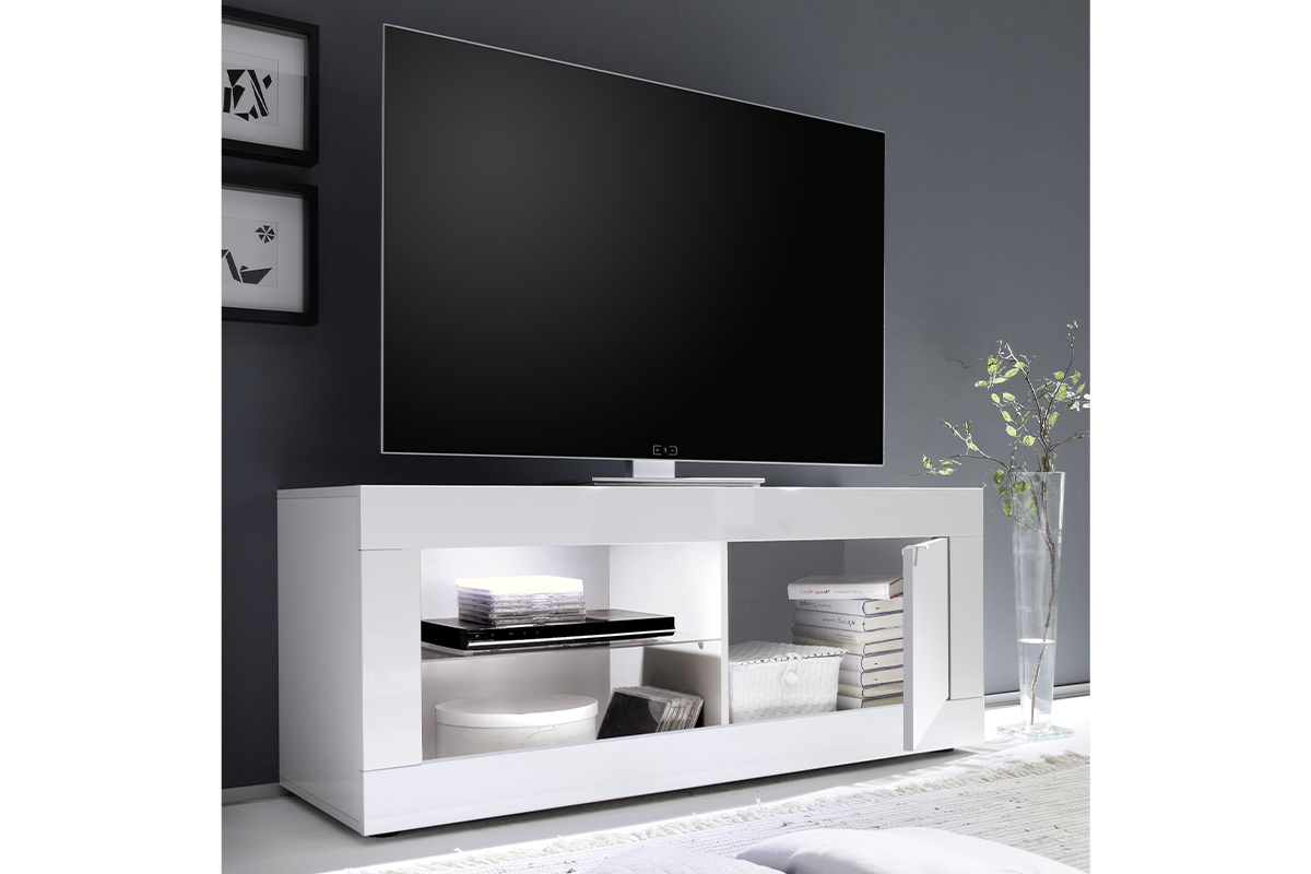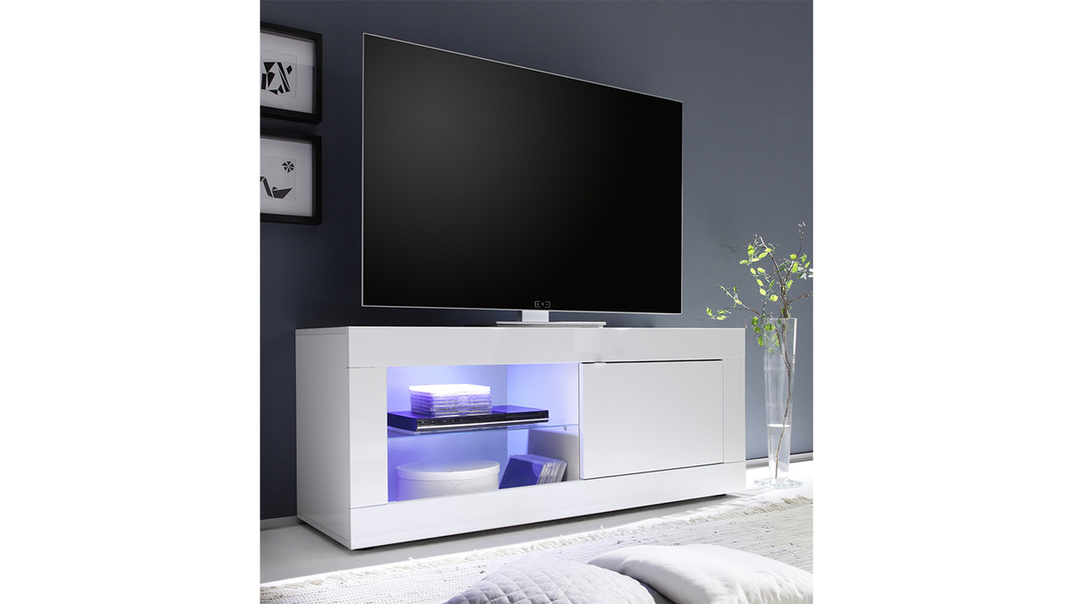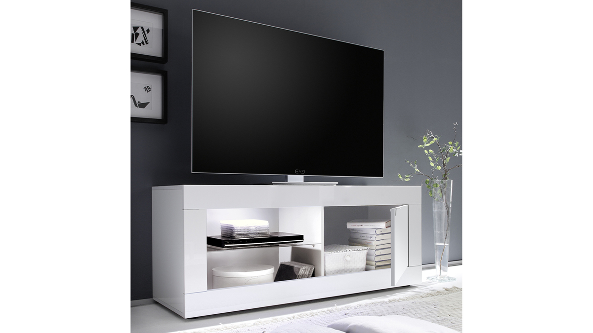 Ce meuble TV moderne et élégant est fabriqué en Italie à partir de panneaux de particules de bois. Grâce à ses dimensions (L140 x P42 x H56 cm), LATTE convient à tous les espaces, même les plus exigus. Ses deux niches ouvertes avec passe-câble permettent d'installer aisément une box internet et une console de jeux. Il est également muni d'un rangement fermé pour organiser toutes les affaires du quotidien.