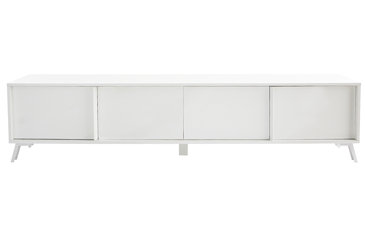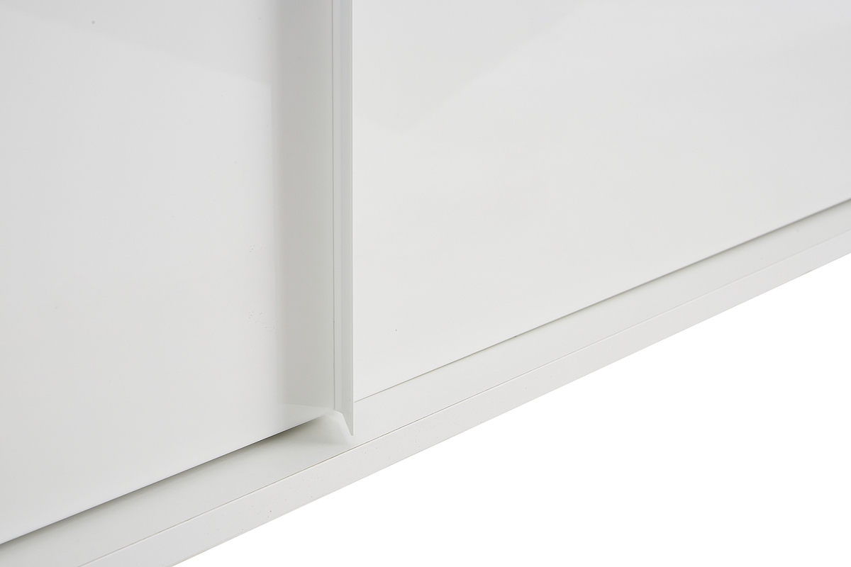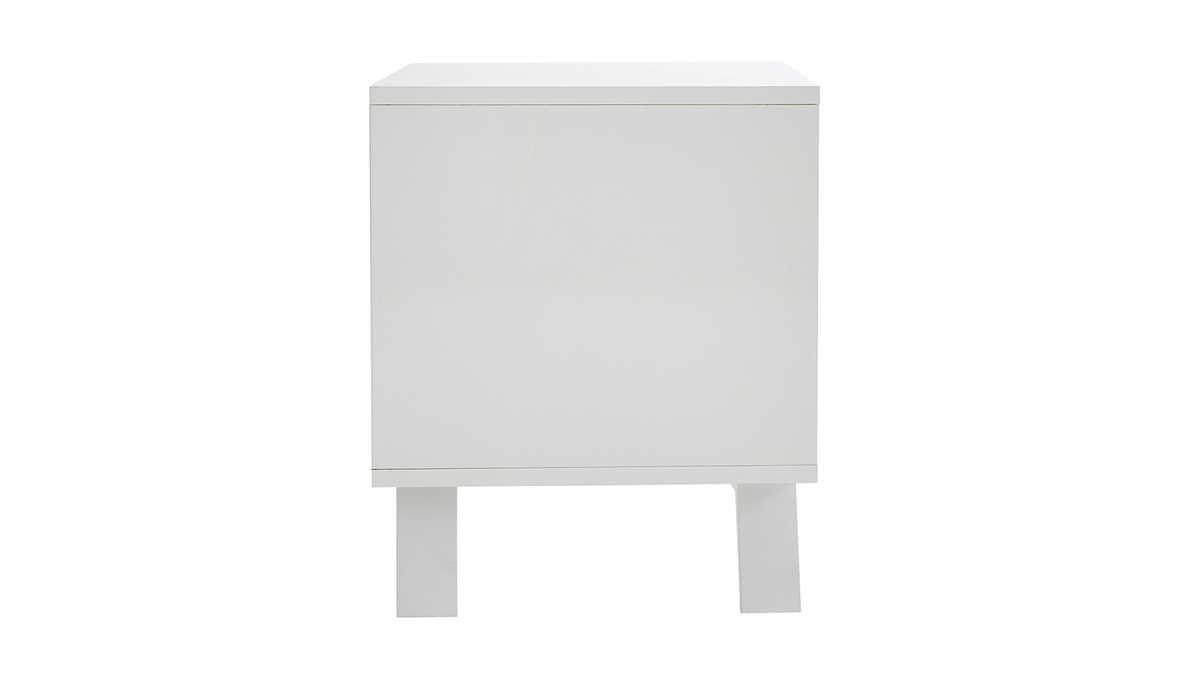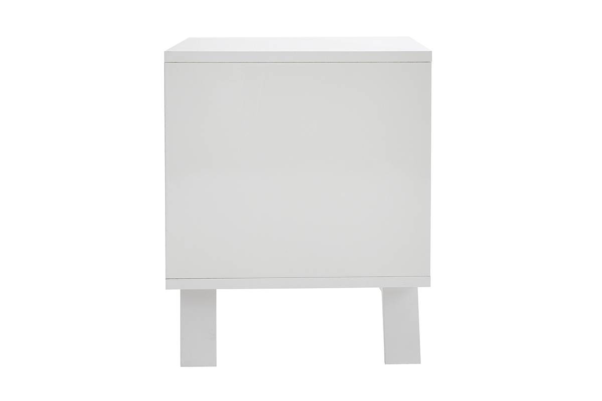 Matières : fond du caisson en panneaux de fibres de bois naturel, portes - plateau et faces latérales en panneaux de fibres de bois mélaminé finition blanc brillant, poignées en métal, pieds en plastique