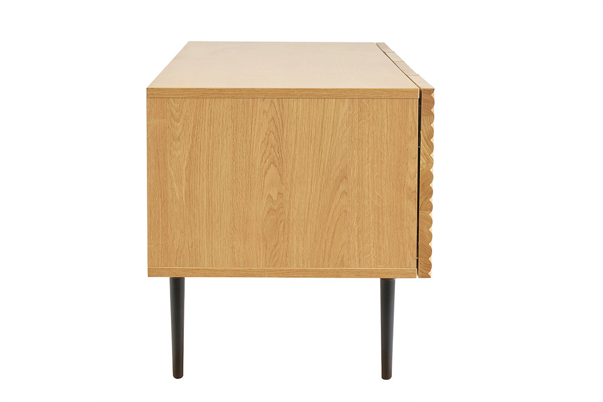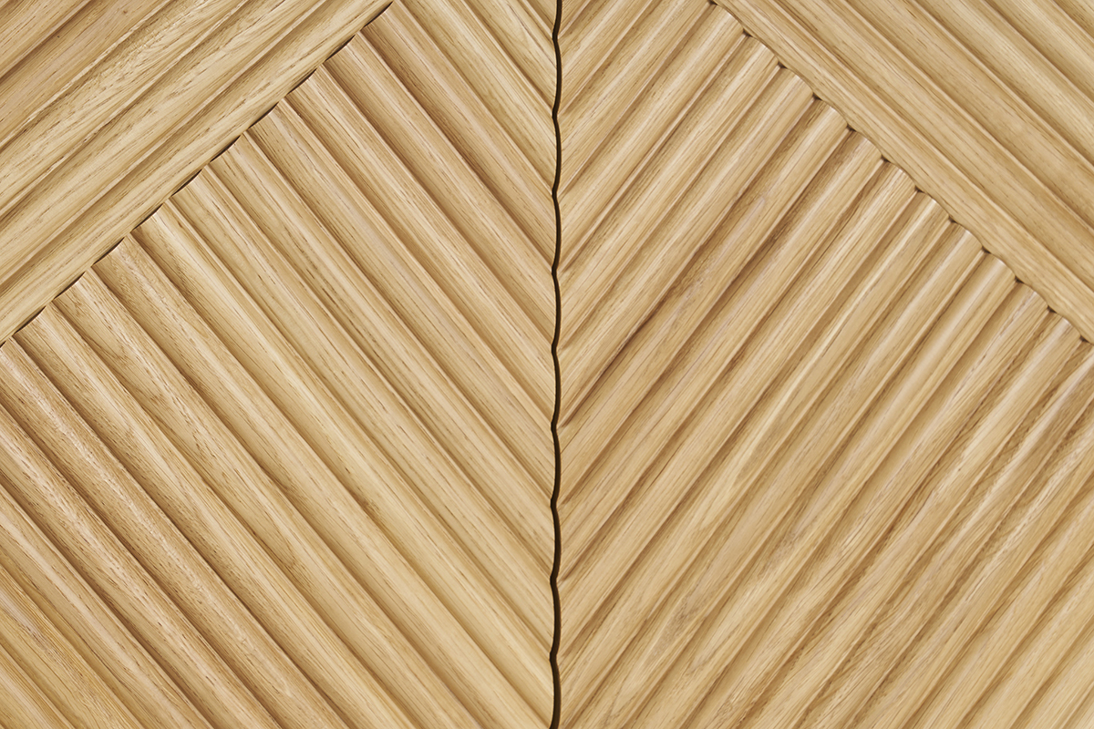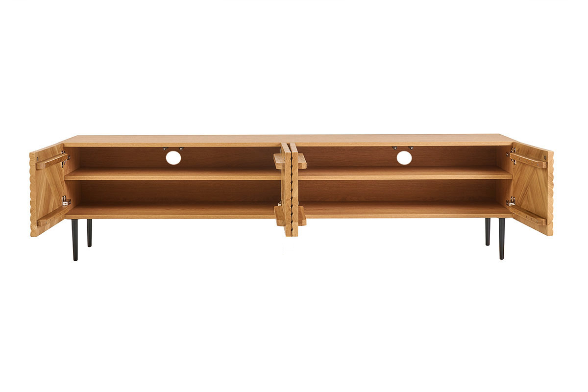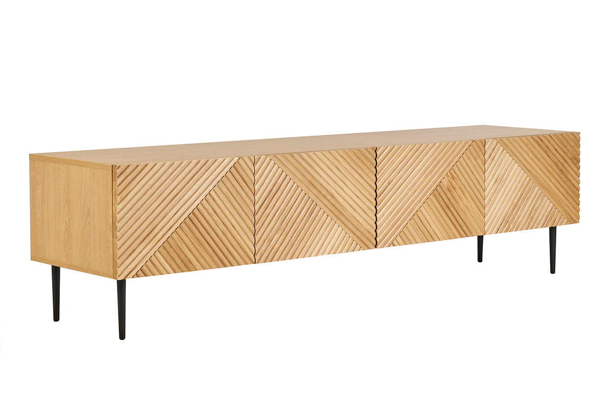 Le meuble TV ARCHIPEL séduit par son esthétique contemporaine et son allure singulière. Conçu en bois clair, il met à l’honneur la beauté des matériaux grâce à un travail du bois minutieux. Les façades sculptées arborent un motif en chevron, apportant un effet graphique saisissant et une réelle originalité. Cette finition géométrique confère du relief et du caractère à ce meuble bas tout en conservant une élégance sobre, facile à intégrer dans tous les styles d’intérieur, du plus minimaliste au plus éclectique.