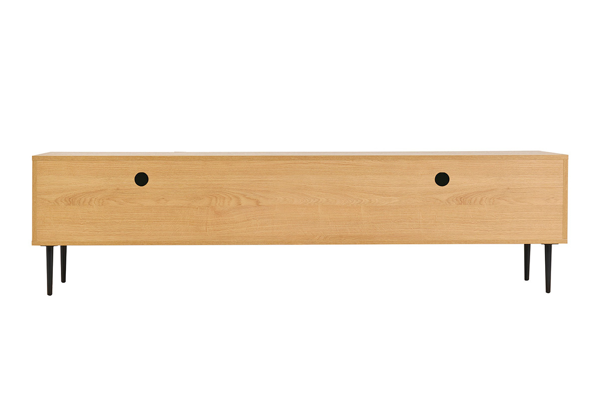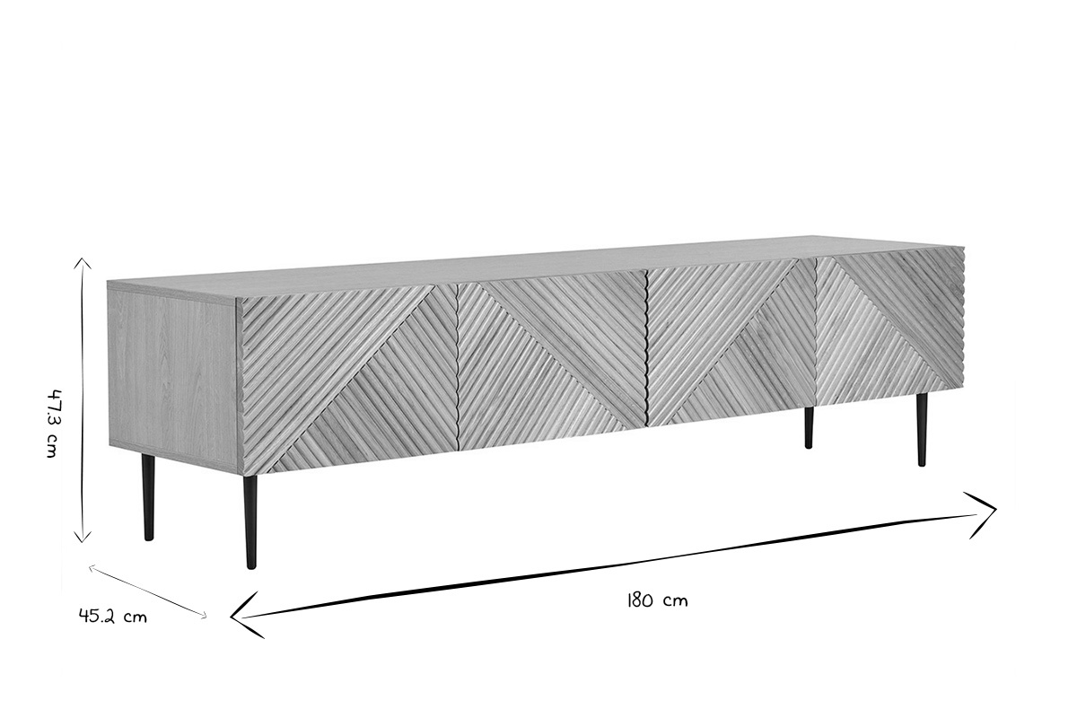 Avec ses 180 cm de longueur, ce meuble TV en bois offre une grande capacité de rangement. Il est équipé de quatre portes qui dissimulent des étagères spacieuses, idéales pour organiser vos équipements multimédia, consoles de jeux, box internet ou encore DVD et accessoires. Le design sans poignées accentue la pureté de ses lignes, tout en facilitant l’ouverture par simple pression. Son piètement en métal noir ajoute une touche de légèreté et d’élégance, tout en assurant stabilité et solidité.
