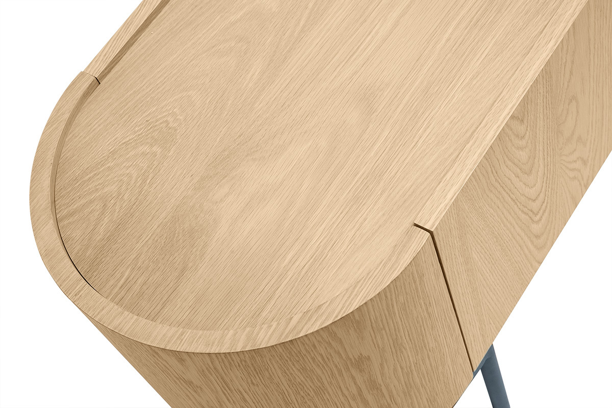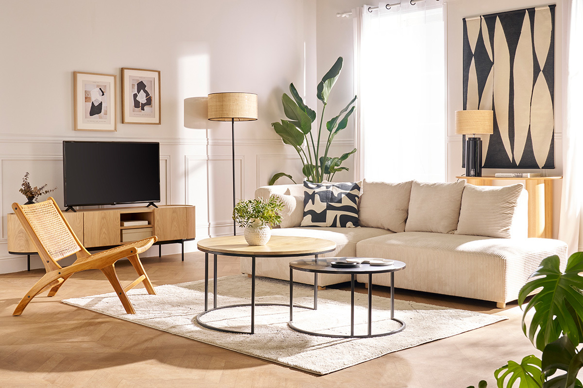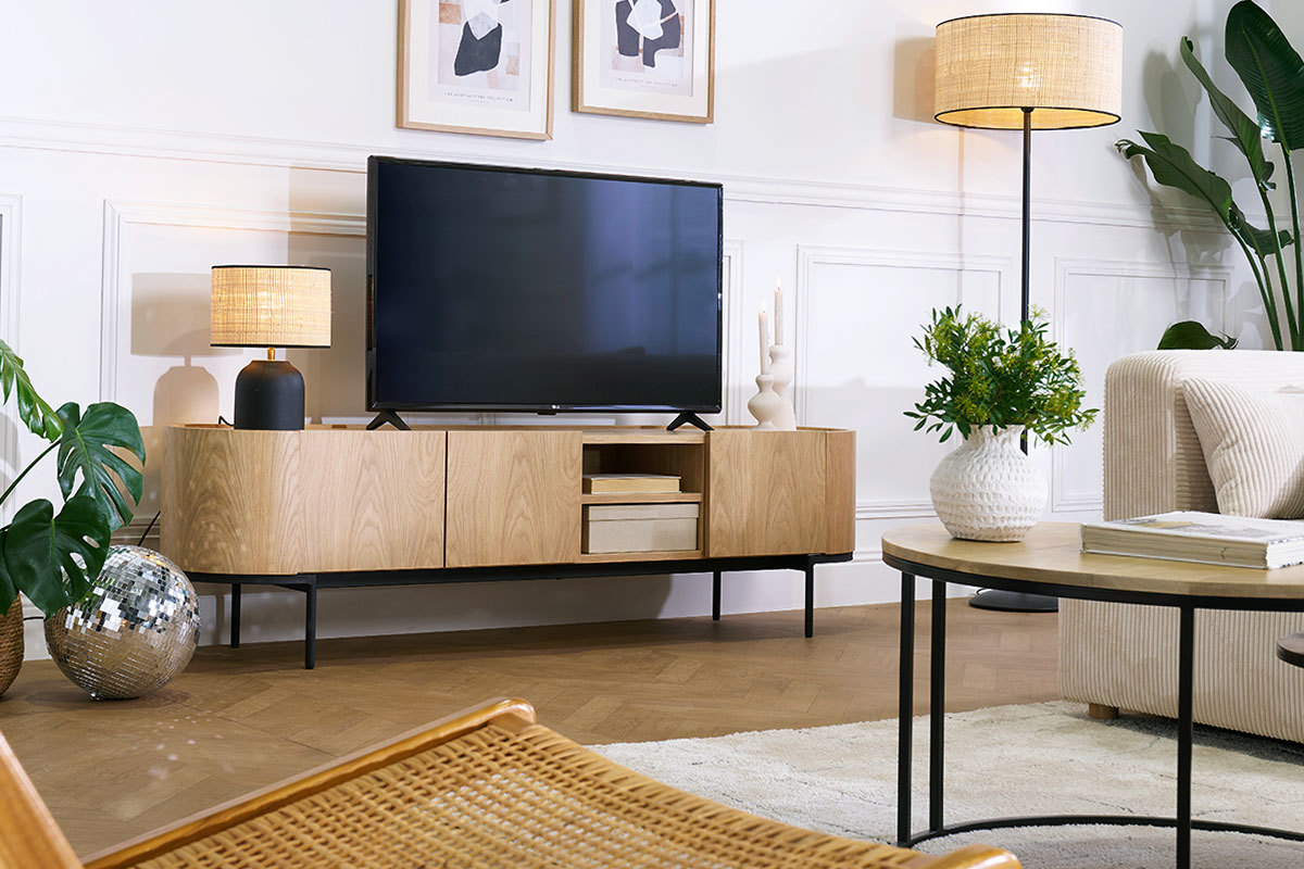 Contemporain par ses lignes minimalistes, vintage par sa couleur bois clair et ses angles arrondis, SKYE en connaît un rayon en matière de style. Prêt à donner de la personnalité au salon, on adore la manière par laquelle ce meuble TV design en bois et métal croise l'élégance des pièces déco modernes à l'authenticité des meubles rétro.
