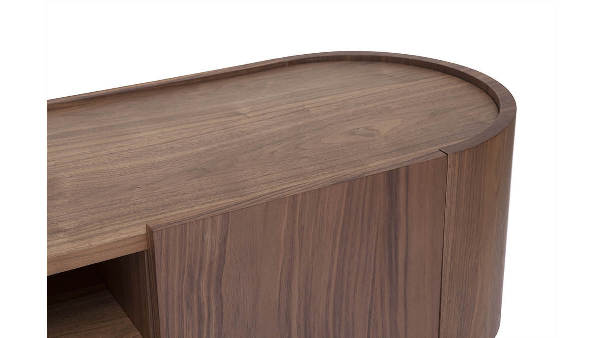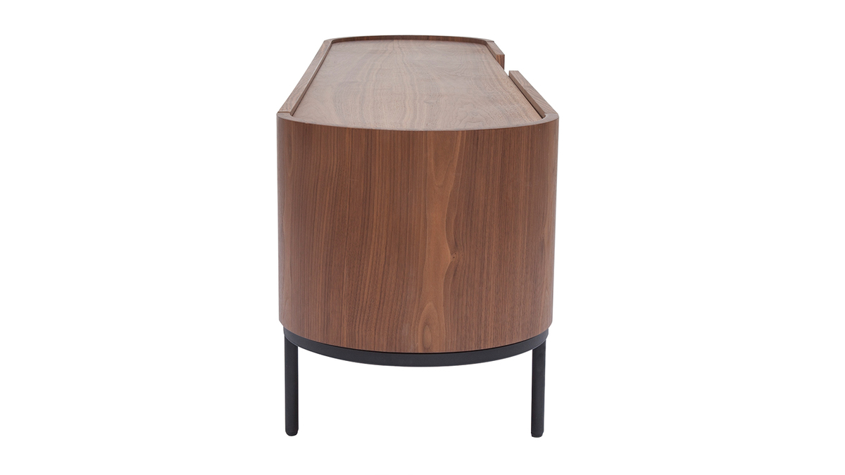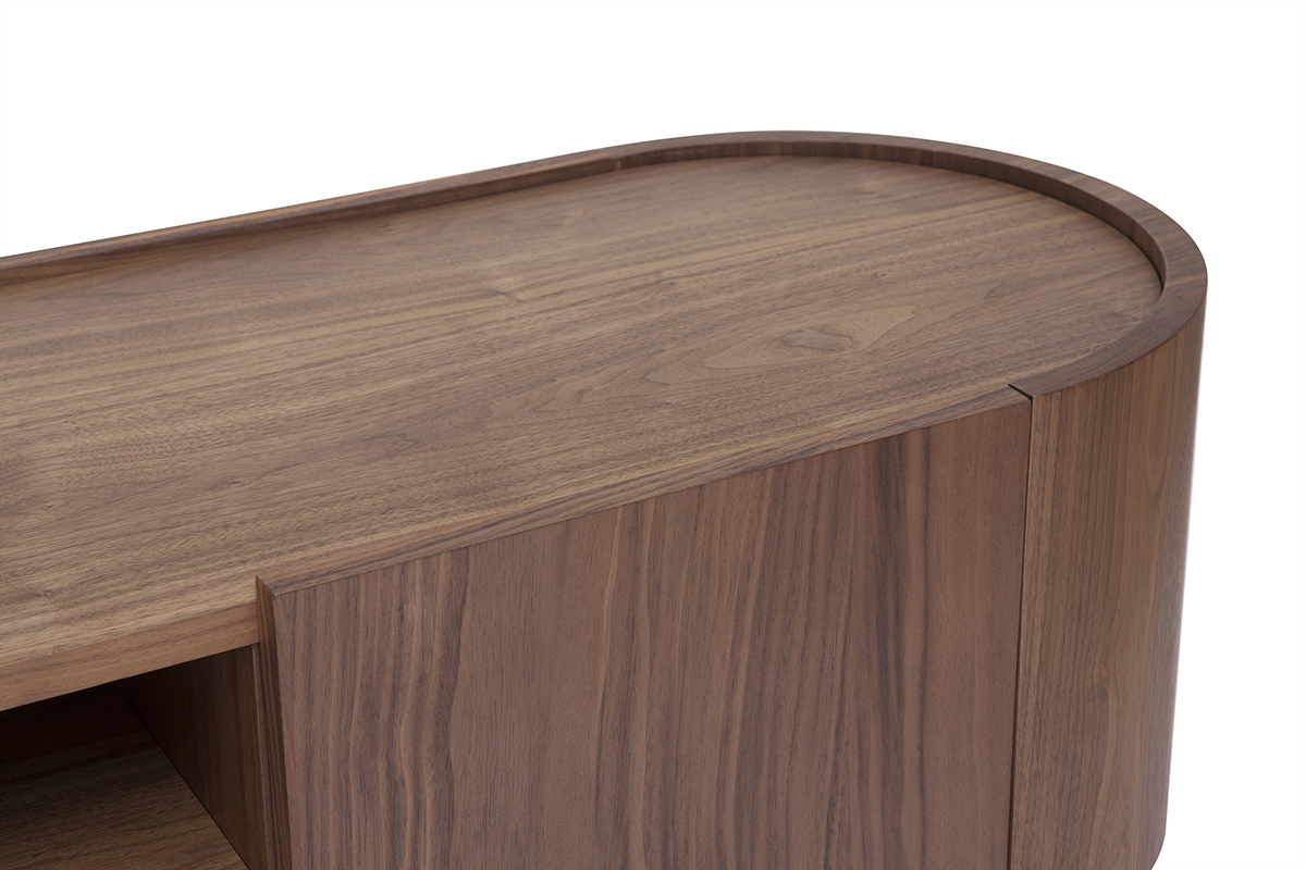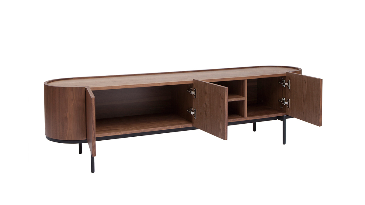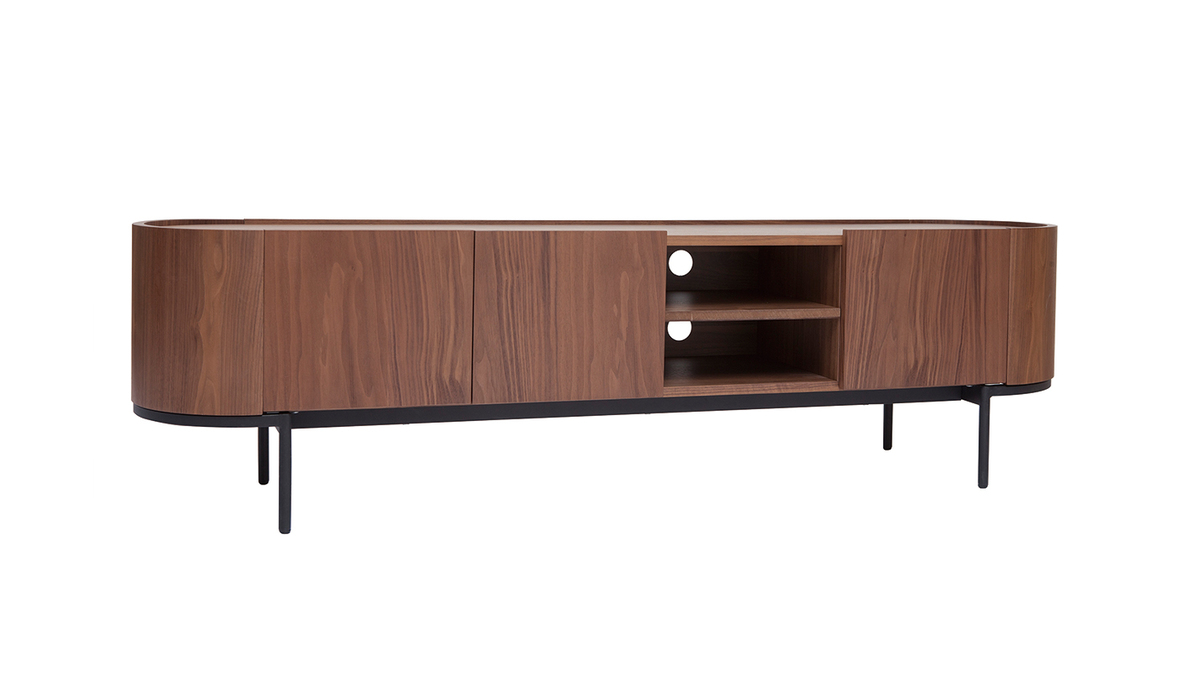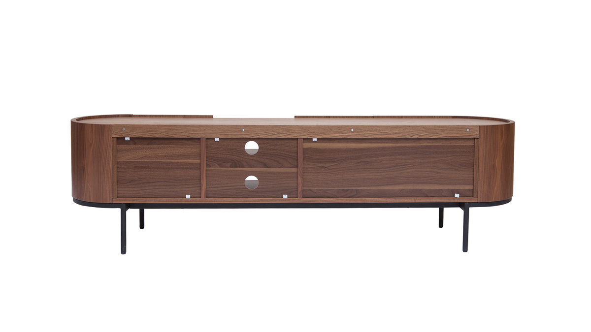 Contemporain par ses lignes minimalistes, vintage par sa couleur bois foncé et ses angles arrondis, SKYE en connaît un rayon en matière de style. Prêt à donner de la personnalité au salon, on adore la manière par laquelle ce meuble TV design en bois et métal croise l'élégance des pièces déco modernes à l'authenticité des meubles rétro.