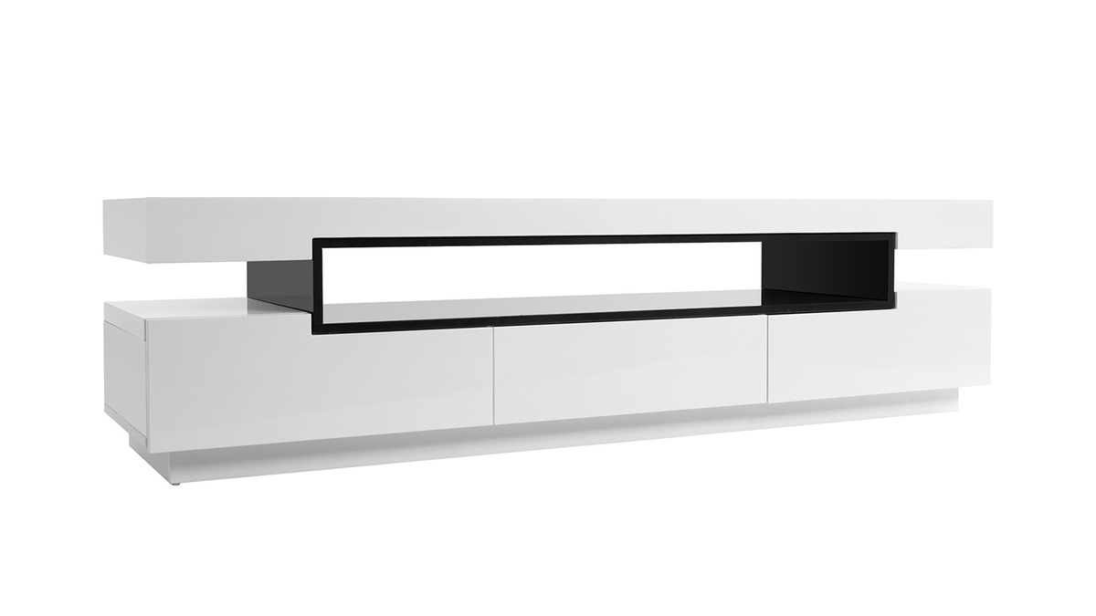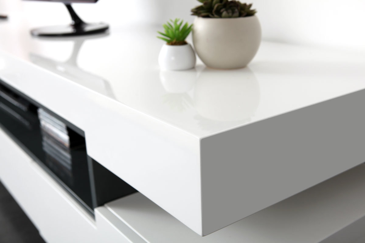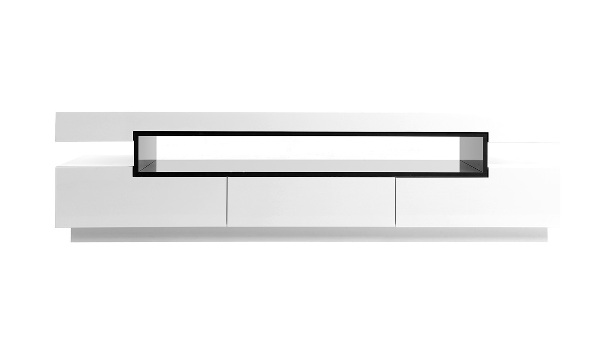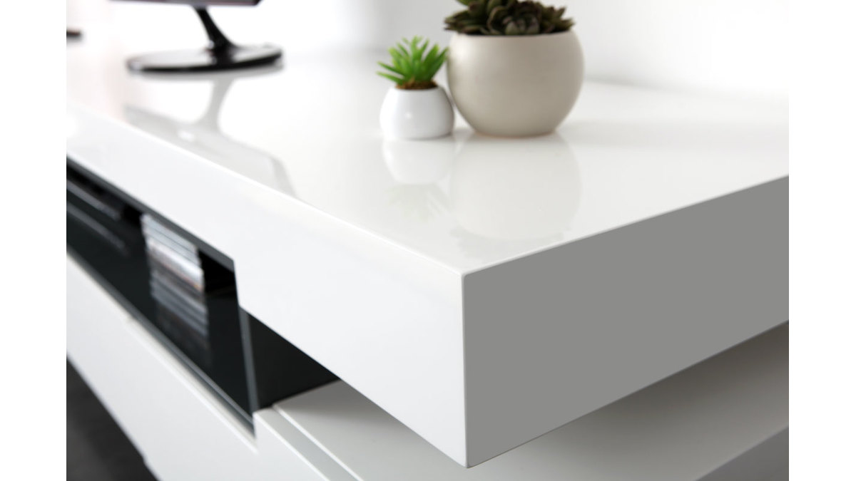 Sa ligne épurée, ses finitions de qualité en font un meuble TV design facile à vivre et simple d'entretien : en panneaux de fibres de bois laqué blanc sur la totalité de sa structure et noir (épaisseur 2 cm) très résistant, il nécessite tout au plus un chiffon doux légèrement humidifié pour retrouver toute sa superbe.