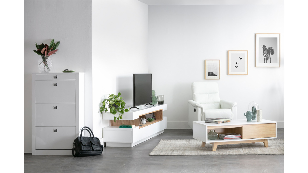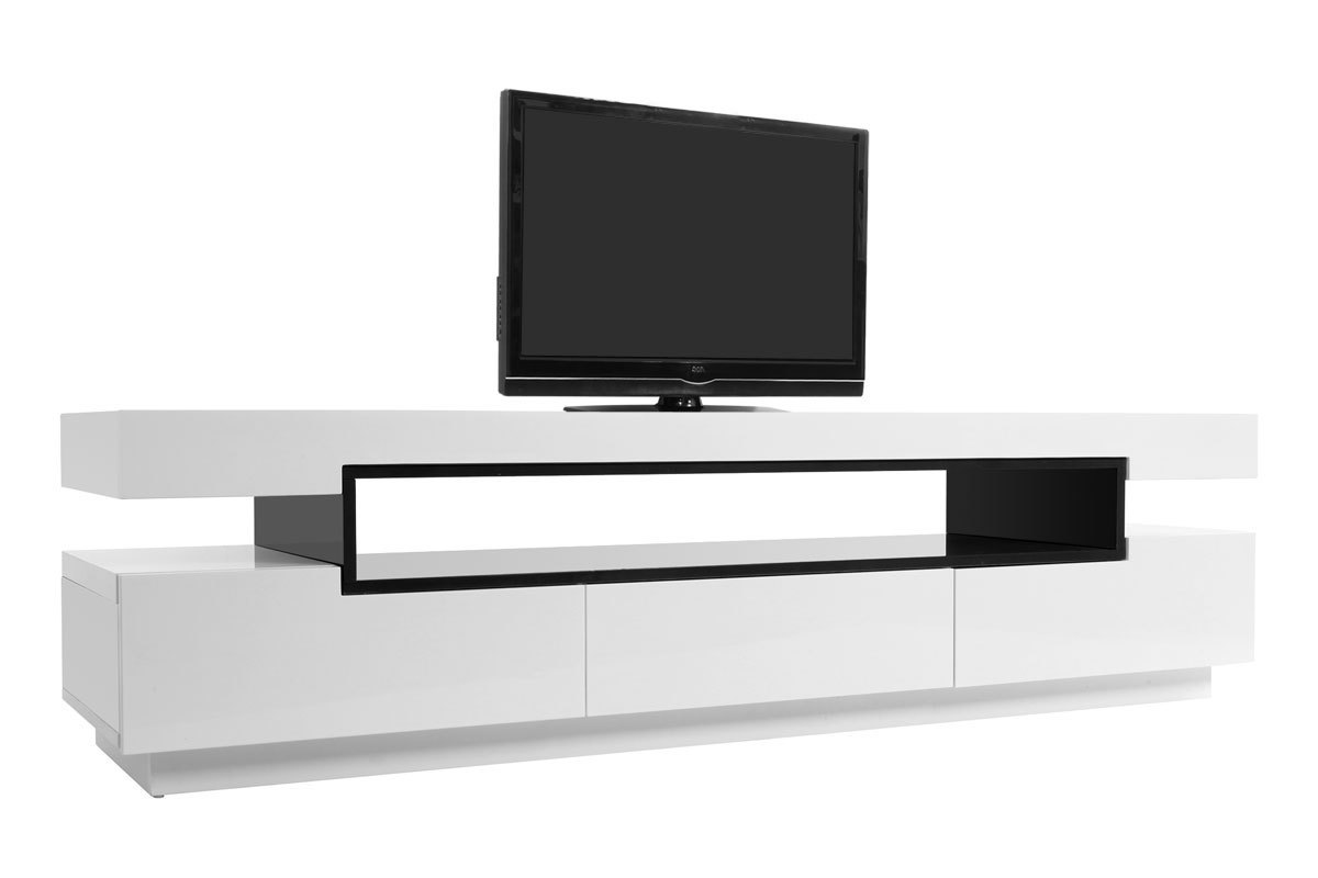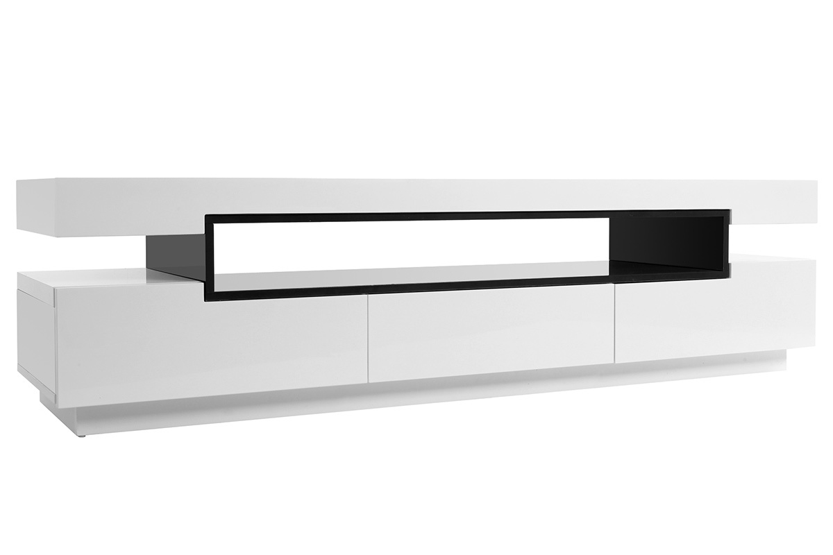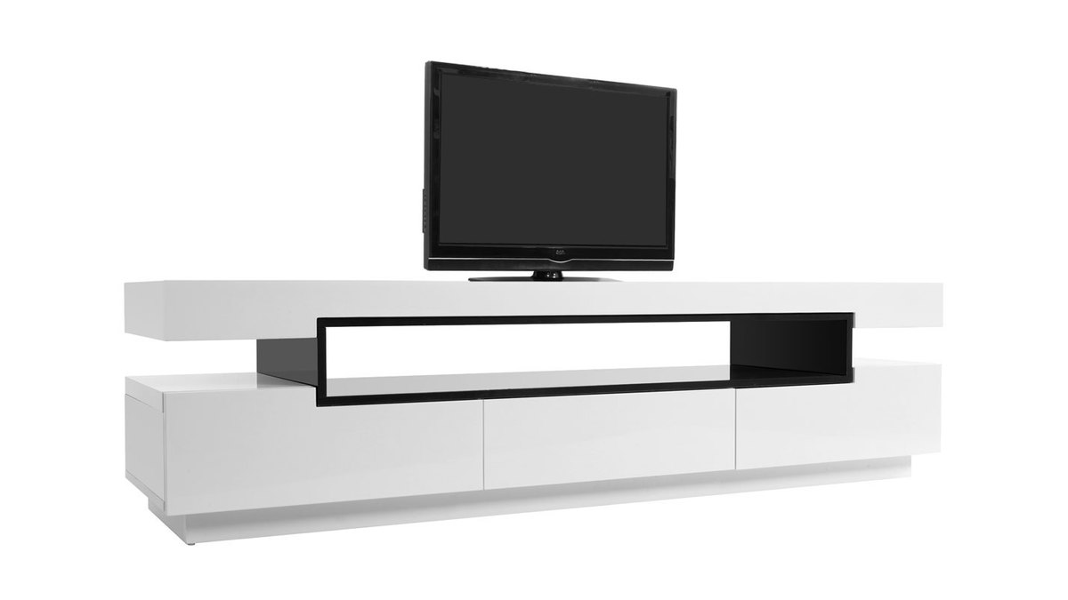 Sa ligne épurée, ses finitions de qualité en font un meuble TV design facile à vivre et simple d'entretien : en panneaux de fibres de bois laqué blanc sur la totalité de sa structure et noir (épaisseur 2 cm) très résistant, il nécessite tout au plus un chiffon doux légèrement humidifié pour retrouver toute sa superbe.